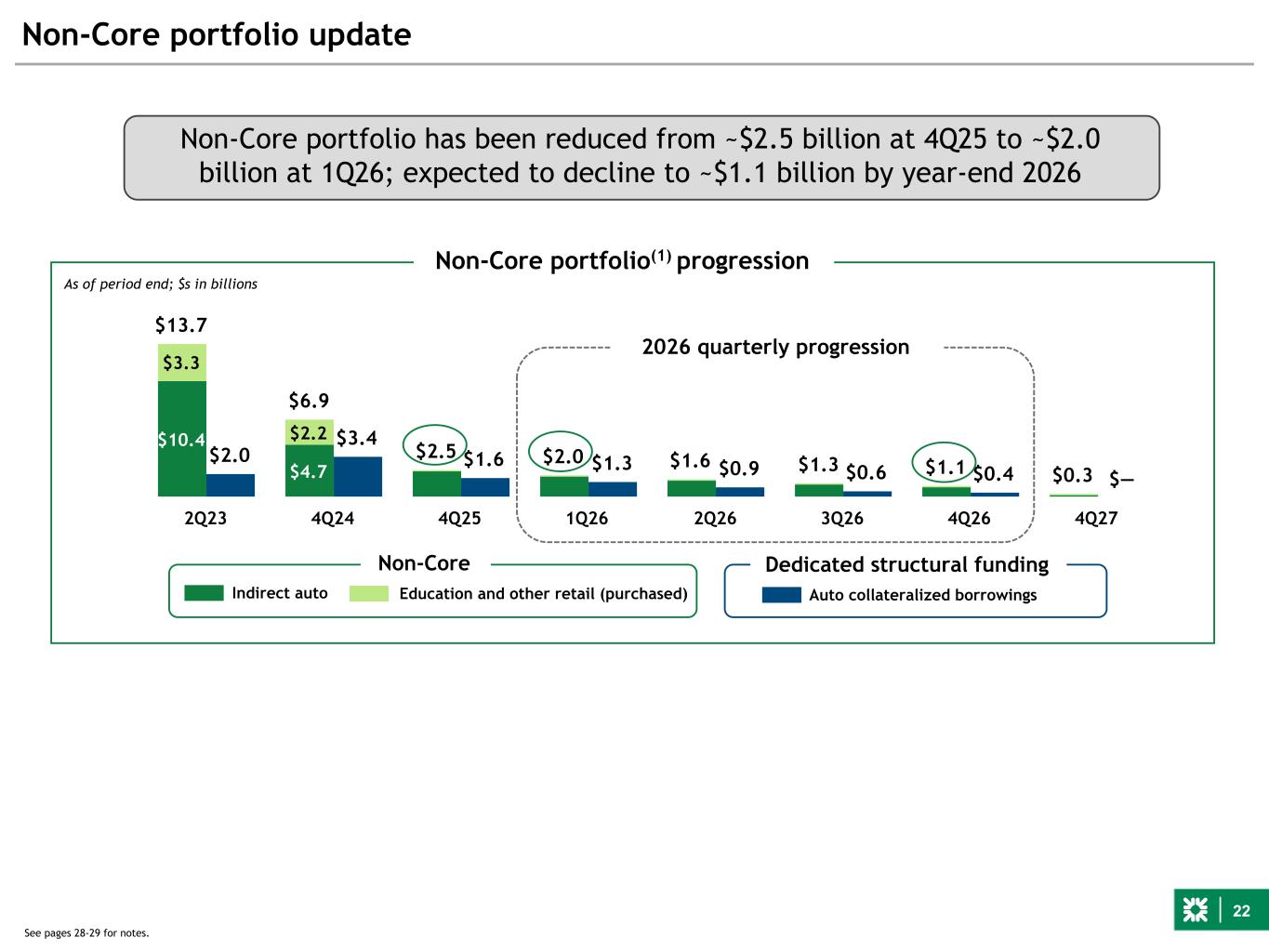 22 $13.7 $6.9 $2.5 $2.0 $1.6 $1.3 $1.1 $0.3 $2.0 $3.4 $1.6 $1.3 $0.9 $0.6 $0.4 $— $10.4 $4.7 $3.3 $2.2 2Q23 4Q24 4Q25 1Q26 2Q26 3Q26 4Q26 4Q27 Non-Core portfolio update Non-Core Dedicated structural funding Indirect auto Auto collateralized borrowings As of period end; $s in billions See pages 28-29 for notes. Non-Core portfolio(1) progression Education and other retail (purchased) Non-Core portfolio has been reduced from ~$2.5 billion at 4Q25 to ~$2.0 billion at 1Q26; expected to decline to ~$1.1 billion by year-end 2026 2026 quarterly progression
