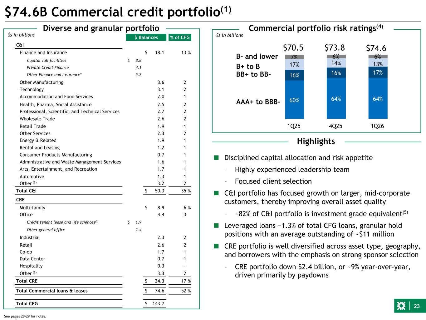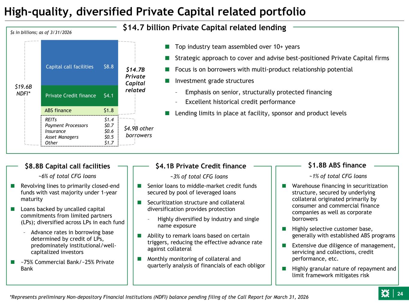 23 $74.6B Commercial credit portfolio(1) Commercial portfolio risk ratings(4) $s in billions 60% 64% 64% 16% 16% 17% 17% 14% 13% 7% 6% 6% 1Q25 4Q25 1Q26 B- and lower B+ to B BB+ to BB- AAA+ to BBB- $74.6 Highlights $73.8 $ Balances % of CFG C&I Finance and Insurance $ 18.1 13 % Capital call facilities $ 8.8 Private Credit Finance 4.1 Other Finance and Insurance* 5.2 Other Manufacturing 3.6 2 Technology 3.1 2 Accommodation and Food Services 2.0 1 Health, Pharma, Social Assistance 2.5 2 Professional, Scientific, and Technical Services 2.7 2 Wholesale Trade 2.6 2 Retail Trade 1.9 1 Other Services 2.3 2 Energy & Related 1.9 1 Rental and Leasing 1.2 1 Consumer Products Manufacturing 0.7 1 Administrative and Waste Management Services 1.6 1 Arts, Entertainment, and Recreation 1.7 1 Automotive 1.3 1 Other (2) 3.2 2 Total C&I $ 50.3 35 % CRE Multi-family $ 8.9 6 % Office 4.4 3 Credit tenant lease and life sciences(3) $ 1.9 Other general office 2.4 Industrial 2.3 2 Retail 2.6 2 Co-op 1.7 1 Data Center 0.7 1 Hospitality 0.3 — Other (2) 3.3 2 Total CRE $ 24.3 17 % Total Commercial loans & leases $ 74.6 52 % Total CFG $ 143.7 Diverse and granular portfolio ■ Disciplined capital allocation and risk appetite – Highly experienced leadership team – Focused client selection ■ C&I portfolio has focused growth on larger, mid-corporate customers, thereby improving overall asset quality – ~82% of C&I portfolio is investment grade equivalent(5) ■ Leveraged loans ~1.3% of total CFG loans, granular hold positions with an average outstanding of ~$11 million ■ CRE portfolio is well diversified across asset type, geography, and borrowers with the emphasis on strong sponsor selection – CRE portfolio down $2.4 billion, or ~9% year-over-year, driven primarily by paydowns $70.5 See pages 28-29 for notes. $s in billions
