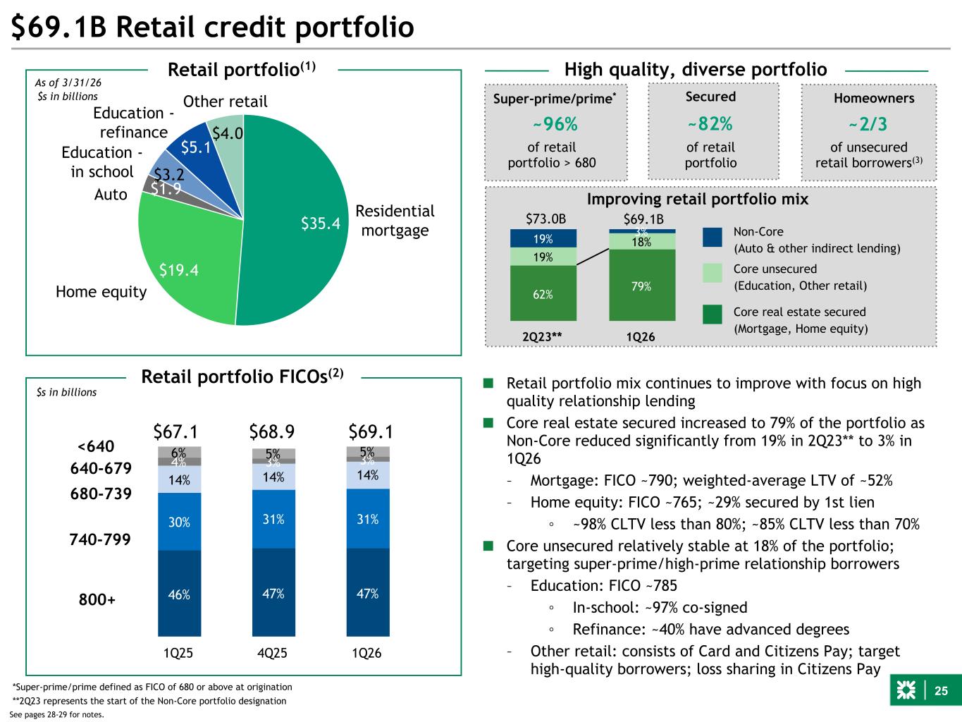 25 46% 47% 47% 30% 31% 31% 14% 14% 14% 4% 3% 3%6% 5% 5% 1Q25 4Q25 1Q26 $35.4 $19.4 $1.9 $3.2 $5.1 $4.0 $69.1B Retail credit portfolio 800+ 740-799 680-739 640-679 <640 $69.1 $s in billions $68.9 Home equity Retail portfolio(1) Residential mortgage Auto Education - in school Education - refinance Other retail ~96% Super-prime/prime* ~82% Secured ■ Retail portfolio mix continues to improve with focus on high quality relationship lending ■ Core real estate secured increased to 79% of the portfolio as Non-Core reduced significantly from 19% in 2Q23** to 3% in 1Q26 – Mortgage: FICO ~790; weighted-average LTV of ~52% – Home equity: FICO ~765; ~29% secured by 1st lien ◦ ~98% CLTV less than 80%; ~85% CLTV less than 70% ■ Core unsecured relatively stable at 18% of the portfolio; targeting super-prime/high-prime relationship borrowers – Education: FICO ~785 ◦ In-school: ~97% co-signed ◦ Refinance: ~40% have advanced degrees – Other retail: consists of Card and Citizens Pay; target high-quality borrowers; loss sharing in Citizens Pay High quality, diverse portfolio *Super-prime/prime defined as FICO of 680 or above at origination Retail portfolio FICOs(2) $67.1 Homeowners ~2/3 See pages 28-29 for notes. As of 3/31/26 62% 79% 19% 18%19% 3% 2Q23** 1Q26 Non-Core (Auto & other indirect lending) Core unsecured (Education, Other retail) Core real estate secured (Mortgage, Home equity) of unsecured retail borrowers(3) of retail portfolio > 680 Improving retail portfolio mix of retail portfolio **2Q23 represents the start of the Non-Core portfolio designation $69.1B$73.0B $s in billions To discuss: provide LTV stratification of 1st mortgages in light of B3E?
