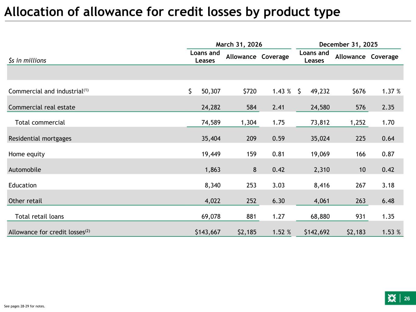 26 Allocation of allowance for credit losses by product type March 31, 2026 December 31, 2025 $s in millions Loans and Leases Allowance Coverage Loans and Leases Allowance Coverage Commercial and industrial(1) $ 50,307 $720 1.43 % $ 49,232 $676 1.37 % Commercial real estate 24,282 584 2.41 24,580 576 2.35 Total commercial 74,589 1,304 1.75 73,812 1,252 1.70 Residential mortgages 35,404 209 0.59 35,024 225 0.64 Home equity 19,449 159 0.81 19,069 166 0.87 Automobile 1,863 8 0.42 2,310 10 0.42 Education 8,340 253 3.03 8,416 267 3.18 Other retail 4,022 252 6.30 4,061 263 6.48 Total retail loans 69,078 881 1.27 68,880 931 1.35 Allowance for credit losses(2) $143,667 $2,185 1.52 % $142,692 $2,183 1.53 % See pages 28-29 for notes.