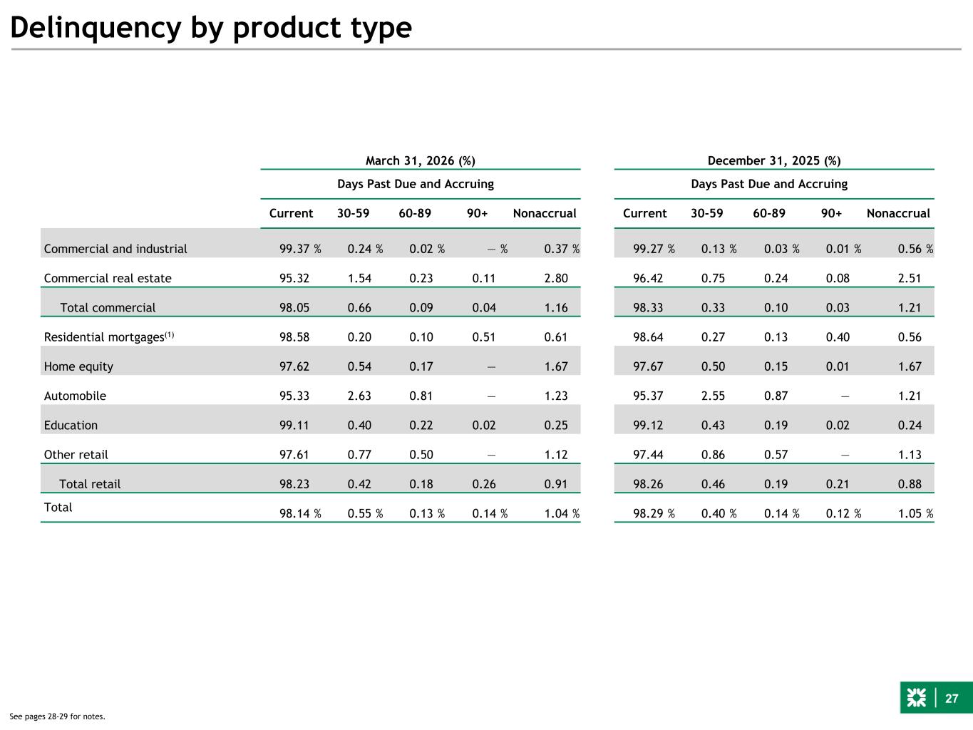 27 Delinquency by product type March 31, 2026 (%) December 31, 2025 (%) Days Past Due and Accruing Days Past Due and Accruing Current 30-59 60-89 90+ Nonaccrual Current 30-59 60-89 90+ Nonaccrual Commercial and industrial 99.37 % 0.24 % 0.02 % — % 0.37 % 99.27 % 0.13 % 0.03 % 0.01 % 0.56 % Commercial real estate 95.32 1.54 0.23 0.11 2.80 96.42 0.75 0.24 0.08 2.51 Total commercial 98.05 0.66 0.09 0.04 1.16 98.33 0.33 0.10 0.03 1.21 Residential mortgages(1) 98.58 0.20 0.10 0.51 0.61 98.64 0.27 0.13 0.40 0.56 Home equity 97.62 0.54 0.17 — 1.67 97.67 0.50 0.15 0.01 1.67 Automobile 95.33 2.63 0.81 — 1.23 95.37 2.55 0.87 — 1.21 Education 99.11 0.40 0.22 0.02 0.25 99.12 0.43 0.19 0.02 0.24 Other retail 97.61 0.77 0.50 — 1.12 97.44 0.86 0.57 — 1.13 Total retail 98.23 0.42 0.18 0.26 0.91 98.26 0.46 0.19 0.21 0.88 Total 98.14 % 0.55 % 0.13 % 0.14 % 1.04 % 98.29 % 0.40 % 0.14 % 0.12 % 1.05 % See pages 28-29 for notes.