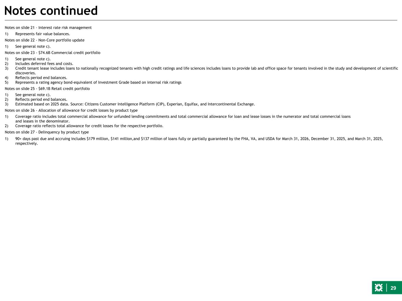 29 Notes continued Notes on slide 21 - Interest rate risk management 1) Represents fair value balances. Notes on slide 22 - Non-Core portfolio update 1) See general note c). Notes on slide 23 - $74.6B Commercial credit portfolio 1) See general note c). 2) Includes deferred fees and costs. 3) Credit tenant lease includes loans to nationally recognized tenants with high credit ratings and life sciences includes loans to provide lab and office space for tenants involved in the study and development of scientific discoveries. 4) Reflects period end balances. 5) Represents a rating agency bond-equivalent of Investment Grade based on internal risk ratings Notes on slide 25 - $69.1B Retail credit portfolio 1) See general note c). 2) Reflects period end balances. 3) Estimated based on 2025 data. Source: Citizens Customer Intelligence Platform (CIP), Experian, Equifax, and Intercontinental Exchange. Notes on slide 26 - Allocation of allowance for credit losses by product type 1) Coverage ratio includes total commercial allowance for unfunded lending commitments and total commercial allowance for loan and lease losses in the numerator and total commercial loans and leases in the denominator. 2) Coverage ratio reflects total allowance for credit losses for the respective portfolio. Notes on slide 27 - Delinquency by product type 1) 90+ days past due and accruing includes $179 million, $141 million,and $137 million of loans fully or partially guaranteed by the FHA, VA, and USDA for March 31, 2026, December 31, 2025, and March 31, 2025, respectively.