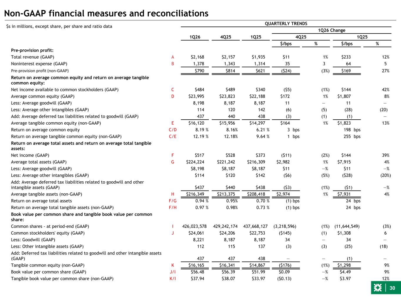 30 Non-GAAP financial measures and reconciliations $s in millions, except share, per share and ratio data QUARTERLY TRENDS 1Q26 Change 1Q26 4Q25 1Q25 4Q25 1Q25 $/bps % $/bps % Pre-provision profit: Total revenue (GAAP) A $2,168 $2,157 $1,935 $11 1% $233 12% Noninterest expense (GAAP) B 1,378 1,343 1,314 35 3 64 5 Pre-provision profit (non-GAAP) $790 $814 $621 ($24) (3%) $169 27% Return on average common equity and return on average tangible common equity: Net income available to common stockholders (GAAP) C $484 $489 $340 ($5) (1%) $144 42% Average common equity (GAAP) D $23,995 $23,823 $22,188 $172 1% $1,807 8% Less: Average goodwill (GAAP) 8,198 8,187 8,187 11 — 11 — Less: Average other intangibles (GAAP) 114 120 142 (6) (5) (28) (20) Add: Average deferred tax liabilities related to goodwill (GAAP) 437 440 438 (3) (1) (1) — Average tangible common equity (non-GAAP) E $16,120 $15,956 $14,297 $164 1% $1,823 13% Return on average common equity C/D 8.19 % 8.16% 6.21 % 3 bps 198 bps Return on average tangible common equity (non-GAAP) C/E 12.19 % 12.18% 9.64 % 1 bps 255 bps Return on average total assets and return on average total tangible assets: Net income (GAAP) F $517 $528 $373 ($11) (2%) $144 39% Average total assets (GAAP) G $224,224 $221,242 $216,309 $2,982 1% $7,915 4% Less: Average goodwill (GAAP) $8,198 $8,187 $8,187 $11 —% $11 —% Less: Average other intangibles (GAAP) $114 $120 $142 ($6) (5%) ($28) (20%) Add: Average deferred tax liabilities related to goodwill and other intangible assets (GAAP) $437 $440 $438 ($3) (1%) ($1) —% Average tangible assets (non-GAAP) H $216,349 $213,375 $208,418 $2,974 1% $7,931 4% Return on average total assets F/G 0.94 % 0.95% 0.70 % (1) bps 24 bps Return on average total tangible assets (non-GAAP) F/H 0.97 % 0.98% 0.73 % (1) bps 24 bps Book value per common share and tangible book value per common share: Common shares - at period-end (GAAP) I 426,023,578 429,242,174 437,668,127 (3,218,596) (1%) (11,644,549) (3%) Common stockholders' equity (GAAP) J $24,061 $24,206 $22,753 ($145) (1) $1,308 6 Less: Goodwill (GAAP) 8,221 8,187 8,187 34 — 34 — Less: Other intangible assets (GAAP) 112 115 137 (3) (3) (25) (18) Add: Deferred tax liabilities related to goodwill and other intangible assets (GAAP) 437 437 438 — — (1) — Tangible common equity (non-GAAP) K $16,165 $16,341 $14,867 ($176) (1%) $1,298 9% Book value per common share (GAAP) J/I $56.48 $56.39 $51.99 $0.09 —% $4.49 9% Tangible book value per common share (non-GAAP) K/I $37.94 $38.07 $33.97 ($0.13) —% $3.97 12%