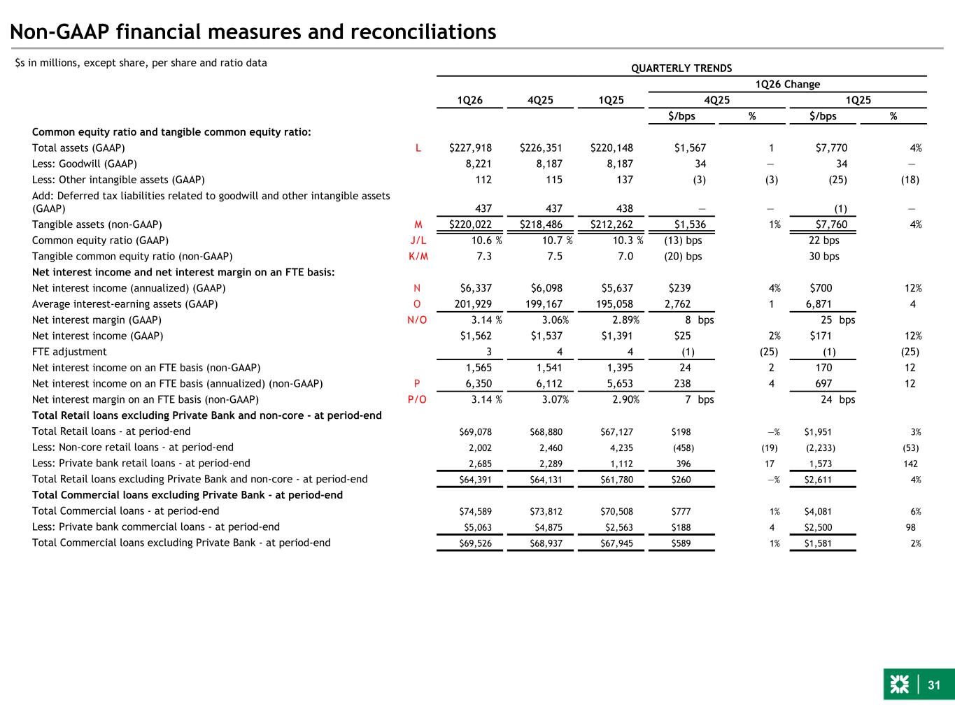 31 Non-GAAP financial measures and reconciliations QUARTERLY TRENDS 1Q26 Change 1Q26 4Q25 1Q25 4Q25 1Q25 $/bps % $/bps % Common equity ratio and tangible common equity ratio: Total assets (GAAP) L $227,918 $226,351 $220,148 $1,567 1 $7,770 4% Less: Goodwill (GAAP) 8,221 8,187 8,187 34 — 34 — Less: Other intangible assets (GAAP) 112 115 137 (3) (3) (25) (18) Add: Deferred tax liabilities related to goodwill and other intangible assets (GAAP) 437 437 438 — — (1) — Tangible assets (non-GAAP) M $220,022 $218,486 $212,262 $1,536 1% $7,760 4% Common equity ratio (GAAP) J/L 10.6 % 10.7 % 10.3 % (13) bps 22 bps Tangible common equity ratio (non-GAAP) K/M 7.3 7.5 7.0 (20) bps 30 bps Net interest income and net interest margin on an FTE basis: Net interest income (annualized) (GAAP) N $6,337 $6,098 $5,637 $239 4% $700 12% Average interest-earning assets (GAAP) O 201,929 199,167 195,058 2,762 1 6,871 4 Net interest margin (GAAP) N/O 3.14 % 3.06% 2.89% 8 bps 25 bps Net interest income (GAAP) $1,562 $1,537 $1,391 $25 2% $171 12% FTE adjustment 3 4 4 (1) (25) (1) (25) Net interest income on an FTE basis (non-GAAP) 1,565 1,541 1,395 24 2 170 12 Net interest income on an FTE basis (annualized) (non-GAAP) P 6,350 6,112 5,653 238 4 697 12 Net interest margin on an FTE basis (non-GAAP) P/O 3.14 % 3.07% 2.90% 7 bps 24 bps Total Retail loans excluding Private Bank and non-core - at period-end Total Retail loans - at period-end $69,078 $68,880 $67,127 $198 —% $1,951 3% Less: Non-core retail loans - at period-end 2,002 2,460 4,235 (458) (19) (2,233) (53) Less: Private bank retail loans - at period-end 2,685 2,289 1,112 396 17 1,573 142 Total Retail loans excluding Private Bank and non-core - at period-end $64,391 $64,131 $61,780 $260 —% $2,611 4% Total Commercial loans excluding Private Bank - at period-end Total Commercial loans - at period-end $74,589 $73,812 $70,508 $777 1% $4,081 6% Less: Private bank commercial loans - at period-end $5,063 $4,875 $2,563 $188 4 $2,500 98 Total Commercial loans excluding Private Bank - at period-end $69,526 $68,937 $67,945 $589 1% $1,581 2% $s in millions, except share, per share and ratio data