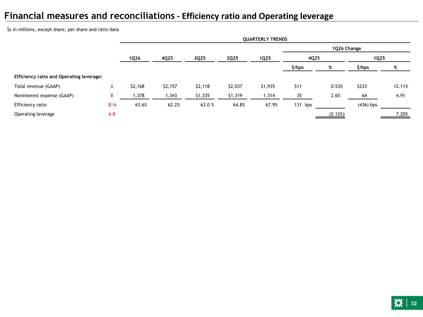 32 Financial measures and reconciliations - Efficiency ratio and Operating leverage $s in millions, except share, per share and ratio data QUARTERLY TRENDS 1Q26 Change 1Q26 4Q25 3Q25 2Q25 1Q25 4Q25 1Q25 $/bps % $/bps % Efficiency ratio and Operating leverage: Total revenue (GAAP) A $2,168 $2,157 $2,118 $2,037 $1,935 $11 0.53% $233 12.11% Noninterest expense (GAAP) B 1,378 1,343 $1,335 $1,319 1,314 35 2.65 64 4.91 Efficiency ratio B/A 63.6% 62.2% 63.0 % 64.8% 67.9% 131 bps (436) bps Operating leverage A-B (2.12%) 7.20%