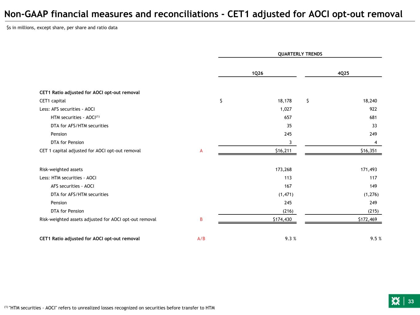 33 Non-GAAP financial measures and reconciliations - CET1 adjusted for AOCI opt-out removal QUARTERLY TRENDS 1Q26 4Q25 CET1 Ratio adjusted for AOCI opt-out removal CET1 capital $ 18,178 $ 18,240 Less: AFS securities - AOCI 1,027 922 HTM securities - AOCI(1) 657 681 DTA for AFS/HTM securities 35 33 Pension 245 249 DTA for Pension 3 4 CET 1 capital adjusted for AOCI opt-out removal A $16,211 $16,351 Risk-weighted assets 173,268 171,493 Less: HTM securities - AOCI 113 117 AFS securities - AOCI 167 149 DTA for AFS/HTM securities (1,471) (1,276) Pension 245 249 DTA for Pension (216) (215) Risk-weighted assets adjusted for AOCI opt-out removal B $174,430 $172,469 CET1 Ratio adjusted for AOCI opt-out removal A/B 9.3 % 9.5 % $s in millions, except share, per share and ratio data (1) "HTM securities - AOCI" refers to unrealized losses recognized on securities before transfer to HTM