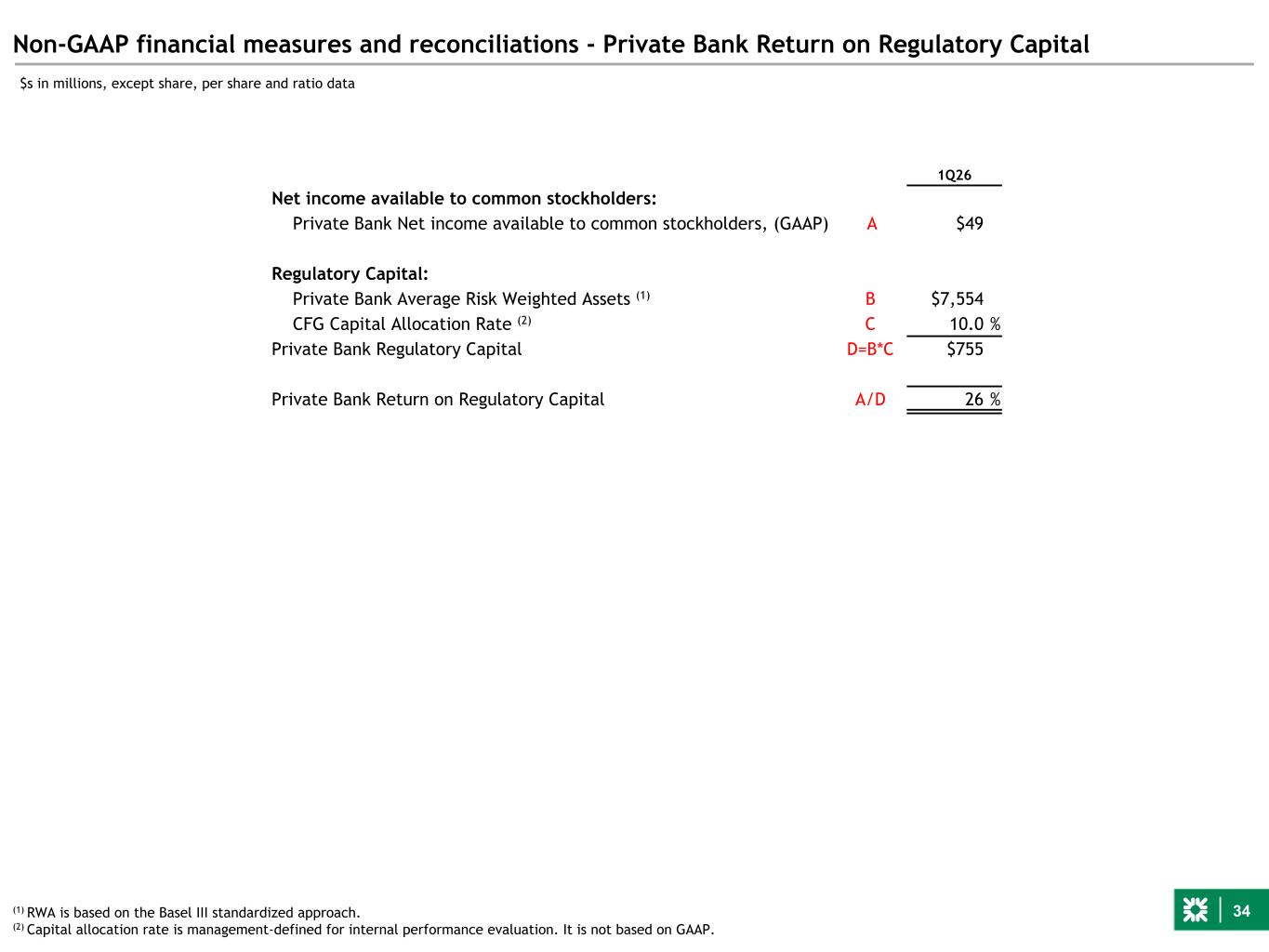 34 Non-GAAP financial measures and reconciliations - Private Bank Return on Regulatory Capital $s in millions, except share, per share and ratio data 1Q26 Net income available to common stockholders: Private Bank Net income available to common stockholders, (GAAP) A $49 Regulatory Capital: Private Bank Average Risk Weighted Assets (1) B $7,554 CFG Capital Allocation Rate (2) C 10.0 % Private Bank Regulatory Capital D=B*C $755 Private Bank Return on Regulatory Capital A/D 26 % (1) RWA is based on the Basel III standardized approach. (2) Capital allocation rate is management-defined for internal performance evaluation. It is not based on GAAP.