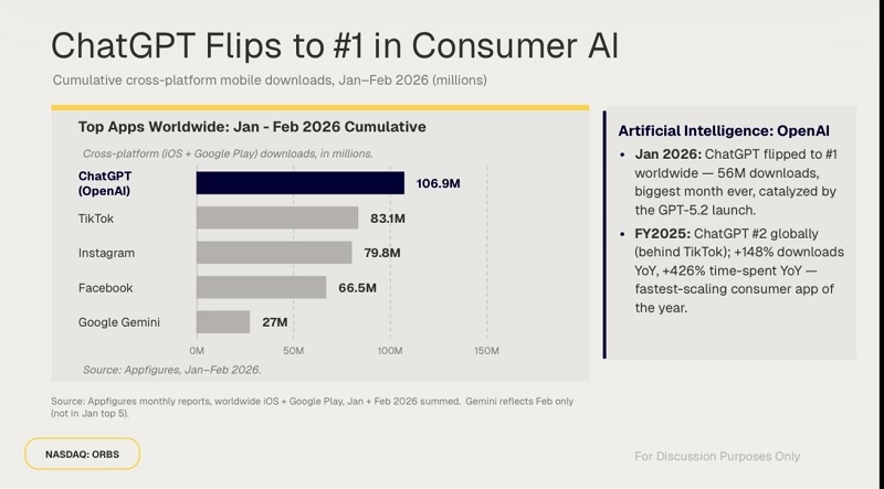 ChatGPT, OpenAI’s consumer app, has officially claimed the #1 spot in consumer AI, overtaking TikTok, Instagram, and Facebook in monthly worldwide downloads in early 2026 (Sensor Tower), making it the fastest-scaling consumer app of the year.
