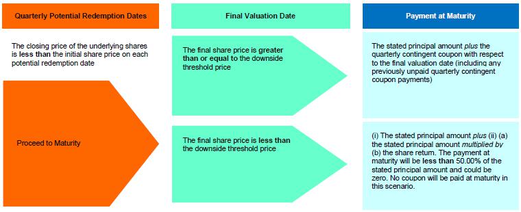 If the closing price of the underlying shares is greater than or equal to the initial share price on any potential redemption date (beginning approximately three months after the issue date), the securities will be automatically redeemed for an early redemption payment equal to the stated principal amount plus the quarterly contingent coupon payment with respect to the related potential redemption date (including any previously unpaid quarterly contingent coupon payments). If the securities have not previously been automatically redeemed and the final share price is greater than or equal to the downside threshold price, the payment at maturity will also be the sum of the stated principal amount and the quarterly contingent coupon payment due at maturity (including any previously unpaid quarterly contingent coupon payments). However, if the securities have not previously been automatically redeemed and the final share price is less than the downside threshold price, investors will be exposed to the decline in the closing price of the underlying shares, as compared to the initial share price, on a 1-to-1 basis (and, in addition, will not receive any quarterly contingent coupon payment at maturity, including any previously unpaid quarterly contingent coupon payments). Under these circumstances, the payment at maturity will be (i) the stated principal amount plus (ii) (a) the stated principal amount times (b) the share return, which means that the payment at maturity will be less than 50.00% of the stated principal amount of the securities and could be zero. Investors in the securities must be willing to accept the risk of losing their entire principal and also the risk of receiving few or no quarterly contingent coupon payments over the term of the securities. In addition, investors will not participate in any appreciation of the underlying shares.