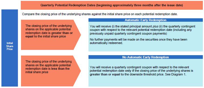 In Examples 1 and 2, the closing price of the underlying shares fluctuates over the term of the securities and the closing price of the underlying shares is greater than or equal to the initial share price on one of the potential redemption dates, which begin approximately three months after the issue date. Because the closing price of the underlying shares is greater than or equal to the initial share price on one of the potential redemption dates, the securities are automatically redeemed following the relevant potential redemption date. In Examples 3 and 4, the closing price of the underlying shares on each potential redemption date is less than the initial share price, and, consequently, the securities are not automatically redeemed prior to, and remain outstanding until, maturity.