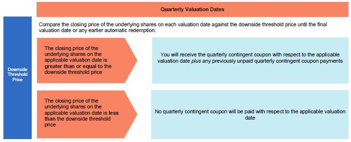 The securities provide an opportunity for investors to earn a quarterly contingent coupon payment, which is an amount equal to $26.50 (2.65% of the stated principal amount) per security, with respect to each quarterly valuation date on which the closing price of the underlying shares is greater than or equal to 50.00% of the initial share price, which we refer to as the downside threshold price. The quarterly contingent coupon payment, if any, will be payable quarterly on the relevant contingent coupon payment date, which is the third business day after the related valuation date or, in the case of the quarterly contingent coupon payment, if any, with respect to the final valuation date, the maturity date. If the closing price of the underlying shares is less than the downside threshold price on any valuation date, investors will receive no quarterly contingent coupon payment for the related quarterly period. If the closing price of the underlying shares is less than the downside threshold price on one or more valuation dates and, on a subsequent valuation date, the closing price of the underlying shares is greater than or equal to the downside threshold price, your quarterly contingent coupon payment for that subsequent valuation date will include all previously unpaid quarterly contingent coupon payments (without interest on amounts previously unpaid). However, if the closing price of the underlying shares is less than the downside threshold price on any valuation date and on each subsequent valuation date thereafter, you will not receive the unpaid quarterly contingent coupon payments in respect of those valuation dates. It is possible that the closing price of the underlying shares could be below the downside threshold price on all of the valuation dates so that you will receive no quarterly contingent coupon payments. We refer to these payments as contingent because there is no guarantee that you will receive a payment on any contingent coupon payment date.