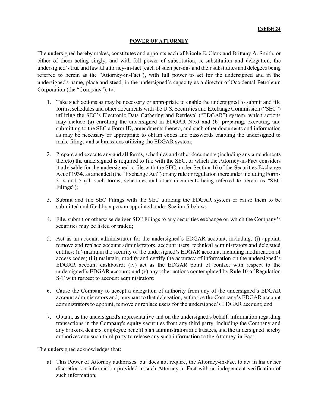Exhibit 24 POWER OF ATTORNEY The undersigned hereby makes, constitutes and appoints each of Nicole E. Clark and Brittany A. Smith, or either of them acting singly, and with full power of substitution, re-substitution and delegation, the undersigned’s true and lawful attorney-in-fact (each of such persons and their substitutes and delegees being referred to herein as the "Attorney-in-Fact"), with full power to act for the undersigned and in the undersigned's name, place and stead, in the undersigned’s capacity as a director of Occidental Petroleum Corporation (the “Company”), to: 1. Take such actions as may be necessary or appropriate to enable the undersigned to submit and file forms, schedules and other documents with the U.S. Securities and Exchange Commission (“SEC”) utilizing the SEC’s Electronic Data Gathering and Retrieval (“EDGAR”) system, which actions may include (a) enrolling the undersigned in EDGAR Next and (b) preparing, executing and submitting to the SEC a Form ID, amendments thereto, and such other documents and information as may be necessary or appropriate to obtain codes and passwords enabling the undersigned to make filings and submissions utilizing the EDGAR system; 2. Prepare and execute any and all forms, schedules and other documents (including any amendments thereto) the undersigned is required to file with the SEC, or which the Attorney-in-Fact considers it advisable for the undersigned to file with the SEC, under Section 16 of the Securities Exchange Act of 1934, as amended (the “Exchange Act”) or any rule or regulation thereunder including Forms 3, 4 and 5 (all such forms, schedules and other documents being referred to herein as “SEC Filings”); 3. Submit and file SEC Filings with the SEC utilizing the EDGAR system or cause them to be submitted and filed by a person appointed under Section 5 below; 4. File, submit or otherwise deliver SEC Filings to any securities exchange on which the Company’s securities may be listed or traded; 5. Act as an account administrator for the undersigned’s EDGAR account, including: (i) appoint, remove and replace account administrators, account users, technical administrators and delegated entities; (ii) maintain the security of the undersigned’s EDGAR account, including modification of access codes; (iii) maintain, modify and certify the accuracy of information on the undersigned’s EDGAR account dashboard; (iv) act as the EDGAR point of contact with respect to the undersigned’s EDGAR account; and (v) any other actions contemplated by Rule 10 of Regulation S-T with respect to account administrators; 6. Cause the Company to accept a delegation of authority from any of the undersigned’s EDGAR account administrators and, pursuant to that delegation, authorize the Company’s EDGAR account administrators to appoint, remove or replace users for the undersigned’s EDGAR account; and 7. Obtain, as the undersigned's representative and on the undersigned's behalf, information regarding transactions in the Company's equity securities from any third party, including the Company and any brokers, dealers, employee benefit plan administrators and trustees, and the undersigned hereby authorizes any such third party to release any such information to the Attorney-in-Fact. The undersigned acknowledges that: a) This Power of Attorney authorizes, but does not require, the Attorney-in-Fact to act in his or her discretion on information provided to such Attorney-in-Fact without independent verification of such information;