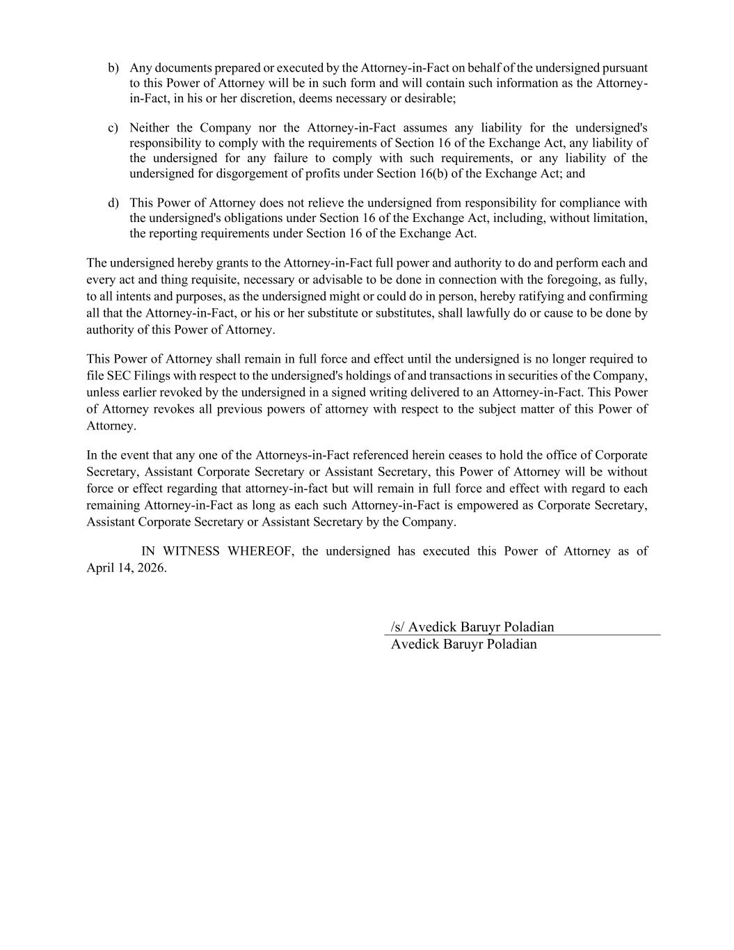 b) Any documents prepared or executed by the Attorney-in-Fact on behalf of the undersigned pursuant to this Power of Attorney will be in such form and will contain such information as the Attorney- in-Fact, in his or her discretion, deems necessary or desirable; c) Neither the Company nor the Attorney-in-Fact assumes any liability for the undersigned's responsibility to comply with the requirements of Section 16 of the Exchange Act, any liability of the undersigned for any failure to comply with such requirements, or any liability of the undersigned for disgorgement of profits under Section 16(b) of the Exchange Act; and d) This Power of Attorney does not relieve the undersigned from responsibility for compliance with the undersigned's obligations under Section 16 of the Exchange Act, including, without limitation, the reporting requirements under Section 16 of the Exchange Act. The undersigned hereby grants to the Attorney-in-Fact full power and authority to do and perform each and every act and thing requisite, necessary or advisable to be done in connection with the foregoing, as fully, to all intents and purposes, as the undersigned might or could do in person, hereby ratifying and confirming all that the Attorney-in-Fact, or his or her substitute or substitutes, shall lawfully do or cause to be done by authority of this Power of Attorney. This Power of Attorney shall remain in full force and effect until the undersigned is no longer required to file SEC Filings with respect to the undersigned's holdings of and transactions in securities of the Company, unless earlier revoked by the undersigned in a signed writing delivered to an Attorney-in-Fact. This Power of Attorney revokes all previous powers of attorney with respect to the subject matter of this Power of Attorney. In the event that any one of the Attorneys-in-Fact referenced herein ceases to hold the office of Corporate Secretary, Assistant Corporate Secretary or Assistant Secretary, this Power of Attorney will be without force or effect regarding that attorney-in-fact but will remain in full force and effect with regard to each remaining Attorney-in-Fact as long as each such Attorney-in-Fact is empowered as Corporate Secretary, Assistant Corporate Secretary or Assistant Secretary by the Company. IN WITNESS WHEREOF, the undersigned has executed this Power of Attorney as of April 14, 2026. /s/ Avedick Baruyr Poladian Avedick Baruyr Poladian