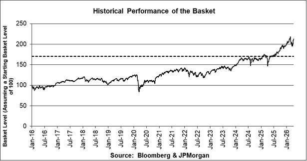 The following graph shows the daily hypothetical performance of the Basket from January 4, 2016 through April 14, 2026, assuming that the closing level of the Basket on January 4, 2016 was 100 and that the Underlyings on those dates were weighted as specified in the “Final Terms” in this pricing supplement. The dotted line represents a hypothetical Downside Threshold of 170.10, equal to 80% of the hypothetical closing level of the Basket on April 14, 2026. The hypothetical historical daily Basket performance data in this graph was determined using the closing levels of each Underlying reported by the Bloomberg Professional® service (“Bloomberg”) for those dates, without independent verification. The hypothetical historical performance of the Basket displayed below is a reflection of the aggregated historical performance of the Underlyings as described above.
