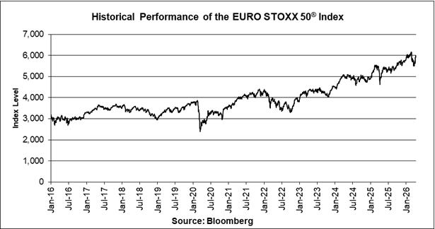 The graph below illustrates the daily performance of the EURO STOXX 50® Index from January 4, 2016 through April 14, 2026, based on information from Bloomberg, without independent verification. The closing level of the EURO STOXX 50® Index on April 14, 2026 was 5,984.51. We obtained the closing levels of the EURO STOXX 50® Index above and below from Bloomberg, without independent verification.