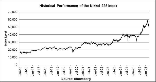 The graph below illustrates the daily performance of the Nikkei 225 Index from January 4, 2016 through April 14, 2026, based on information from Bloomberg, without independent verification. The closing level of the Nikkei 225 Index on April 14, 2026 was 57,877.39. We obtained the closing levels of the Nikkei 225 Index above and below from Bloomberg, without independent verification.