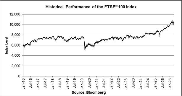 The graph below illustrates the daily performance of the FTSE® 100 Index from January 4, 2016 through April 14, 2026, based on information from Bloomberg, without independent verification. The closing level of the FTSE® 100 Index on April 14, 2026 was 10,609.06. We obtained the closing levels of the FTSE® 100 Index above and below from Bloomberg, without independent verification.