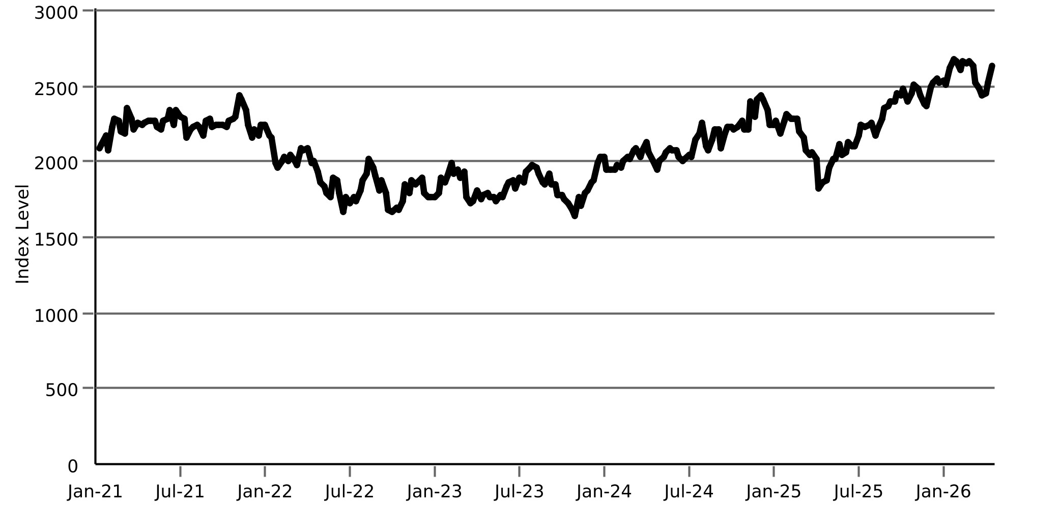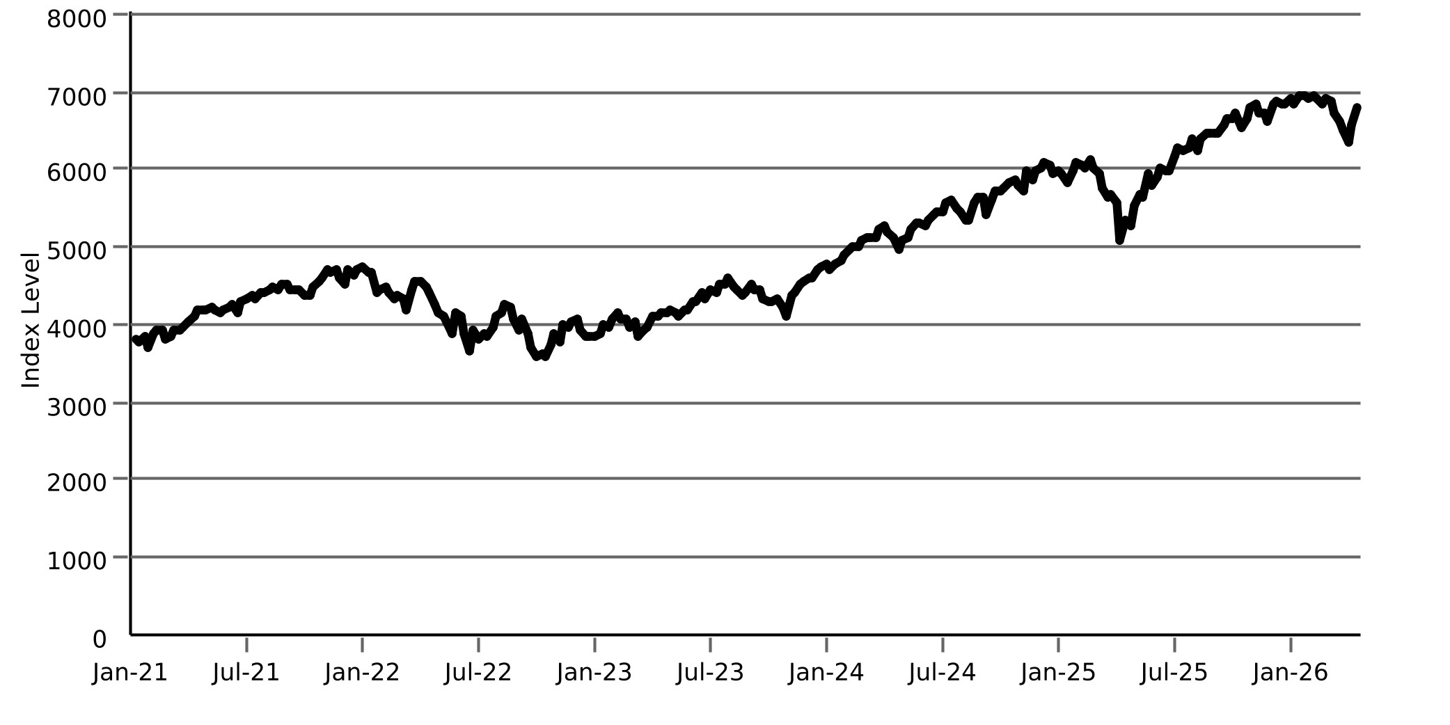 The following graphs set forth the historical performance of each Index based on the weekly historical closing levels from January 8, 2021 through April 10, 2026. The closing level of the Nasdaq-100® Technology Sector IndexSM on April 14, 2026 was 12,911.42. The closing level of the Russell 2000® Index on April 14, 2026 was 2,705.668. The closing level of the S&P 500® Index on April 14, 2026 was 6,967.38. We obtained the closing levels above and below from the Bloomberg Professional® service (“Bloomberg”), without independent verification.