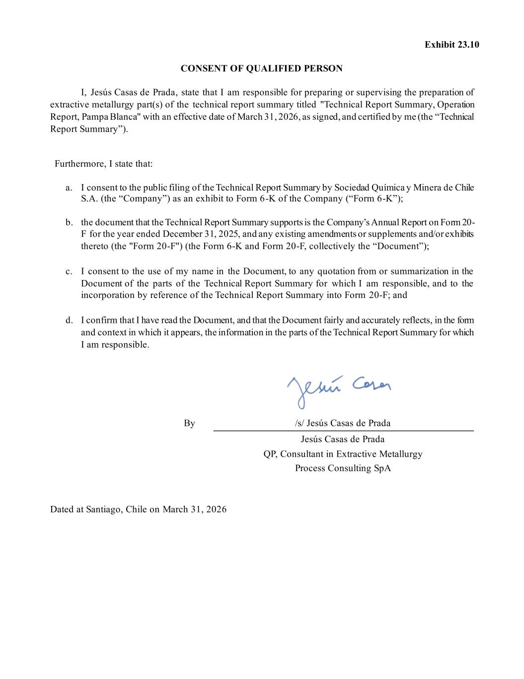 Exhibit 23.10 CONSENT OF QUALIFIED PERSON I, Jesús Casas de Prada, state that I am responsible for preparing or supervising the preparation of extractive metallurgy part(s) of the technical report summary titled "Technical Report Summary, Operation Report, Pampa Blanca" with an effective date of March 31, 2026, as signed, and certified by me (the “Technical Report Summary”). Furthermore, I state that: a. I consent to the public filing of the Technical Report Summary by Sociedad Química y Minera de Chile S.A. (the “Company”) as an exhibit to Form 6-K of the Company (“Form 6-K”); b. the document that the Technical Report Summary supports is the Company’s Annual Report on Form 20- F for the year ended December 31, 2025, and any existing amendments or supplements and/or exhibits thereto (the "Form 20-F") (the Form 6-K and Form 20-F, collectively the “Document”); c. I consent to the use of my name in the Document, to any quotation from or summarization in the Document of the parts of the Technical Report Summary for which I am responsible, and to the incorporation by reference of the Technical Report Summary into Form 20-F; and d. I confirm that I have read the Document, and that the Document fairly and accurately reflects, in the form and context in which it appears, the information in the parts of the Technical Report Summary for which I am responsible. By /s/ Jesús Casas de Prada Jesús Casas de Prada QP, Consultant in Extractive Metallurgy Process Consulting SpA Dated at Santiago, Chile on March 31, 2026