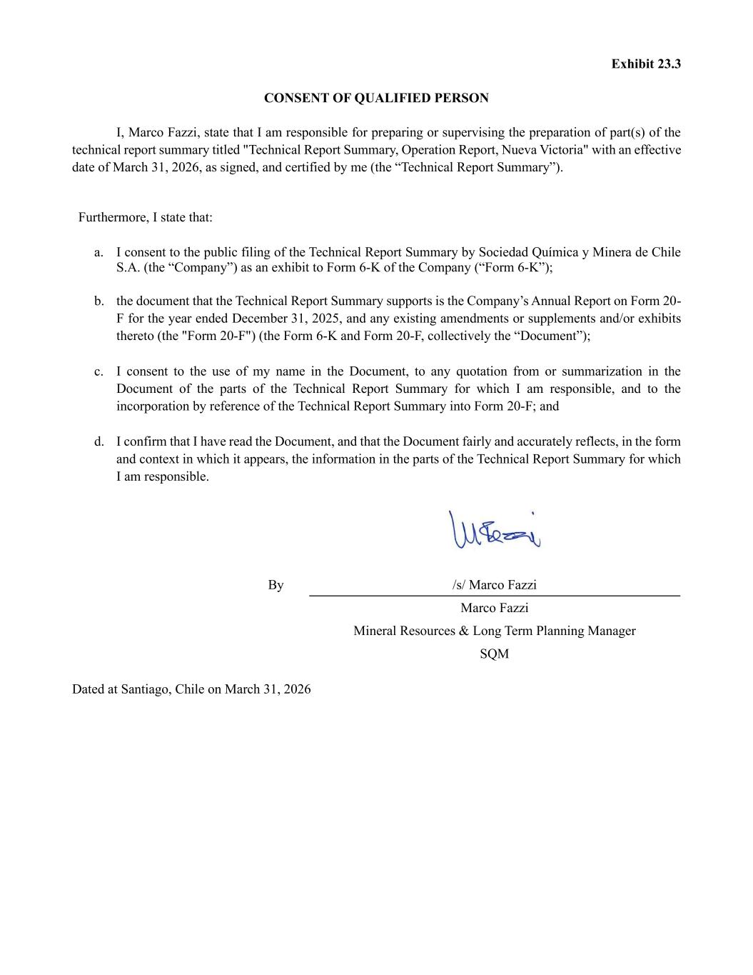 Exhibit 23.3 CONSENT OF QUALIFIED PERSON I, Marco Fazzi, state that I am responsible for preparing or supervising the preparation of part(s) of the technical report summary titled "Technical Report Summary, Operation Report, Nueva Victoria" with an effective date of March 31, 2026, as signed, and certified by me (the “Technical Report Summary”). Furthermore, I state that: a. I consent to the public filing of the Technical Report Summary by Sociedad Química y Minera de Chile S.A. (the “Company”) as an exhibit to Form 6-K of the Company (“Form 6-K”); b. the document that the Technical Report Summary supports is the Company’s Annual Report on Form 20- F for the year ended December 31, 2025, and any existing amendments or supplements and/or exhibits thereto (the "Form 20-F") (the Form 6-K and Form 20-F, collectively the “Document”); c. I consent to the use of my name in the Document, to any quotation from or summarization in the Document of the parts of the Technical Report Summary for which I am responsible, and to the incorporation by reference of the Technical Report Summary into Form 20-F; and d. I confirm that I have read the Document, and that the Document fairly and accurately reflects, in the form and context in which it appears, the information in the parts of the Technical Report Summary for which I am responsible. By /s/ Marco Fazzi Marco Fazzi Mineral Resources & Long Term Planning Manager SQM Dated at Santiago, Chile on March 31, 2026