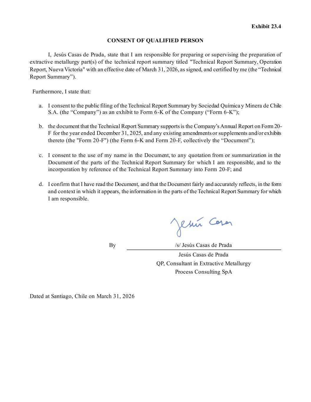Exhibit 23.4 CONSENT OF QUALIFIED PERSON I, Jesús Casas de Prada, state that I am responsible for preparing or supervising the preparation of extractive metallurgy part(s) of the technical report summary titled "Technical Report Summary, Operation Report, Nueva Victoria" with an effective date of March 31, 2026, as signed, and certified by me (the “Technical Report Summary”). Furthermore, I state that: a. I consent to the public filing of the Technical Report Summary by Sociedad Química y Minera de Chile S.A. (the “Company”) as an exhibit to Form 6-K of the Company (“Form 6-K”); b. the document that the Technical Report Summary supports is the Company’s Annual Report on Form 20- F for the year ended December 31, 2025, and any existing amendments or supplements and/or exhibits thereto (the "Form 20-F") (the Form 6-K and Form 20-F, collectively the “Document”); c. I consent to the use of my name in the Document, to any quotation from or summarization in the Document of the parts of the Technical Report Summary for which I am responsible, and to the incorporation by reference of the Technical Report Summary into Form 20-F; and d. I confirm that I have read the Document, and that the Document fairly and accurately reflects, in the form and context in which it appears, the information in the parts of the Technical Report Summary for which I am responsible. By /s/ Jesús Casas de Prada Jesús Casas de Prada QP, Consultant in Extractive Metallurgy Process Consulting SpA Dated at Santiago, Chile on March 31, 2026