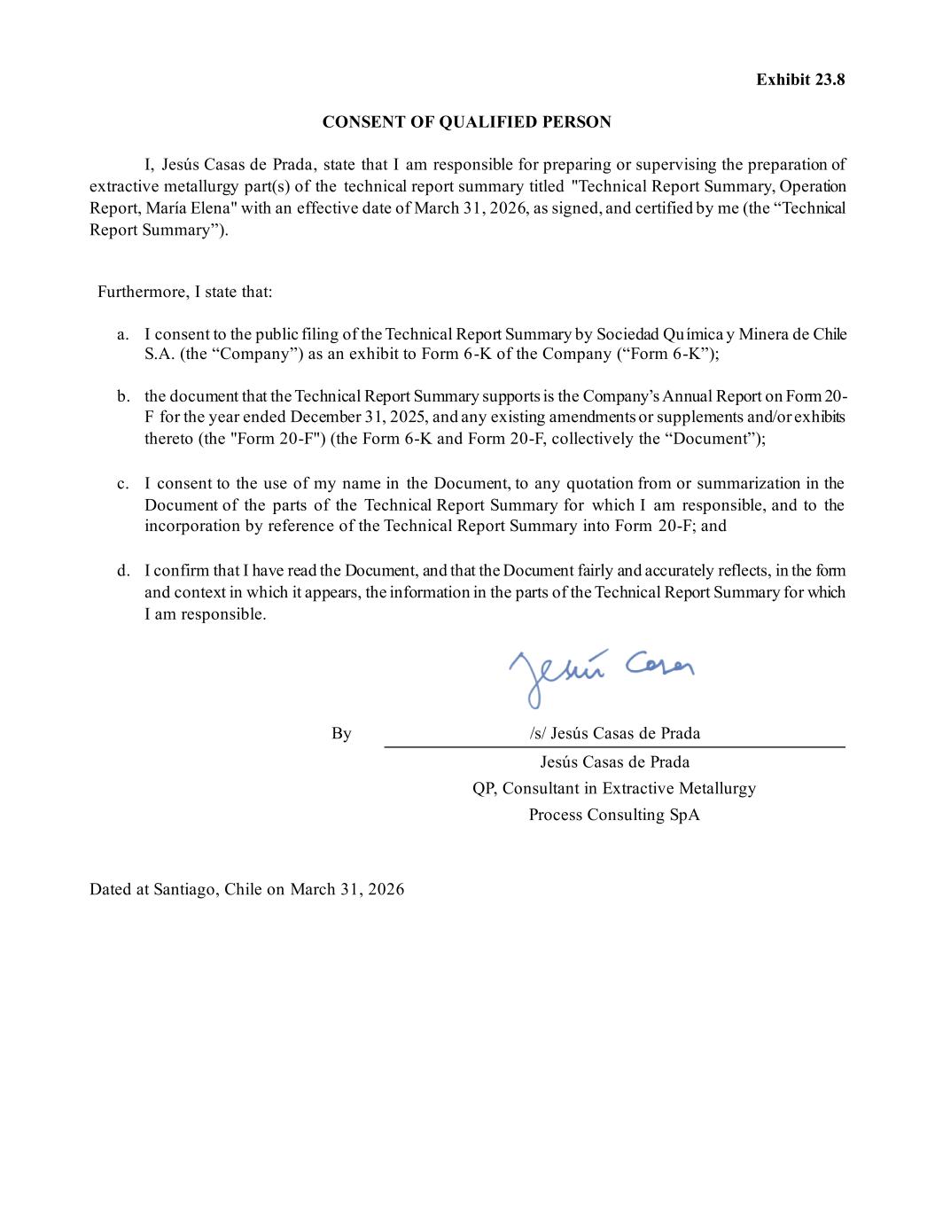 Exhibit 23.8 CONSENT OF QUALIFIED PERSON I, Jesús Casas de Prada, state that I am responsible for preparing or supervising the preparation of extractive metallurgy part(s) of the technical report summary titled "Technical Report Summary, Operation Report, María Elena" with an effective date of March 31, 2026, as signed, and certified by me (the “Technical Report Summary”). Furthermore, I state that: a. I consent to the public filing of the Technical Report Summary by Sociedad Química y Minera de Chile S.A. (the “Company”) as an exhibit to Form 6-K of the Company (“Form 6-K”); b. the document that the Technical Report Summary supports is the Company’s Annual Report on Form 20- F for the year ended December 31, 2025, and any existing amendments or supplements and/or exhibits thereto (the "Form 20-F") (the Form 6-K and Form 20-F, collectively the “Document”); c. I consent to the use of my name in the Document, to any quotation from or summarization in the Document of the parts of the Technical Report Summary for which I am responsible, and to the incorporation by reference of the Technical Report Summary into Form 20-F; and d. I confirm that I have read the Document, and that the Document fairly and accurately reflects, in the form and context in which it appears, the information in the parts of the Technical Report Summary for which I am responsible. By /s/ Jesús Casas de Prada Jesús Casas de Prada QP, Consultant in Extractive Metallurgy Process Consulting SpA Dated at Santiago, Chile on March 31, 2026