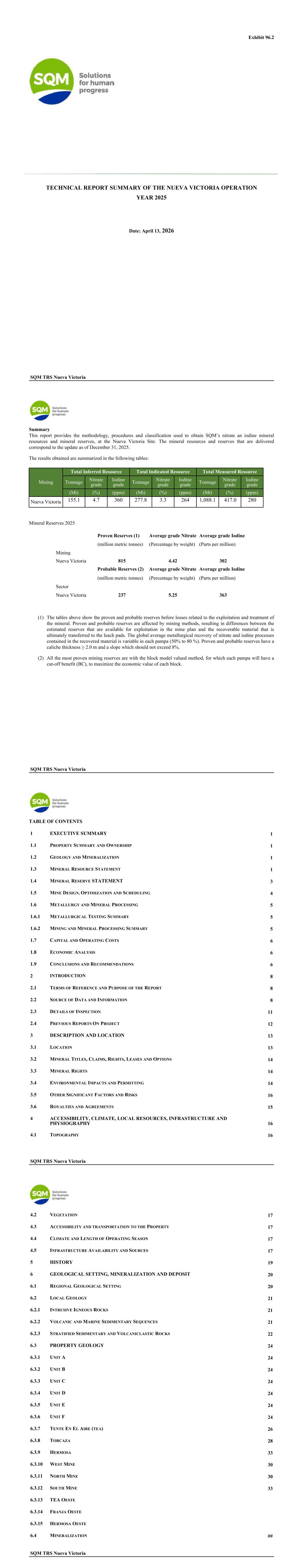 Exhibit 96.2 TECHNICAL REPORT SUMMARY OF THE NUEVA VICTORIA OPERATION YEAR 2025 Date: April 13, 2026 SQM TRS Nueva Victoria Summary This report provides the methodology, procedures and classification used to obtain SQM’s nitrate an iodine mineral resources and mineral reserves, at the Nueva Victoria Site. The mineral resources and reserves that are delivered correspond to the update as of December 31, 2025. The results obtained are summarized in the following tables: Mining Total Inferred Resource Total Indicated Resource Total Measured Resource Tonnage Nitrate grade Iodine grade Tonnage Nitrate grade Iodine grade Tonnage Nitrate grade Iodine grade (Mt) (%) (ppm) (Mt) (%) (ppm) (Mt) (%) (ppm) Nueva Victoria 155.1 4.7 360 277.8 3.3 264 1,088.1 417.0 280 Mineral Reserves 2025 Proven Reserves (1) Average grade Nitrate Average grade Iodine (million metric tonnes) (Percentage by weight) (Parts per million) Mining Nueva Victoria 815 4.42 302 Probable Reserves (2) Average grade Nitrate Average grade Iodine (million metric tonnes) (Percentage by weight) (Parts per million) Sector Nueva Victoria 237 5.25 363 (1) The tables above show the proven and probable reserves before losses related to the exploitation and treatment of the mineral. Proven and probable reserves are affected by mining methods, resulting in differences between the estimated reserves that are available for exploitation in the mine plan and the recoverable material that is ultimately transferred to the leach pads. The global average metallurgical recovery of nitrate and iodine processes contained in the recovered material is variable in each pampa (50% to 80 %). Proven and probable reserves have a caliche thickness ≥ 2.0 m and a slope which should not exceed 8%. (2) All the most proven mining reserves are with the block model valued method, for which each pampa will have a cut-off benefit (BC), to maximize the economic value of each block. SQM TRS Nueva Victoria TABLE OF CONTENTS 1 EXECUTIVE SUMMARY 1 1.1 PROPERTY SUMMARY AND OWNERSHIP 1 1.2 GEOLOGY AND MINERALIZATION 1 1.3 MINERAL RESOURCE STATEMENT 1 1.4 MINERAL RESERVE STATEMENT 3 1.5 MINE DESIGN, OPTIMIZATION AND SCHEDULING 4 1.6 METALLURGY AND MINERAL PROCESSING 5 1.6.1 METALLURGICAL TESTING SUMMARY 5 1.6.2 MINING AND MINERAL PROCESSING SUMMARY 5 1.7 CAPITAL AND OPERATING COSTS 6 1.8 ECONOMIC ANALYSIS 6 1.9 CONCLUSIONS AND RECOMMENDATIONS 6 2 INTRODUCTION 8 2.1 TERMS OF REFERENCE AND PURPOSE OF THE REPORT 8 2.2 SOURCE OF DATA AND INFORMATION 8 2.3 DETAILS OF INSPECTION 11 2.4 PREVIOUS REPORTS ON PROJECT 12 3 DESCRIPTION AND LOCATION 13 3.1 LOCATION 13 3.2 MINERAL TITLES, CLAIMS, RIGHTS, LEASES AND OPTIONS 14 3.3 MINERAL RIGHTS 14 3.4 ENVIRONMENTAL IMPACTS AND PERMITTING 14 3.5 OTHER SIGNIFICANT FACTORS AND RISKS 16 3.6 ROYALTIES AND AGREEMENTS 15 4 ACCESSIBILITY, CLIMATE, LOCAL RESOURCES, INFRASTRUCTURE AND PHYSIOGRAPHY 16 4.1 TOPOGRAPHY 16 SQM TRS Nueva Victoria 4.2 VEGETATION 17 4.3 ACCESSIBILITY AND TRANSPORTATION TO THE PROPERTY 17 4.4 CLIMATE AND LENGTH OF OPERATING SEASON 17 4.5 INFRASTRUCTURE AVAILABILITY AND SOURCES 17 5 HISTORY 19 6 GEOLOGICAL SETTING, MINERALIZATION AND DEPOSIT 20 6.1 REGIONAL GEOLOGICAL SETTING 20 6.2 LOCAL GEOLOGY 21 6.2.1 INTRUSIVE IGNEOUS ROCKS 21 6.2.2 VOLCANIC AND MARINE SEDIMENTARY SEQUENCES 21 6.2.3 STRATIFIED SEDIMENTARY AND VOLCANICLASTIC ROCKS 22 6.3 PROPERTY GEOLOGY 24 6.3.1 UNIT A 24 6.3.2 UNIT B 24 6.3.3 UNIT C 24 6.3.4 UNIT D 24 6.3.5 UNIT E 24 6.3.6 UNIT F 24 6.3.7 TENTE EN EL AIRE (TEA) 26 6.3.8 TORCAZA 28 6.3.9 HERMOSA 33 6.3.10 WEST MINE 30 6.3.11 NORTH MINE 30 6.3.12 SOUTH MINE 33 6.3.13 TEA OESTE 6.3.14 FRANJA OESTE 6.3.15 HERMOSA OESTE 6.4 MINERALIZATION ## SQM TRS Nueva Victoria
