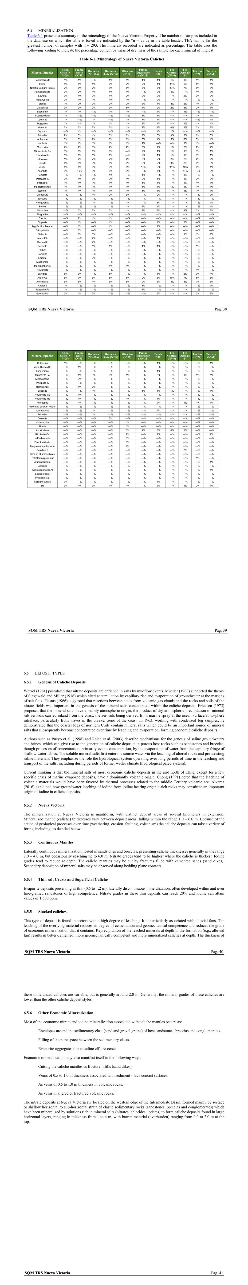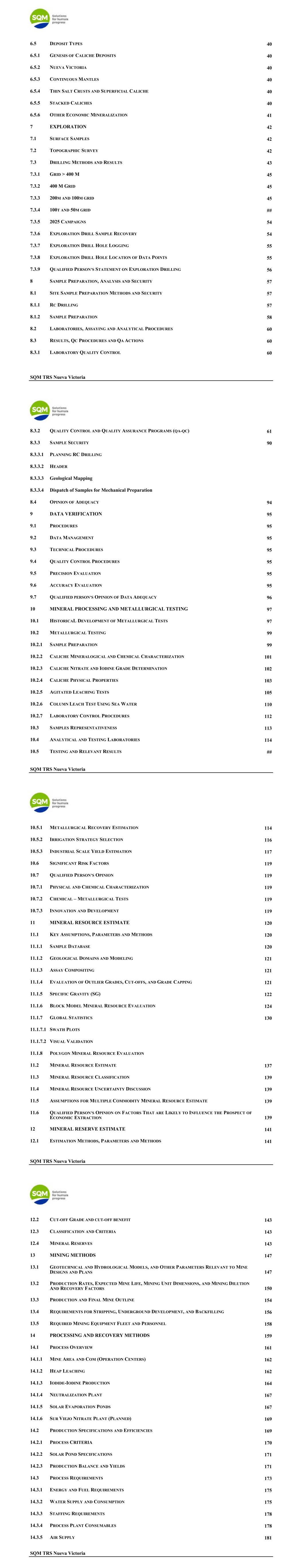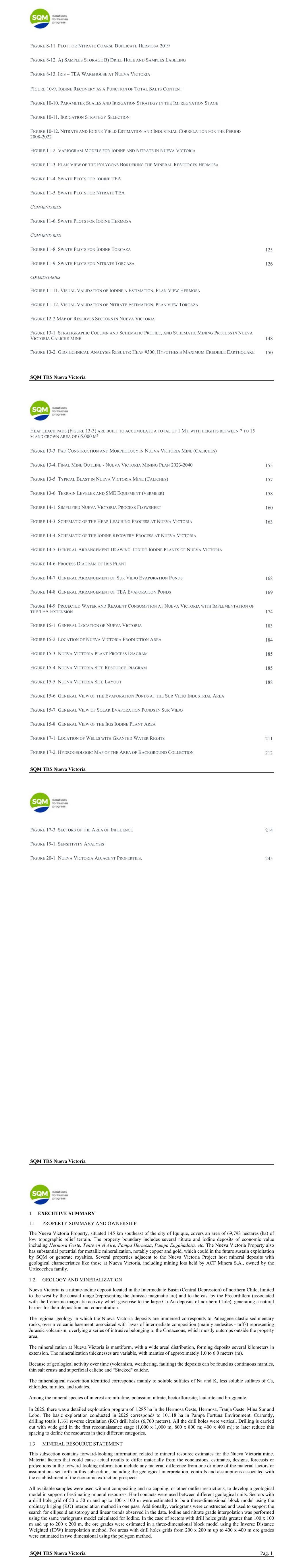 6.5 DEPOSIT TYPES 40 6.5.1 GENESIS OF CALICHE DEPOSITS 40 6.5.2 NUEVA VICTORIA 40 6.5.3 CONTINUOUS MANTLES 40 6.5.4 THIN SALT CRUSTS AND SUPERFICIAL CALICHE 40 6.5.5 STACKED CALICHES 40 6.5.6 OTHER ECONOMIC MINERALIZATION 41 7 EXPLORATION 42 7.1 SURFACE SAMPLES 42 7.2 TOPOGRAPHIC SURVEY 42 7.3 DRILLING METHODS AND RESULTS 43 7.3.1 GRID > 400 M 45 7.3.2 400 M GRID 45 7.3.3 200M AND 100M GRID 45 7.3.4 100T AND 50M GRID ## 7.3.5 2025 CAMPAIGNS 54 7.3.6 EXPLORATION DRILL SAMPLE RECOVERY 54 7.3.7 EXPLORATION DRILL HOLE LOGGING 55 7.3.8 EXPLORATION DRILL HOLE LOCATION OF DATA POINTS 55 7.3.9 QUALIFIED PERSON’S STATEMENT ON EXPLORATION DRILLING 56 8 SAMPLE PREPARATION, ANALYSIS AND SECURITY 57 8.1 SITE SAMPLE PREPARATION METHODS AND SECURITY 57 8.1.1 RC DRILLING 57 8.1.2 SAMPLE PREPARATION 58 8.2 LABORATORIES, ASSAYING AND ANALYTICAL PROCEDURES 60 8.3 RESULTS, QC PROCEDURES AND QA ACTIONS 60 8.3.1 LABORATORY QUALITY CONTROL 60 SQM TRS Nueva Victoria 8.3.2 QUALITY CONTROL AND QUALITY ASSURANCE PROGRAMS (QA-QC) 61 8.3.3 SAMPLE SECURITY 90 8.3.3.1 PLANNING RC DRILLING 8.3.3.2 HEADER 8.3.3.3 Geological Mapping 8.3.3.4 Dispatch of Samples for Mechanical Preparation 8.4 OPINION OF ADEQUACY 94 9 DATA VERIFICATION 95 9.1 PROCEDURES 95 9.2 DATA MANAGEMENT 95 9.3 TECHNICAL PROCEDURES 95 9.4 QUALITY CONTROL PROCEDURES 95 9.5 PRECISION EVALUATION 95 9.6 ACCURACY EVALUATION 95 9.7 QUALIFIED PERSON’S OPINION OF DATA ADEQUACY 96 10 MINERAL PROCESSING AND METALLURGICAL TESTING 97 10.1 HISTORICAL DEVELOPMENT OF METALLURGICAL TESTS 97 10.2 METALLURGICAL TESTING 99 10.2.1 SAMPLE PREPARATION 99 10.2.2 CALICHE MINERALOGICAL AND CHEMICAL CHARACTERIZATION 101 10.2.3 CALICHE NITRATE AND IODINE GRADE DETERMINATION 102 10.2.4 CALICHE PHYSICAL PROPERTIES 103 10.2.5 AGITATED LEACHING TESTS 105 10.2.6 COLUMN LEACH TEST USING SEA WATER 110 10.2.7 LABORATORY CONTROL PROCEDURES 112 10.3 SAMPLES REPRESENTATIVENESS 113 10.4 ANALYTICAL AND TESTING LABORATORIES 114 10.5 TESTING AND RELEVANT RESULTS ## SQM TRS Nueva Victoria 10.5.1 METALLURGICAL RECOVERY ESTIMATION 114 10.5.2 IRRIGATION STRATEGY SELECTION 116 10.5.3 INDUSTRIAL SCALE YIELD ESTIMATION 117 10.6 SIGNIFICANT RISK FACTORS 119 10.7 QUALIFIED PERSON’S OPINION 119 10.7.1 PHYSICAL AND CHEMICAL CHARACTERIZATION 119 10.7.2 CHEMICAL – METALLURGICAL TESTS 119 10.7.3 INNOVATION AND DEVELOPMENT 119 11 MINERAL RESOURCE ESTIMATE 120 11.1 KEY ASSUMPTIONS, PARAMETERS AND METHODS 120 11.1.1 SAMPLE DATABASE 120 11.1.2 GEOLOGICAL DOMAINS AND MODELING 121 11.1.3 ASSAY COMPOSITING 121 11.1.4 EVALUATION OF OUTLIER GRADES, CUT-OFFS, AND GRADE CAPPING 121 11.1.5 SPECIFIC GRAVITY (SG) 122 11.1.6 BLOCK MODEL MINERAL RESOURCE EVALUATION 124 11.1.7 GLOBAL STATISTICS 130 11.1.7.1 SWATH PLOTS 11.1.7.2 VISUAL VALIDATION 11.1.8 POLYGON MINERAL RESOURCE EVALUATION 11.2 MINERAL RESOURCE ESTIMATE 137 11.3 MINERAL RESOURCE CLASSIFICATION 139 11.4 MINERAL RESOURCE UNCERTAINTY DISCUSSION 139 11.5 ASSUMPTIONS FOR MULTIPLE COMMODITY MINERAL RESOURCE ESTIMATE 139 11.6 QUALIFIED PERSON’S OPINION ON FACTORS THAT ARE LIKELY TO INFLUENCE THE PROSPECT OF ECONOMIC EXTRACTION 139 12 MINERAL RESERVE ESTIMATE 141 12.1 ESTIMATION METHODS, PARAMETERS AND METHODS 141 SQM TRS Nueva Victoria 12.2 CUT-OFF GRADE AND CUT-OFF BENEFIT 143 12.3 CLASSIFICATION AND CRITERIA 143 12.4 MINERAL RESERVES 143 13 MINING METHODS 147 13.1 GEOTECHNICAL AND HYDROLOGICAL MODELS, AND OTHER PARAMETERS RELEVANT TO MINE DESIGNS AND PLANS 147 13.2 PRODUCTION RATES, EXPECTED MINE LIFE, MINING UNIT DIMENSIONS, AND MINING DILUTION AND RECOVERY FACTORS 150 13.3 PRODUCTION AND FINAL MINE OUTLINE 154 13.4 REQUIREMENTS FOR STRIPPING, UNDERGROUND DEVELOPMENT, AND BACKFILLING 156 13.5 REQUIRED MINING EQUIPMENT FLEET AND PERSONNEL 158 14 PROCESSING AND RECOVERY METHODS 159 14.1 PROCESS OVERVIEW 161 14.1.1 MINE AREA AND COM (OPERATION CENTERS) 162 14.1.2 HEAP LEACHING 162 14.1.3 IODIDE-IODINE PRODUCTION 164 14.1.4 NEUTRALIZATION PLANT 167 14.1.5 SOLAR EVAPORATION PONDS 167 14.1.6 SUR VIEJO NITRATE PLANT (PLANNED) 169 14.2 PRODUCTION SPECIFICATIONS AND EFFICIENCIES 169 14.2.1 PROCESS CRITERIA 170 14.2.2 SOLAR POND SPECIFICATIONS 171 14.2.3 PRODUCTION BALANCE AND YIELDS 171 14.3 PROCESS REQUIREMENTS 173 14.3.1 ENERGY AND FUEL REQUIREMENTS 175 14.3.2 WATER SUPPLY AND CONSUMPTION 175 14.3.3 STAFFING REQUIREMENTS 178 14.3.4 PROCESS PLANT CONSUMABLES 178 14.3.5 AIR SUPPLY 181 SQM TRS Nueva Victoria