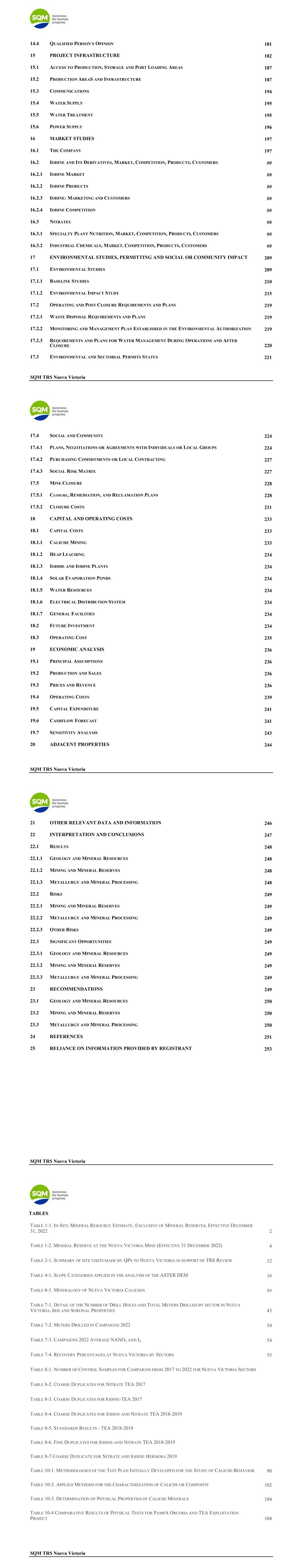 14.4 QUALIFIED PERSON´S OPINION 181 15 PROJECT INFRASTRUCTURE 182 15.1 ACCESS TO PRODUCTION, STORAGE AND PORT LOADING AREAS 187 15.2 PRODUCTION AREAS AND INFRASTRUCTURE 187 15.3 COMMUNICATIONS 194 15.4 WATER SUPPLY 195 15.5 WATER TREATMENT 195 15.6 POWER SUPPLY 196 16 MARKET STUDIES 197 16.1 THE COMPANY 197 16.2 IODINE AND ITS DERIVATIVES, MARKET, COMPETITION, PRODUCTS, CUSTOMERS ## 16.2.1 IODINE MARKET ## 16.2.2 IODINE PRODUCTS ## 16.2.3 IODINE: MARKETING AND CUSTOMERS ## 16.2.4 IODINE COMPETITION ## 16.3 NITRATES ## 16.3.1 SPECIALTY PLANT NUTRITION, MARKET, COMPETITION, PRODUCTS, CUSTOMERS ## 16.3.2 INDUSTRIAL CHEMICALS, MARKET, COMPETITION, PRODUCTS, CUSTOMERS ## 17 ENVIRONMENTAL STUDIES, PERMITTING AND SOCIAL OR COMMUNITY IMPACT 209 17.1 ENVIRONMENTAL STUDIES 209 17.1.1 BASELINE STUDIES 210 17.1.2 ENVIRONMENTAL IMPACT STUDY 215 17.2 OPERATING AND POST CLOSURE REQUIREMENTS AND PLANS 219 17.2.1 WASTE DISPOSAL REQUIREMENTS AND PLANS 219 17.2.2 MONITORING AND MANAGEMENT PLAN ESTABLISHED IN THE ENVIRONMENTAL AUTHORIZATION 219 17.2.3 REQUIREMENTS AND PLANS FOR WATER MANAGEMENT DURING OPERATIONS AND AFTER CLOSURE 220 17.3 ENVIRONMENTAL AND SECTORIAL PERMITS STATUS 221 SQM TRS Nueva Victoria 17.4 SOCIAL AND COMMUNITY 224 17.4.1 PLANS, NEGOTIATIONS OR AGREEMENTS WITH INDIVIDUALS OR LOCAL GROUPS 224 17.4.2 PURCHASING COMMITMENTS OR LOCAL CONTRACTING 227 17.4.3 SOCIAL RISK MATRIX 227 17.5 MINE CLOSURE 228 17.5.1 CLOSURE, REMEDIATION, AND RECLAMATION PLANS 228 17.5.2 CLOSURE COSTS 231 18 CAPITAL AND OPERATING COSTS 233 18.1 CAPITAL COSTS 233 18.1.1 CALICHE MINING 233 18.1.2 HEAP LEACHING 234 18.1.3 IODIDE AND IODINE PLANTS 234 18.1.4 SOLAR EVAPORATION PONDS 234 18.1.5 WATER RESOURCES 234 18.1.6 ELECTRICAL DISTRIBUTION SYSTEM 234 18.1.7 GENERAL FACILITIES 234 18.2 FUTURE INVESTMENT 234 18.3 OPERATING COST 235 19 ECONOMIC ANALYSIS 236 19.1 PRINCIPAL ASSUMPTIONS 236 19.2 PRODUCTION AND SALES 236 19.3 PRICES AND REVENUE 236 19.4 OPERATING COSTS 239 19.5 CAPITAL EXPENDITURE 241 19.6 CASHFLOW FORECAST 241 19.7 SENSITIVITY ANALYSIS 243 20 ADJACENT PROPERTIES 244 SQM TRS Nueva Victoria 21 OTHER RELEVANT DATA AND INFORMATION 246 22 INTERPRETATION AND CONCLUSIONS 247 22.1 RESULTS 248 22.1.1 GEOLOGY AND MINERAL RESOURCES 248 22.1.2 MINING AND MINERAL RESERVES 248 22.1.3 METALLURGY AND MINERAL PROCESSING 248 22.2 RISKS 249 22.2.1 MINING AND MINERAL RESERVES 249 22.2.2 METALLURGY AND MINERAL PROCESSING 249 22.2.3 OTHER RISKS 249 22.3 SIGNIFICANT OPPORTUNITIES 249 22.3.1 GEOLOGY AND MINERAL RESOURCES 249 22.3.2 MINING AND MINERAL RESERVES 249 22.3.3 METALLURGY AND MINERAL PROCESSING 249 23 RECOMMENDATIONS 249 23.1 GEOLOGY AND MINERAL RESOURCES 250 23.2 MINING AND MINERAL RESERVES 250 23.3 METALLURGY AND MINERAL PROCESSING 250 24 REFERENCES 251 25 RELIANCE ON INFORMATION PROVIDED BY REGISTRANT 253 SQM TRS Nueva Victoria TABLES TABLE 1-1. IN-SITU MINERAL RESOURCE ESTIMATE, EXCLUSIVE OF MINERAL RESERVES, EFFECTIVE DECEMBER 31, 2022 2 TABLE 1-2. MINERAL RESERVE AT THE NUEVA VICTORIA MINE (EFFECTIVE 31 DECEMBER 2022) 4 TABLE 2-1. SUMMARY OF SITE VISITS MADE BY QPS TO NUEVA VICTORIA IN SUPPORT OF TRS REVIEW 12 TABLE 4-1. SLOPE CATEGORIES APPLIED IN THE ANALYSIS OF THE ASTER DEM 16 TABLE 6-1. MINERALOGY OF NUEVA VICTORIA CALICHES ## TABLE 7-1. DETAIL OF THE NUMBER OF DRILL HOLES AND TOTAL METERS DRILLED BY SECTOR IN NUEVA VICTORIA, IRIS AND SORONAL PROPERTIES 43 TABLE 7-2. METERS DRILLED IN CAMPAIGNS 2022 54 TABLE 7-3. CAMPAIGNS 2022 AVERAGE NANO3 AND I2 54 TABLE 7-4. RECOVERY PERCENTAGES AT NUEVA VICTORIA BY SECTORS 55 TABLE 8-1. NUMBER OF CONTROL SAMPLES FOR CAMPAIGNS FROM 2017 TO 2022 FOR NUEVA VICTORIA SECTORS TABLE 8-2. COARSE DUPLICATES FOR NITRATE TEA 2017 TABLE 8-3. COARSE DUPLICATES FOR IODINE-TEA 2017 TABLE 8-4. COARSE DUPLICATES FOR IODINE AND NITRATE TEA 2018-2019 TABLE 8-5. STANDARDS RESULTS - TEA 2018-2019 TABLE 8-6. FINE DUPLICATES FOR IODINE-AND NITRATE TEA 2018-2019 TABLE 8-7 COARSE DUPLICATE FOR NITRATE AND IODINE HERMOSA 2019 TABLE 10-1. METHODOLOGIES OF THE TEST PLAN INITIALLY DEVELOPED FOR THE STUDY OF CALICHE BEHAVIOR 98 TABLE 10-2. APPLIED METHODS FOR THE CHARACTERIZATION OF CALICHE OR COMPOSITE 102 TABLE 10-3. DETERMINATION OF PHYSICAL PROPERTIES OF CALICHE MINERALS 104 TABLE 10-4 COMPARATIVE RESULTS OF PHYSICAL TESTS FOR PAMPA ORCOMA AND TEA EXPLOITATION PROJECT 104 SQM TRS Nueva Victoria