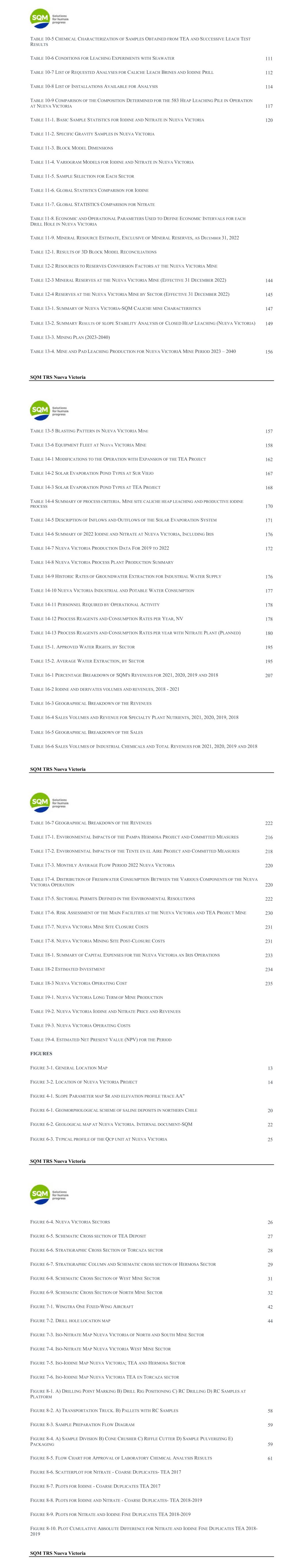 TABLE 10-5 CHEMICAL CHARACTERIZATION OF SAMPLES OBTAINED FROM TEA AND SUCCESSIVE LEACH TEST RESULTS TABLE 10-6 CONDITIONS FOR LEACHING EXPERIMENTS WITH SEAWATER 111 TABLE 10-7 LIST OF REQUESTED ANALYSES FOR CALICHE LEACH BRINES AND IODINE PRILL 112 TABLE 10-8 LIST OF INSTALLATIONS AVAILABLE FOR ANALYSIS 114 TABLE 10-9 COMPARISON OF THE COMPOSITION DETERMINED FOR THE 583 HEAP LEACHING PILE IN OPERATION AT NUEVA VICTORIA 117 TABLE 11-1. BASIC SAMPLE STATISTICS FOR IODINE AND NITRATE IN NUEVA VICTORIA 120 TABLE 11-2. SPECIFIC GRAVITY SAMPLES IN NUEVA VICTORIA TABLE 11-3. BLOCK MODEL DIMENSIONS TABLE 11-4. VARIOGRAM MODELS FOR IODINE AND NITRATE IN NUEVA VICTORIA TABLE 11-5. SAMPLE SELECTION FOR EACH SECTOR TABLE 11-6. GLOBAL STATISTICS COMPARISON FOR IODINE TABLE 11-7. GLOBAL STATISTICS COMPARISON FOR NITRATE TABLE 11-8. ECONOMIC AND OPERATIONAL PARAMETERS USED TO DEFINE ECONOMIC INTERVALS FOR EACH DRILL HOLE IN NUEVA VICTORIA TABLE 11-9. MINERAL RESOURCE ESTIMATE, EXCLUSIVE OF MINERAL RESERVES, AS DECEMBER 31, 2022 TABLE 12-1. RESULTS OF 3D BLOCK MODEL RECONCILIATIONS TABLE 12-2 RESOURCES TO RESERVES CONVERSION FACTORS AT THE NUEVA VICTORIA MINE TABLE 12-3 MINERAL RESERVES AT THE NUEVA VICTORIA MINE (EFFECTIVE 31 DECEMBER 2022) 144 TABLE 12-4 RESERVES AT THE NUEVA VICTORIA MINE BY SECTOR (EFFECTIVE 31 DECEMBER 2022) 145 TABLE 13-1. SUMMARY OF NUEVA VICTORIA-SQM CALICHE MINE CHARACTERISTICS 147 TABLE 13-2. SUMMARY RESULTS OF SLOPE STABILITY ANALYSIS OF CLOSED HEAP LEACHING (NUEVA VICTORIA) 149 TABLE 13-3. MINING PLAN (2023-2040) TABLE 13-4. MINE AND PAD LEACHING PRODUCTION FOR NUEVA VICTORIA MINE PERIOD 2023 – 2040 156 SQM TRS Nueva Victoria TABLE 13-5 BLASTING PATTERN IN NUEVA VICTORIA MINE 157 TABLE 13-6 EQUIPMENT FLEET AT NUEVA VICTORIA MINE 158 TABLE 14-1 MODIFICATIONS TO THE OPERATION WITH EXPANSION OF THE TEA PROJECT 162 TABLE 14-2 SOLAR EVAPORATION POND TYPES AT SUR VIEJO 167 TABLE 14-3 SOLAR EVAPORATION POND TYPES AT TEA PROJECT 168 TABLE 14-4 SUMMARY OF PROCESS CRITERIA. MINE SITE CALICHE HEAP LEACHING AND PRODUCTIVE IODINE PROCESS 170 TABLE 14-5 DESCRIPTION OF INFLOWS AND OUTFLOWS OF THE SOLAR EVAPORATION SYSTEM 171 TABLE 14-6 SUMMARY OF 2022 IODINE AND NITRATE AT NUEVA VICTORIA, INCLUDING IRIS 176 TABLE 14-7 NUEVA VICTORIA PRODUCTION DATA FOR 2019 TO 2022 172 TABLE 14-8 NUEVA VICTORIA PROCESS PLANT PRODUCTION SUMMARY TABLE 14-9 HISTORIC RATES OF GROUNDWATER EXTRACTION FOR INDUSTRIAL WATER SUPPLY 176 TABLE 14-10 NUEVA VICTORIA INDUSTRIAL AND POTABLE WATER CONSUMPTION 177 TABLE 14-11 PERSONNEL REQUIRED BY OPERATIONAL ACTIVITY 178 TABLE 14-12 PROCESS REAGENTS AND CONSUMPTION RATES PER YEAR, NV 178 TABLE 14-13 PROCESS REAGENTS AND CONSUMPTION RATES PER YEAR WITH NITRATE PLANT (PLANNED) 180 TABLE 15-1. APPROVED WATER RIGHTS, BY SECTOR 195 TABLE 15-2. AVERAGE WATER EXTRACTION, BY SECTOR 195 TABLE 16-1 PERCENTAGE BREAKDOWN OF SQM'S REVENUES FOR 2021, 2020, 2019 AND 2018 207 TABLE 16-2 IODINE AND DERIVATES VOLUMES AND REVENUES, 2018 - 2021 TABLE 16-3 GEOGRAPHICAL BREAKDOWN OF THE REVENUES TABLE 16-4 SALES VOLUMES AND REVENUE FOR SPECIALTY PLANT NUTRIENTS, 2021, 2020, 2019, 2018 TABLE 16-5 GEOGRAPHICAL BREAKDOWN OF THE SALES TABLE 16-6 SALES VOLUMES OF INDUSTRIAL CHEMICALS AND TOTAL REVENUES FOR 2021, 2020, 2019 AND 2018 SQM TRS Nueva Victoria TABLE 16-7 GEOGRAPHICAL BREAKDOWN OF THE REVENUES 222 TABLE 17-1. ENVIRONMENTAL IMPACTS OF THE PAMPA HERMOSA PROJECT AND COMMITTED MEASURES 216 TABLE 17-2. ENVIRONMENTAL IMPACTS OF THE TENTE EN EL AIRE PROJECT AND COMMITTED MEASURES 218 TABLE 17-3. MONTHLY AVERAGE FLOW PERIOD 2022 NUEVA VICTORIA 220 TABLE 17-4. DISTRIBUTION OF FRESHWATER CONSUMPTION BETWEEN THE VARIOUS COMPONENTS OF THE NUEVA VICTORIA OPERATION 220 TABLE 17-5. SECTORIAL PERMITS DEFINED IN THE ENVIRONMENTAL RESOLUTIONS 222 TABLE 17-6. RISK ASSESSMENT OF THE MAIN FACILITIES AT THE NUEVA VICTORIA AND TEA PROJECT MINE 230 TABLE 17-7. NUEVA VICTORIA MINE SITE CLOSURE COSTS 231 TABLE 17-8. NUEVA VICTORIA MINING SITE POST-CLOSURE COSTS 231 TABLE 18-1. SUMMARY OF CAPITAL EXPENSES FOR THE NUEVA VICTORIA AN IRIS OPERATIONS 233 TABLE 18-2 ESTIMATED INVESTMENT 234 TABLE 18-3 NUEVA VICTORIA OPERATING COST 235 TABLE 19-1. NUEVA VICTORIA LONG TERM OF MINE PRODUCTION TABLE 19-2. NUEVA VICTORIA IODINE AND NITRATE PRICE AND REVENUES TABLE 19-3. NUEVA VICTORIA OPERATING COSTS TABLE 19-4. ESTIMATED NET PRESENT VALUE (NPV) FOR THE PERIOD FIGURES FIGURE 3-1. GENERAL LOCATION MAP 13 FIGURE 3-2. LOCATION OF NUEVA VICTORIA PROJECT 14 FIGURE 4-1. SLOPE PARAMETER MAP SR AND ELEVATION PROFILE TRACE AA" FIGURE 6-1. GEOMORPHOLOGICAL SCHEME OF SALINE DEPOSITS IN NORTHERN CHILE 20 FIGURE 6-2. GEOLOGICAL MAP AT NUEVA VICTORIA. INTERNAL DOCUMENT-SQM 22 FIGURE 6-3. TYPICAL PROFILE OF THE QCP UNIT AT NUEVA VICTORIA 25 SQM TRS Nueva Victoria FIGURE 6-4. NUEVA VICTORIA SECTORS 26 FIGURE 6-5. SCHEMATIC CROSS SECTION OF TEA DEPOSIT 27 FIGURE 6-6. STRATIGRAPHIC CROSS SECTION OF TORCAZA SECTOR 28 FIGURE 6-7. STRATIGRAPHIC COLUMN AND SCHEMATIC CROSS SECTION OF HERMOSA SECTOR 29 FIGURE 6-8. SCHEMATIC CROSS SECTION OF WEST MINE SECTOR 31 FIGURE 6-9. SCHEMATIC CROSS SECTION OF NORTH MINE SECTOR 32 FIGURE 7-1. WINGTRA ONE FIXED-WING AIRCRAFT 42 FIGURE 7-2. DRILL HOLE LOCATION MAP 44 FIGURE 7-3. ISO-NITRATE MAP NUEVA VICTORIA OF NORTH AND SOUTH MINE SECTOR FIGURE 7-4. ISO-NITRATE MAP NUEVA VICTORIA WEST MINE SECTOR FIGURE 7-5. ISO-IODINE MAP NUEVA VICTORIA; TEA AND HERMOSA SECTOR FIGURE 7-6. ISO-IODINE MAP NUEVA VICTORIA TEA EN TORCAZA SECTOR FIGURE 8-1. A) DRILLING POINT MARKING B) DRILL RIG POSITIONING C) RC DRILLING D) RC SAMPLES AT PLATFORM FIGURE 8-2. A) TRANSPORTATION TRUCK. B) PALLETS WITH RC SAMPLES 58 FIGURE 8-3. SAMPLE PREPARATION FLOW DIAGRAM 59 FIGURE 8-4. A) SAMPLE DIVISION B) CONE CRUSHER C) RIFFLE CUTTER D) SAMPLE PULVERIZING E) PACKAGING 59 FIGURE 8-5. FLOW CHART FOR APPROVAL OF LABORATORY CHEMICAL ANALYSIS RESULTS 61 FIGURE 8-6. SCATTERPLOT FOR NITRATE - COARSE DUPLICATES- TEA 2017 FIGURE 8-7. PLOTS FOR IODINE 