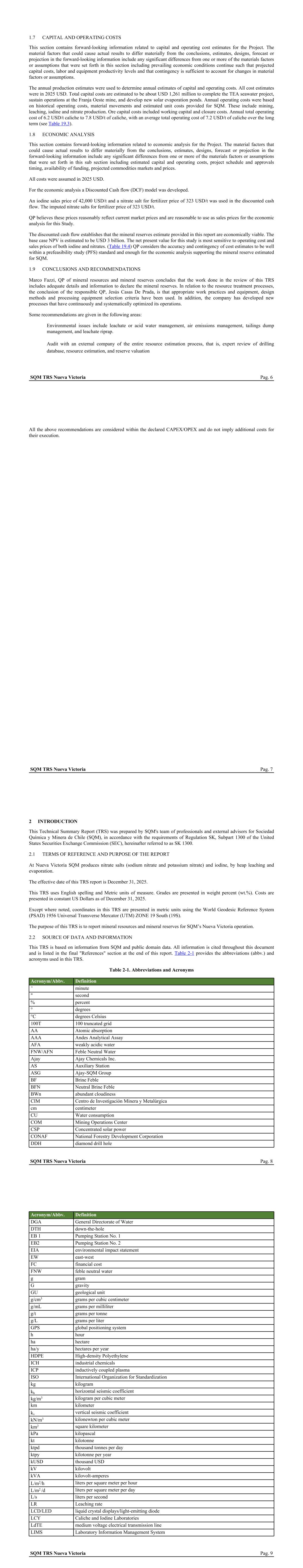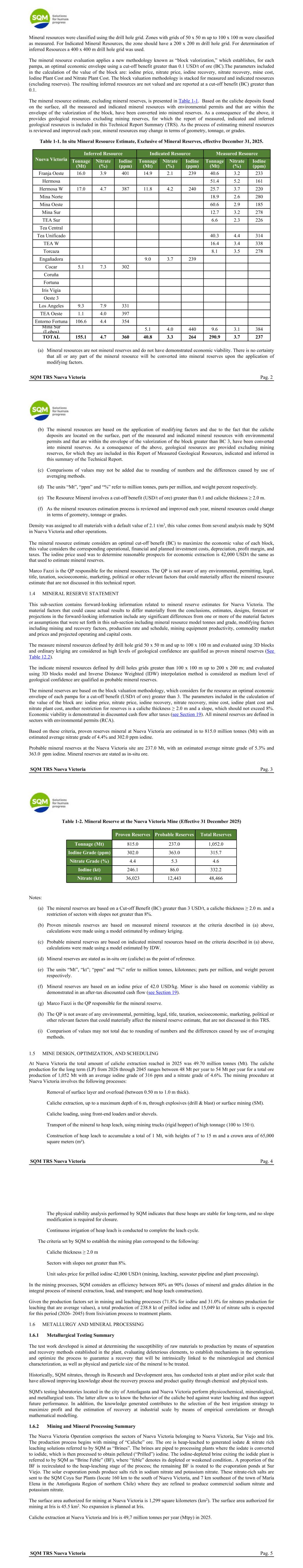 1.7 CAPITAL AND OPERATING COSTS This section contains forward-looking information related to capital and operating cost estimates for the Project. The material factors that could cause actual results to differ materially from the conclusions, estimates, designs, forecast or projection in the forward-looking information include any significant differences from one or more of the materials factors or assumptions that were set forth in this section including prevailing economic conditions continue such that projected capital costs, labor and equipment productivity levels and that contingency is sufficient to account for changes in material factors or assumptions. The annual production estimates were used to determine annual estimates of capital and operating costs. All cost estimates were in 2025 USD. Total capital costs are estimated to be about USD 1,261 million to complete the TEA seawater project, sustain operations at the Franja Oeste mine, and develop new solar evaporation ponds. Annual operating costs were based on historical operating costs, material movements and estimated unit costs provided for SQM. These include mining, leaching, iodine and nitrate production. Ore capital costs included working capital and closure costs. Annual total operating cost of 6.2 USD/t caliche to 7.8 USD/t of caliche, with an average total operating cost of 7.2 USD/t of caliche over the long term (see Table 19.3). 1.8 ECONOMIC ANALYSIS This section contains forward-looking information related to economic analysis for the Project. The material factors that could cause actual results to differ materially from the conclusions, estimates, designs, forecast or projection in the forward-looking information include any significant differences from one or more of the materials factors or assumptions that were set forth in this sub section including estimated capital and operating costs, project schedule and approvals timing, availability of funding, projected commodities markets and prices. All costs were assumed in 2025 USD. For the economic analysis a Discounted Cash flow (DCF) model was developed. An iodine sales price of 42,000 USD/t and a nitrate salt for fertilizer price of 323 USD/t was used in the discounted cash flow. The imputed nitrate salts for fertilizer price of 323 USD/t. QP believes these prices reasonably reflect current market prices and are reasonable to use as sales prices for the economic analysis for this Study. The discounted cash flow establishes that the mineral reserves estimate provided in this report are economically viable. The base case NPV is estimated to be USD 3 billion. The net present value for this study is most sensitive to operating cost and sales prices of both iodine and nitrates. (Table 19.4) QP considers the accuracy and contingency of cost estimates to be well within a prefeasibility study (PFS) standard and enough for the economic analysis supporting the mineral reserve estimated for SQM. 1.9 CONCLUSIONS AND RECOMMENDATIONS Marco Fazzi, QP of mineral resources and mineral reserves concludes that the work done in the review of this TRS includes adequate details and information to declare the mineral reserves. In relation to the resource treatment processes, the conclusion of the responsible QP, Jesús Casas De Prada, is that appropriate work practices and equipment, design methods and processing equipment selection criteria have been used. In addition, the company has developed new processes that have continuously and systematically optimized its operations. Some recommendations are given in the following areas: Environmental issues include leachate or acid water management, air emissions management, tailings dump management, and leachate riprap. Audit with an external company of the entire resource estimation process, that is, expert review of drilling database, resource estimation, and reserve valuation SQM TRS Nueva Victoria Pag. 6 All the above recommendations are considered within the declared CAPEX/OPEX and do not imply additional costs for their execution. SQM TRS Nueva Victoria Pag. 7 2 INTRODUCTION This Technical Summary Report (TRS) was prepared by SQM's team of professionals and external advisors for Sociedad Química y Minera de Chile (SQM), in accordance with the requirements of Regulation SK, Subpart 1300 of the United States Securities Exchange Commission (SEC), hereinafter referred to as SK 1300. 2.1 TERMS OF REFERENCE AND PURPOSE OF THE REPORT At Nueva Victoria SQM produces nitrate salts (sodium nitrate and potassium nitrate) and iodine, by heap leaching and evaporation. The effective date of this TRS report is December 31, 2025. This TRS uses English spelling and Metric units of measure. Grades are presented in weight percent (wt.%). Costs are presented in constant US Dollars as of December 31, 2025. Except where noted, coordinates in this TRS are presented in metric units using the World Geodesic Reference System (PSAD) 1956 Universal Transverse Mercator (UTM) ZONE 19 South (19S). The purpose of this TRS is to report mineral resources and mineral reserves for SQM’s Nueva Victoria operation. 2.2 SOURCE OF DATA AND INFORMATION This TRS is based on information from SQM and public domain data. All information is cited throughout this document and is listed in the final "References" section at the end of this report. Table 2-1 provides the abbreviations (abbv.) and acronyms used in this TRS. Table 2-1. Abbreviations and Acronyms ' minute " second % percent ° degrees °C degrees Celsius 100T 100 truncated grid AA Atomic absorption AAA Andes Analytical Assay AFA weakly acidic water FNW/AFN Feble Neutral Water Ajay Ajay Chemicals Inc. AS Auxiliary Station ASG Ajay-SQM Group BF Brine Feble BFN Neutral Brine Feble BWn abundant cloudiness CIM Centro de Investigación Minera y Metalúrgica cm centimeter CU Water consumption COM Mining Operations Center CSP Concentrated solar power CONAF National Forestry Development Corporation DDH diamond drill hole Acronym/