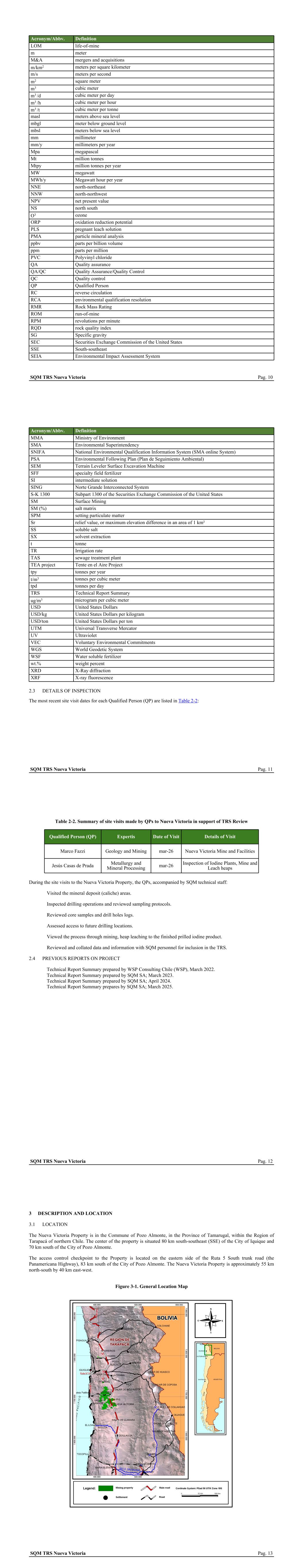 LOM life-of-mine m meter M&A mergers and acquisitions m/km2 meters per square kilometer m/s meters per second m2 square meter m3 cubic meter m3 /d cubic meter per day m3 /h cubic meter per hour m3 /t cubic meter per tonne masl meters above sea level mbgl meter below ground level mbsl meters below sea level mm millimeter mm/y millimeters per year Mpa megapascal Mt million tonnes Mtpy million tonnes per year MW megawatt MWh/y Megawatt hour per year NNE north-northeast NNW north-northwest NPV net present value NS north south O3 ozone ORP oxidation reduction potential PLS pregnant leach solution PMA particle mineral analysis ppbv parts per billion volume ppm parts per million PVC Polyvinyl chloride QA Quality assurance QA/QC Quality Assurance/Quality Control QC Quality control QP Qualified Person RC reverse circulation RCA environmental qualification resolution RMR Rock Mass Rating ROM run-of-mine RPM revolutions per minute RQD rock quality index SG Specific gravity SEC Securities Exchange Commission of the United States SSE South-southeast SEIA Environmental Impact Assessment System Acronym/Abbv. Definition SQM TRS Nueva Victoria Pag. 10 MMA Ministry of Environment SMA Environmental Superintendency SNIFA National Environmental Qualification Information System (SMA online System) PSA Environmental Following Plan (Plan de Seguimiento Ambiental) SEM Terrain Leveler Surface Excavation Machine SFF specialty field fertilizer SI intermediate solution SING Norte Grande Interconnected System S-K 1300 Subpart 1300 of the Securities Exchange Commission of the United States SM Surface Mining SM (%) salt matrix SPM setting particulate matter Sr relief value, or maximum elevation difference in an area of 1 km² SS soluble salt SX solvent extraction t tonne TR Irrigation rate TAS sewage treatment plant TEA project Tente en el Aire Project tpy tonnes per year t/m3 tonnes per cubic meter tpd tonnes per day TRS Technical Report Summary ug/m3 microgram per cubic meter USD United States Dollars USD/kg United States Dollars per kilogram USD/ton United States Dollars per ton UTM Universal Transverse Mercator UV Ultraviolet VEC Voluntary Environmental Commitments WGS World Geodetic System WSF Water soluble fertilizer wt.% weight percent XRD X-Ray diffraction XRF X-ray fluorescence Acronym/Abbv. Definition 2.3 DETAILS OF INSPECTION The most recent site visit dates for each Qualified Person (QP) are listed in Table 2-2: SQM TRS Nueva Victoria Pag. 11 Table 2-2. Summary of site visits made by QPs to Nueva Victoria in support of TRS Review Qualified Person (QP) Expertis Date of Visit Details of Visit Marco Fazzi Geology and Mining mar-26 Nueva Victoria Mine and Facilities Jesús Casas de Prada Metallurgy and Mineral Processing mar-26 Inspection of Iodine Plants, Mine and Leach heaps During the site visits to the Nueva Victoria Property, the QPs, accompanied by SQM technical staff: Visited the mineral deposit (caliche) areas. Inspected drilling operations and reviewed sampling protocols. Reviewed core samples and drill holes logs. Assessed access to future drilling locations. Viewed the process through mining, heap leaching to the finished prilled iodine product. Reviewed and collated data and information with SQM personnel for inclusion in the TRS. 2.4 PREVIOUS REPORTS ON PROJECT Technical Report Summary prepared by WSP Consulting Chile (WSP), March 2022. Technical Report Summary prepared by SQM SA; March 2023. Technical Report Summary prepared by SQM SA; April 2024. Technical Report Summary prepares by SQM SA; March 2025. SQM TRS Nueva Victoria Pag. 12 3 DESCRIPTION AND LOCATION 3.1 LOCATION The Nueva Victoria Property is in the Commune of Pozo Almonte, in the Province of Tamarugal, within the Region of Tarapacá of northern Chile. The center of the property is situated 80 km south-southeast (SSE) of the City of Iquique and 70 km south of the City of Pozo Almonte. The access control checkpoint to the Property is located on the eastern side of the Ruta 5 South trunk road (the Panamericana Highway), 83 km south of the City of Pozo Almonte. The Nueva Victoria Property is approximately 55 km north-south by 40 km east-west. Figure 3-1. General Location Map SQM TRS Nueva Victoria Pag. 13