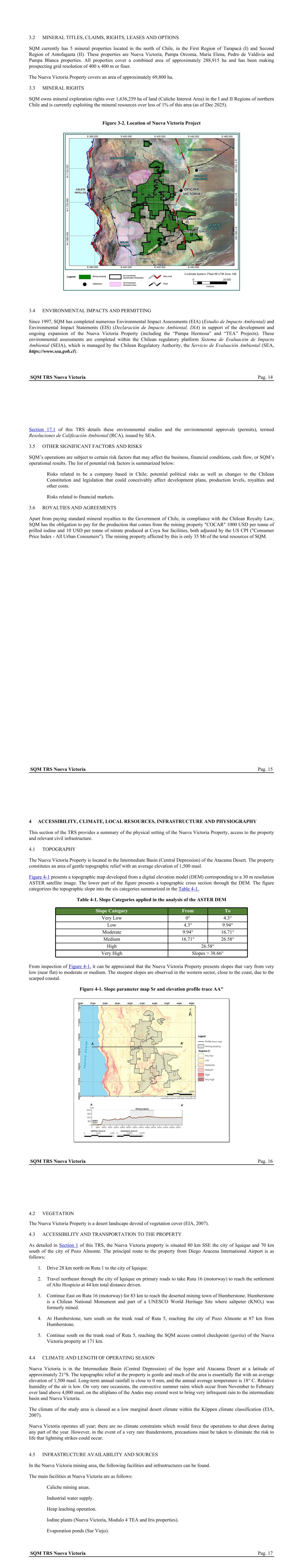3.2 MINERAL TITLES, CLAIMS, RIGHTS, LEASES AND OPTIONS SQM currently has 5 mineral properties located in the north of Chile, in the First Region of Tarapacá (I) and Second Region of Antofagasta (II). These properties are Nueva Victoria, Pampa Orcoma, María Elena, Pedro de Valdivia and Pampa Blanca properties. All properties cover a combined area of approximately 288,915 ha and has been making prospecting grid resolution of 400 x 400 m or finer. The Nueva Victoria Property covers an area of approximately 69,800 ha. 3.3 MINERAL RIGHTS SQM owns mineral exploration rights over 1,636,259 ha of land (Caliche Interest Area) in the I and II Regions of northern Chile and is currently exploiting the mineral resources over less of 1% of this area (as of Dec 2025). Figure 3-2. Location of Nueva Victoria Project 3.4 ENVIRONMENTAL IMPACTS AND PERMITTING Since 1997, SQM has completed numerous Environmental Impact Assessments (EIA) (Estudio de Impacto Ambiental) and Environmental Impact Statements (EIS) (Declaración de Impacto Ambiental, DIA) in support of the development and ongoing expansion of the Nueva Victoria Property (including the “Pampa Hermosa” and “TEA” Projects). These environmental assessments are completed within the Chilean regulatory platform Sistema de Evaluación de Impacto Ambiental (SEIA), which is managed by the Chilean Regulatory Authority, the Servicio de Evaluación Ambiental (SEA, https://www.sea.gob.cl). SQM TRS Nueva Victoria Pag. 14 Section 17.1 of this TRS details these environmental studies and the environmental approvals (permits), termed Resoluciones de Calificación Ambiental (RCA), issued by SEA. 3.5 OTHER SIGNIFICANT FACTORS AND RISKS SQM’s operations are subject to certain risk factors that may affect the business, financial conditions, cash flow, or SQM’s operational results. The list of potential risk factors is summarized below: Risks related to be a company based in Chile; potential political risks as well as changes to the Chilean Constitution and legislation that could conceivably affect development plans, production levels, royalties and other costs. Risks related to financial markets. 3.6 ROYALTIES AND AGREEMENTS Apart from paying standard mineral royalties to the Government of Chile, in compliance with the Chilean Royalty Law, SQM has the obligation to pay for the production that comes from the mining property "COCAR" 1000 USD per tonne of prilled iodine and 10 USD per tonne of nitrate produced at Coya Sur facilities, both adjusted by the US CPI ("Consumer Price Index - All Urban Consumers"). The mining property affected by this is only 35 Mt of the total resources of SQM. SQM TRS Nueva Victoria Pag. 15 4 ACCESSIBILITY, CLIMATE, LOCAL RESOURCES, INFRASTRUCTURE AND PHYSIOGRAPHY This section of the TRS provides a summary of the physical setting of the Nueva Victoria Property, access to the property and relevant civil infrastructure. 4.1 TOPOGRAPHY The Nueva Victoria Property is located in the Intermediate Basin (Central Depression) of the Atacama Desert. The property constitutes an area of gentle topographic relief with an average elevation of 1,500 masl. Figure 4-1 presents a topographic map developed from a digital elevation model (DEM) corresponding to a 30 m resolution ASTER satellite image. The lower part of the figure presents a topographic cross section through the DEM. The figure categorizes the topographic slope into the six categories summarized in the Table 4-1. Table 4-1. Slope Categories applied in the analysis of the ASTER DEM Slope Category From To Very Low 0° 4.3° Low 4.3° 9.94° Moderate 9.94° 16.71° Medium 16.71° 26.58° High 26.58° Very High Slopes > 38.66° From inspection of Figure 4-1, it can be appreciated that the Nueva Victoria Property presents slopes that vary from very low (near flat) to moderate or medium. The steepest slopes are observed in the western sector, close to the coast, due to the scarped coastal. Figure 4-1. Slope parameter map Sr and elevation profile trace AA" SQM TRS Nueva Victoria Pag. 16 4.2 VEGETATION The Nueva Victoria Property is a desert landscape devoid of vegetation cover (EIA, 2007). 4.3 ACCESSIBILITY AND TRANSPORTATION TO THE PROPERTY As detailed in Section 1 of this TRS, the Nueva Victoria property is situated 80 km SSE the city of Iquique and 70 km south of the city of Pozo Almonte. The principal route to the property from Diego Aracena International Airport is as follows: 1. Drive 28 km north on Ruta 1 to the city of Iquique. 2. Travel northeast through the city of Iquique on primary roads to take Ruta 16 (motorway) to reach the settlement of Alto Hospicio at 44 km total distance driven. 3. Continue East on Ruta 16 (motorway) for 83 km to reach the deserted mining town of Humberstone. Humberstone is a Chilean National Monument and part of a UNESCO World Heritage Site where saltpeter (KNO3) was formerly mined. 4. At Humberstone, turn south on the trunk road of Ruta 5, reaching the city of Pozo Almonte at 87 km from Humberstone. 5. Continue south on the trunk road of Ruta 5, reaching the SQM access control checkpoint (garita) of the Nueva Victoria property at 171 km. 4.4 CLIMATE AND LENGTH OF OPERATING SEASON Nueva Victoria is in the Intermediate Basin (Central Depression) of the hyper arid Atacama Desert at a latitude of approximately 21°S. The topographic relief at the property is gentle and much of the area is essentially flat with an average elevation of 1,500 masl. Long-term annual rainfall is close to 0 mm, and the annual average temperature is 18° C. Relative humidity of the air is low. On very rare occasions, the convective summer rains which occur from November to February over land above 4,000 masl. on the altiplano of the Andes may extend west to bring very infrequent rain to the intermediate basin and Nueva Victoria. The climate of the study area is classed as a low marginal desert climate within the Köppen climate classification (EIA, 2007). Nueva Victoria operates all 