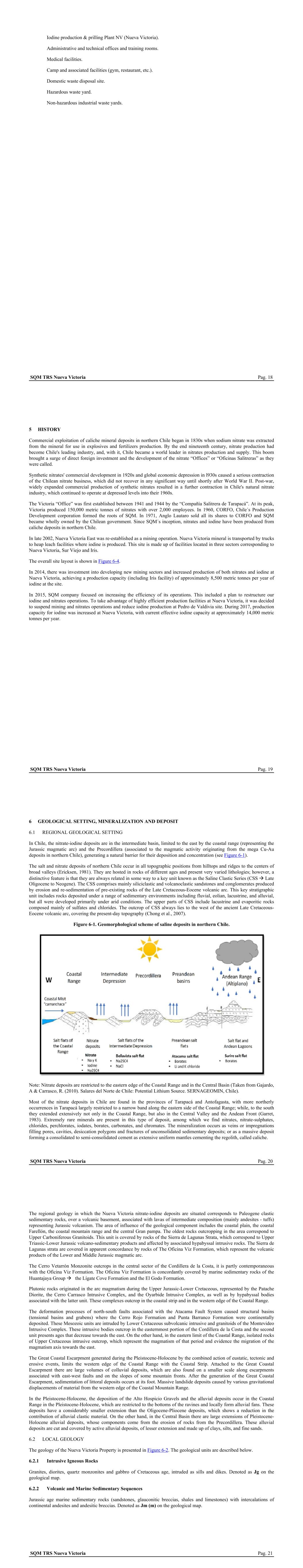 Iodine production & prilling Plant NV (Nueva Victoria). Administrative and technical offices and training rooms. Medical facilities. Camp and associated facilities (gym, restaurant, etc.). Domestic waste disposal site. Hazardous waste yard. Non-hazardous industrial waste yards. SQM TRS Nueva Victoria Pag. 18 5 HISTORY Commercial exploitation of caliche mineral deposits in northern Chile began in 1830s when sodium nitrate was extracted from the mineral for use in explosives and fertilizers production. By the end nineteenth century, nitrate production had become Chile's leading industry, and, with it, Chile became a world leader in nitrates production and supply. This boom brought a surge of direct foreign investment and the development of the nitrate “Offices” or “Oficinas Salitreras” as they were called. Synthetic nitrates' commercial development in 1920s and global economic depression in l930s caused a serious contraction of the Chilean nitrate business, which did not recover in any significant way until shortly after World War II. Post-war, widely expanded commercial production of synthetic nitrates resulted in a further contraction in Chile's natural nitrate industry, which continued to operate at depressed levels into their 1960s. The Victoria “Office” was first established between 1941 and 1944 by the “Compañía Salitrera de Tarapacá”. At its peak, Victoria produced 150,000 metric tonnes of nitrates with over 2,000 employees. In 1960, CORFO, Chile´s Production Development corporation formed the roots of SQM. In 1971, Anglo Lautaro sold all its shares to CORFO and SQM became wholly owned by the Chilean government. Since SQM´s inception, nitrates and iodine have been produced from caliche deposits in northern Chile. In late 2002, Nueva Victoria East was re-established as a mining operation. Nueva Victoria mineral is transported by trucks to heap leach facilities where iodine is produced. This site is made up of facilities located in three sectors corresponding to Nueva Victoria, Sur Viejo and Iris. The overall site layout is shown in Figure 6-4. In 2014, there was investment into developing new mining sectors and increased production of both nitrates and iodine at Nueva Victoria, achieving a production capacity (including Iris facility) of approximately 8,500 metric tonnes per year of iodine at the site. In 2015, SQM company focused on increasing the efficiency of its operations. This included a plan to restructure our iodine and nitrates operations. To take advantage of highly efficient production facilities at Nueva Victoria, it was decided to suspend mining and nitrates operations and reduce iodine production at Pedro de Valdivia site. During 2017, production capacity for iodine was increased at Nueva Victoria, with current effective iodine capacity at approximately 14,000 metric tonnes per year. SQM TRS Nueva Victoria Pag. 19 6 GEOLOGICAL SETTING, MINERALIZATION AND DEPOSIT 6.1 REGIONAL GEOLOGICAL SETTING In Chile, the nitrate-iodine deposits are in the intermediate basin, limited to the east by the coastal range (representing the Jurassic magmatic arc) and the Precordillera (associated to the magmatic activity originating from the mega Cu-Au deposits in northern Chile), generating a natural barrier for their deposition and concentration (see Figure 6-1). The salt and nitrate deposits of northern Chile occur in all topographic positions from hilltops and ridges to the centers of broad valleys (Ericksen, 1981). They are hosted in rocks of different ages and present very varied lithologies; however, a distinctive feature is that they are always related in some way to a key unit known as the Saline Clastic Series (CSS à Late Oligocene to Neogene). The CSS comprises mainly siliciclastic and volcanoclastic sandstones and conglomerates produced by erosion and re-sedimentation of pre-existing rocks of the Late Cretaceous-Eocene volcanic arc. This key stratigraphic unit includes rocks deposited under a range of sedimentary environments including fluvial, eolian, lacustrine, and alluvial, but all were developed primarily under arid conditions. The upper parts of CSS include lacustrine and evaporitic rocks composed mainly of sulfates and chlorides. The outcrop of CSS always lies to the west of the ancient Late Cretaceous- Eocene volcanic arc, covering the present-day topography (Chong et al., 2007). Figure 6-1. Geomorphological scheme of saline deposits in northern Chile. Note: Nitrate deposits are restricted to the eastern edge of the Coastal Range and in the Central Basin (Taken from Gajardo, A & Carrasco, R. (2010). Salares del Norte de Chile: Potential Lithium Source. SERNAGEOMIN, Chile). Most of the nitrate deposits in Chile are found in the provinces of Tarapacá and Antofagasta, with more northerly occurrences in Tarapacá largely restricted to a narrow band along the eastern side of the Coastal Range; while, to the south they extended extensively not only in the Coastal Range, but also in the Central Valley and the Andean Front (Garret, 1983). Extremely rare minerals are present in this type of deposit, among which we find nitrates, nitrate-sulphates, chlorides, perchlorates, iodates, borates, carbonates, and chromates. The mineralization occurs as veins or impregnations filling pores, cavities, desiccation polygons and fractures of unconsolidated sedimentary deposits; or as a massive deposit forming a consolidated to semi-consolidated cement as extensive uniform mantles cementing the regolith, called caliche. SQM TRS Nueva Victoria Pag. 20 The regional geology in which the Nueva Victoria nitrate-iodine deposits are situated corresponds to Paleogene clastic sedimentary rocks, over a volcanic basement, associated with lavas of intermediate composition (mainly andesites - tuffs) representing Jurassic volcanism. The area of influence of the geological component includes the coastal plain, the coastal Farellón, the coastal mountain range and the central Gran pampa.