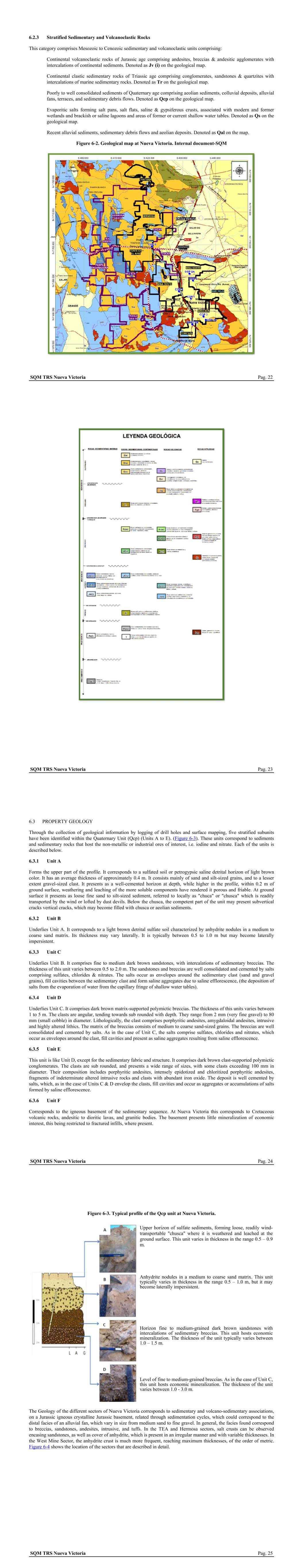 6.2.3 Stratified Sedimentary and Volcanoclastic Rocks This category comprises Mesozoic to Cenozoic sedimentary and volcanoclastic units comprising: Continental volcanoclastic rocks of Jurassic age comprising andesites, breccias & andesitic agglomerates with intercalations of continental sediments. Denoted as Jv (i) on the geological map. Continental clastic sedimentary rocks of Triassic age comprising conglomerates, sandstones & quartzites with intercalations of marine sedimentary rocks. Denoted as Tr on the geological map. Poorly to well consolidated sediments of Quaternary age comprising aeolian sediments, colluvial deposits, alluvial fans, terraces, and sedimentary debris flows. Denoted as Qcp on the geological map. Evaporitic salts forming salt pans, salt flats, saline & gypsiferous crusts, associated with modern and former wetlands and brackish or saline lagoons and areas of former or current shallow water tables. Denoted as Qs on the geological map. Recent alluvial sediments, sedimentary debris flows and aeolian deposits. Denoted as Qal on the map. Figure 6-2. Geological map at Nueva Victoria. Internal document-SQM SQM TRS Nueva Victoria Pag. 22 SQM TRS Nueva Victoria Pag. 23 6.3 PROPERTY GEOLOGY Through the collection of geological information by logging of drill holes and surface mapping, five stratified subunits have been identified within the Quaternary Unit (Qcp) (Units A to E). (Figure 6-3). These units correspond to sediments and sedimentary rocks that host the non-metallic or industrial ores of interest, i.e. iodine and nitrate. Each of the units is described below. 6.3.1 Unit A Forms the upper part of the profile. It corresponds to a sulfated soil or petrogypsic saline detrital horizon of light brown color. It has an average thickness of approximately 0.4 m. It consists mainly of sand and silt-sized grains, and to a lesser extent gravel-sized clast. It presents as a well-cemented horizon at depth, while higher in the profile, within 0.2 m of ground surface, weathering and leaching of the more soluble components have rendered it porous and friable. At ground surface it presents as loose fine sand to silt-sized sediment, referred to locally as "chuca" or "chusca" which is readily transported by the wind or lofted by dust devils. Below the chusca, the competent part of the unit may present subvertical cracks vertical cracks, which may become filled with chusca or aeolian sediments. 6.3.2 Unit B Underlies Unit A. It corresponds to a light brown detrital sulfate soil characterized by anhydrite nodules in a medium to coarse sand matrix. Its thickness may vary laterally. It is typically between 0.5 to 1.0 m but may become laterally impersistent. 6.3.3 Unit C Underlies Unit B. It comprises fine to medium dark brown sandstones, with intercalations of sedimentary breccias. The thickness of this unit varies between 0.5 to 2.0 m. The sandstones and breccias are well consolidated and cemented by salts comprising sulfates, chlorides & nitrates. The salts occur as envelopes around the sedimentary clast (sand and gravel grains), fill cavities between the sedimentary clast and form saline aggregates due to saline efflorescence, (the deposition of salts from the evaporation of water from the capillary fringe of shallow water tables). 6.3.4 Unit D Underlies Unit C. It comprises dark brown matrix-supported polymictic breccias. The thickness of this units varies between 1 to 5 m. The clasts are angular, tending towards sub rounded with depth. They range from 2 mm (very fine gravel) to 80 mm (small cobble) in diameter. Lithologically, the clast comprises porphyritic andesites, amygdaloidal andesites, intrusive and highly altered lithics. The matrix of the breccias consists of medium to coarse sand-sized grains. The breccias are well consolidated and cemented by salts. As in the case of Unit C, the salts comprise sulfates, chlorides and nitrates, which occur as envelopes around the clast, fill cavities and present as saline aggregates resulting from saline efflorescence. 6.3.5 Unit E This unit is like Unit D, except for the sedimentary fabric and structure. It comprises dark brown clast-supported polymictic conglomerates. The clasts are sub rounded, and presents a wide range of sizes, with some clasts exceeding 100 mm in diameter. Their composition includes porphyritic andesites, intensely epidotized and chloritized porphyritic andesites, fragments of indeterminate altered intrusive rocks and clasts with abundant iron oxide. The deposit is well cemented by salts, which, as in the case of Units C & D envelop the clasts, fill cavities and occur as aggregates or accumulations of salts formed by saline efflorescence. 6.3.6 Unit F Corresponds to the igneous basement of the sedimentary sequence. At Nueva Victoria this corresponds to Cretaceous volcanic rocks, andesitic to dioritic lavas, and granitic bodies. The basement presents little mineralization of economic interest, this being restricted to fractured infills, where present. SQM TRS Nueva Victoria Pag. 24 Figure 6-3. Typical profile of the Qcp unit at Nueva Victoria. Upper horizon of sulfate sediments, forming loose, readily wind- transportable "chusca" where it is weathered and leached at the ground surface. This unit varies in thickness in the range 0.5 – 0.9 m. Anhydrite nodules in a medium to coarse sand matrix. This unit typically varies in thickness in the range 0.5 – 1.0 m, but it may become laterally impersistent. Horizon fine to medium-grained dark brown sandstones with intercalations of sedimentary breccias. This unit hosts economic mineralization. The thickness of the unit typically varies between 1.0 – 1.5 m. Level of fine to medium-grained breccias. As in the case of Unit C, this unit hosts economic mineralization. The thickness of the unit varies between 1.0 - 3.0 m. The Geology of the different sectors of Nueva Victoria corresponds to sedimentary and volcano-sedimentary associations, on a Jurassic igneous crystalline Jurassi