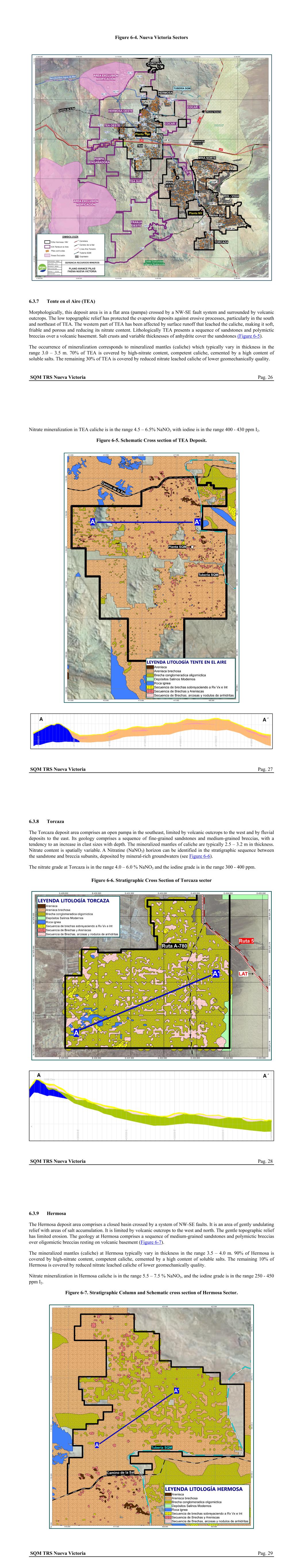 Figure 6-4. Nueva Victoria Sectors 6.3.7 Tente en el Aire (TEA) Morphologically, this deposit area is in a flat area (pampa) crossed by a NW-SE fault system and surrounded by volcanic outcrops. The low topographic relief has protected the evaporite deposits against erosive processes, particularly in the south and northeast of TEA. The western part of TEA has been affected by surface runoff that leached the caliche, making it soft, friable and porous and reducing its nitrate content. Lithologically TEA presents a sequence of sandstones and polymictic breccias over a volcanic basement. Salt crusts and variable thicknesses of anhydrite cover the sandstones (Figure 6-5). The occurrence of mineralization corresponds to mineralized mantles (caliche) which typically vary in thickness in the range 3.0 – 3.5 m. 70% of TEA is covered by high-nitrate content, competent caliche, cemented by a high content of soluble salts. The remaining 30% of TEA is covered by reduced nitrate leached caliche of lower geomechanically quality. SQM TRS Nueva Victoria Pag. 26 Nitrate mineralization in TEA caliche is in the range 4.5 – 6.5% NaNO3 with iodine is in the range 400 - 430 ppm I2. Figure 6-5. Schematic Cross section of TEA Deposit. SQM TRS Nueva Victoria Pag. 27 6.3.8 Torcaza The Torcaza deposit area comprises an open pampa in the southeast, limited by volcanic outcrops to the west and by fluvial deposits to the east. Its geology comprises a sequence of fine-grained sandstones and medium-grained breccias, with a tendency to an increase in clast sizes with depth. The mineralized mantles of caliche are typically 2.5 – 3.2 m in thickness. Nitrate content is spatially variable. A Nitratine (NaNO₃) horizon can be identified in the stratigraphic sequence between the sandstone and breccia subunits, deposited by mineral-rich groundwaters (see Figure 6-6). The nitrate grade at Torcaza is in the range 4.0 – 6.0 % NaNO3 and the iodine grade is in the range 300 - 400 ppm. Figure 6-6. Stratigraphic Cross Section of Torcaza sector SQM TRS Nueva Victoria Pag. 28 6.3.9 Hermosa The Hermosa deposit area comprises a closed basin crossed by a system of NW-SE faults. It is an area of gently undulating relief with areas of salt accumulation. It is limited by volcanic outcrops to the west and north. The gentle topographic relief has limited erosion. The geology at Hermosa comprises a sequence of medium-grained sandstones and polymictic breccias over oligomictic breccias resting on volcanic basement (Figure 6-7). The mineralized mantles (caliche) at Hermosa typically vary in thickness in the range 3.5 – 4.0 m. 90% of Hermosa is covered by high-nitrate content, competent caliche, cemented by a high content of soluble salts. The remaining 10% of Hermosa is covered by reduced nitrate leached caliche of lower geomechanically quality. Nitrate mineralization in Hermosa caliche is in the range 5.5 – 7.5 % NaNO3, and the iodine grade is in the range 250 - 450 ppm I2. Figure 6-7. Stratigraphic Column and Schematic cross section of Hermosa Sector. SQM TRS Nueva Victoria Pag. 29