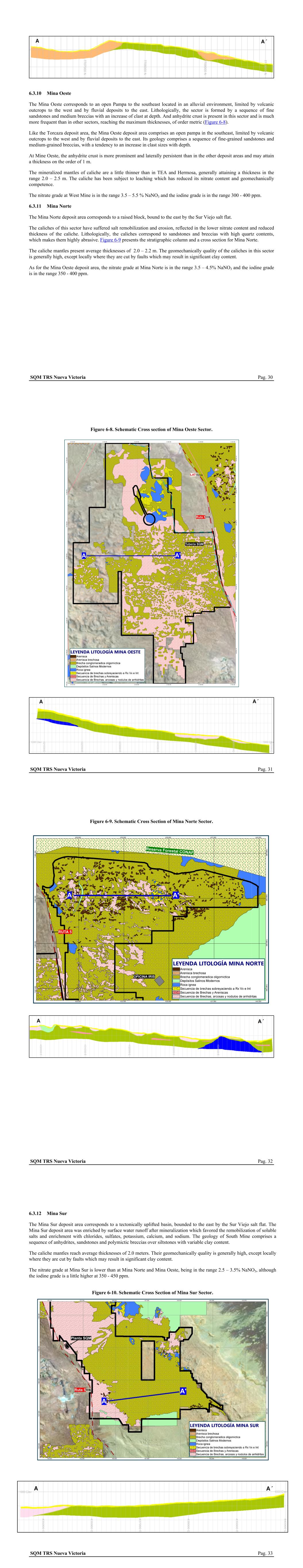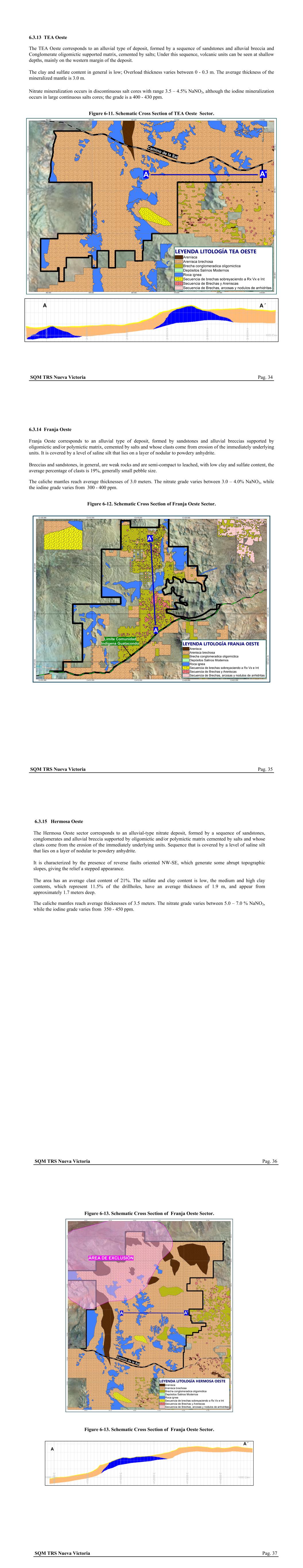 6.3.13 TEA Oeste The TEA Oeste corresponds to an alluvial type of deposit, formed by a sequence of sandstones and alluvial breccia and Conglomerate oligomictic supported matrix, cemented by salts; Under this sequence, volcanic units can be seen at shallow depths, mainly on the western margin of the deposit. The clay and sulfate content in general is low; Overload thickness varies between 0 - 0.3 m. The average thickness of the mineralized mantle is 3.0 m. Nitrate mineralization occurs in discontinuous salt cores with range 3.5 – 4.5% NaNO3, although the iodine mineralization occurs in large continuous salts cores; the grade is a 400 - 430 ppm. Figure 6-11. Schematic Cross Section of TEA Oeste Sector. SQM TRS Nueva Victoria Pag. 34 6.3.14 Franja Oeste Franja Oeste corresponds to an alluvial type of deposit, formed by sandstones and alluvial breccias supported by oligomictic and/or polymictic matrix, cemented by salts and whose clasts come from erosion of the immediately underlying units. It is covered by a level of saline silt that lies on a layer of nodular to powdery anhydrite. Breccias and sandstones, in general, are weak rocks and are semi-compact to leached, with low clay and sulfate content, the average percentage of clasts is 19%, generally small pebble size. The caliche mantles reach average thicknesses of 3.0 meters. The nitrate grade varies between 3.0 – 4.0% NaNO3, while the iodine grade varies from 300 - 400 ppm. Figure 6-12. Schematic Cross Section of Franja Oeste Sector. SQM TRS Nueva Victoria Pag. 35 6.3.15 Hermosa Oeste The Hermosa Oeste sector corresponds to an alluvial-type nitrate deposit, formed by a sequence of sandstones, conglomerates and alluvial breccia supported by oligomictic and/or polymictic matrix cemented by salts and whose clasts come from the erosion of the immediately underlying units. Sequence that is covered by a level of saline silt that lies on a layer of nodular to powdery anhydrite. It is characterized by the presence of reverse faults oriented NW-SE, which generate some abrupt topographic slopes, giving the relief a stepped appearance. The area has an average clast content of 21%. The sulfate and clay content is low, the medium and high clay contents, which represent 11.5% of the drillholes, have an average thickness of 1.9 m, and appear from approximately 1.7 meters deep. The caliche mantles reach average thicknesses of 3.5 meters. The nitrate grade varies between 5.0 – 7.0 % NaNO3, while the iodine grade varies from 350 - 450 ppm. SQM TRS Nueva Victoria Pag. 36 Figure 6-13. Schematic Cross Section of Franja Oeste Sector. Figure 6-13. Schematic Cross Section of Franja Oeste Sector. SQM TRS Nueva Victoria Pag. 37