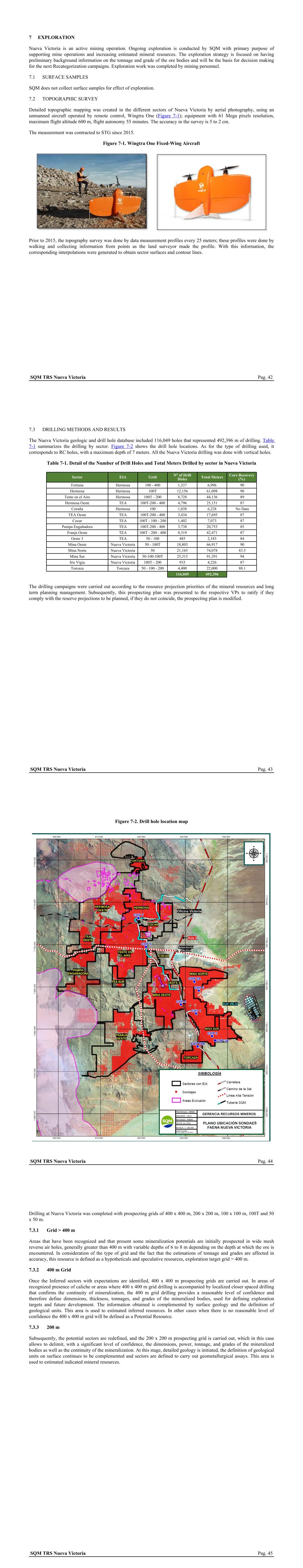 7 EXPLORATION Nueva Victoria is an active mining operation. Ongoing exploration is conducted by SQM with primary purpose of supporting mine operations and increasing estimated mineral resources. The exploration strategy is focused on having preliminary background information on the tonnage and grade of the ore bodies and will be the basis for decision making for the next Recategorization campaigns. Exploration work was completed by mining personnel. 7.1 SURFACE SAMPLES SQM does not collect surface samples for effect of exploration. 7.2 TOPOGRAPHIC SURVEY Detailed topographic mapping was created in the different sectors of Nueva Victoria by aerial photography, using an unmanned aircraft operated by remote control, Wingtra One (Figure 7-1); equipment with 61 Mega pixels resolution, maximum flight altitude 600 m, flight autonomy 55 minutes. The accuracy in the survey is 5 to 2 cm. The measurement was contracted to STG since 2015. Figure 7-1. Wingtra One Fixed-Wing Aircraft Prior to 2015, the topography survey was done by data measurement profiles every 25 meters; these profiles were done by walking and collecting information from points as the land surveyor made the profile. With this information, the corresponding interpolations were generated to obtain sector surfaces and contour lines. SQM TRS Nueva Victoria Pag. 42 7.3 DRILLING METHODS AND RESULTS The Nueva Victoria geologic and drill hole database included 116,049 holes that represented 492,396 m of drilling. Table 7-1 summarizes the drilling by sector. Figure 7-2 shows the drill hole locations. As for the type of drilling used, it corresponds to RC holes, with a maximum depth of 7 meters. All the Nueva Victoria drilling was done with vertical holes. Table 7-1. Detail of the Number of Drill Holes and Total Meters Drilled by sector in Nueva Victoria Sector EIA Grid N° of Drill Holes Total Meters Core Recovery (%) Fortuna Hermosa 100 - 400 1,337 6,996 90 Hermosa Hermosa 100T 12,156 61,098 90 Tente en el Aire Hermosa 100T - 200 8,728 44,136 89 Hermosa Oeste TEA 100T-200 - 400 4,796 25,151 87 Coruña Hermosa 100 1,038 6,228 No Data TEA Oeste TEA 100T-200 - 400 3,434 17,695 87 Cocar TEA 100T - 100 - 200 1,402 7,073 87 Pampa Engañadora TEA 100T-200 - 400 3,738 20,753 85 Franja Oeste TEA 100T - 200 - 400 8,319 42,471 87 Oeste 3 TEA 50 - 100 485 2,183 84 Mina Oeste Nueva Victoria 50 - 100T 18,803 66,917 90 Mina Norte Nueva Victoria 50 21,165 74,078 83.5 Mina Sur Nueva Victoria 50-100-100T 25,315 91,391 94 Iris Vigia Nueva Victoria 100T - 200 933 4,226 87 Torcaza Torcaza 50 - 100 - 200 4,400 22,000 88.1 116,049 492,396 The drilling campaigns were carried out according to the resource projection priorities of the mineral resources and long term planning management. Subsequently, this prospecting plan was presented to the respective VPs to ratify if they comply with the reserve projections to be planned, if they do not coincide, the prospecting plan is modified. SQM TRS Nueva Victoria Pag. 43 Figure 7-2. Drill hole location map SQM TRS Nueva Victoria Pag. 44 Drilling at Nueva Victoria was completed with prospecting grids of 400 x 400 m, 200 x 200 m, 100 x 100 m, 100T and 50 x 50 m. 7.3.1 Grid > 400 m Areas that have been recognized and that present some mineralization potentials are initially prospected in wide mesh reverse air holes, generally greater than 400 m with variable depths of 6 to 8 m depending on the depth at which the ore is encountered. In consideration of the type of grid and the fact that the estimations of tonnage and grades are affected in accuracy, this resource is defined as a hypotheticals and speculative resources, exploration target grid > 400 m. 7.3.2 400 m Grid Once the Inferred sectors with expectations are identified, 400 x 400 m prospecting grids are carried out. In areas of recognized presence of caliche or areas where 400 x 400 m grid drilling is accompanied by localized closer spaced drilling that confirms the continuity of mineralization, the 400 m grid drilling provides a reasonable level of confidence and therefore define dimensions, thickness, tonnages, and grades of the mineralized bodies, used for defining exploration targets and future development. The information obtained is complemented by surface geology and the definition of geological units. This area is used to estimated inferred resources. In other cases when there is no reasonable level of confidence the 400 x 400 m grid will be defined as a Potential Resource. 7.3.3 200 m Subsequently, the potential sectors are redefined, and the 200 x 200 m prospecting grid is carried out, which in this case allows to delimit, with a significant level of confidence, the dimensions, power, tonnage, and grades of the mineralized bodies as well as the continuity of the mineralization. At this stage, detailed geology is initiated, the definition of geological units on surface continues to be complemented and sectors are defined to carry out geometallurgical assays. This area is used to estimated indicated mineral resources. SQM TRS Nueva Victoria Pag. 45