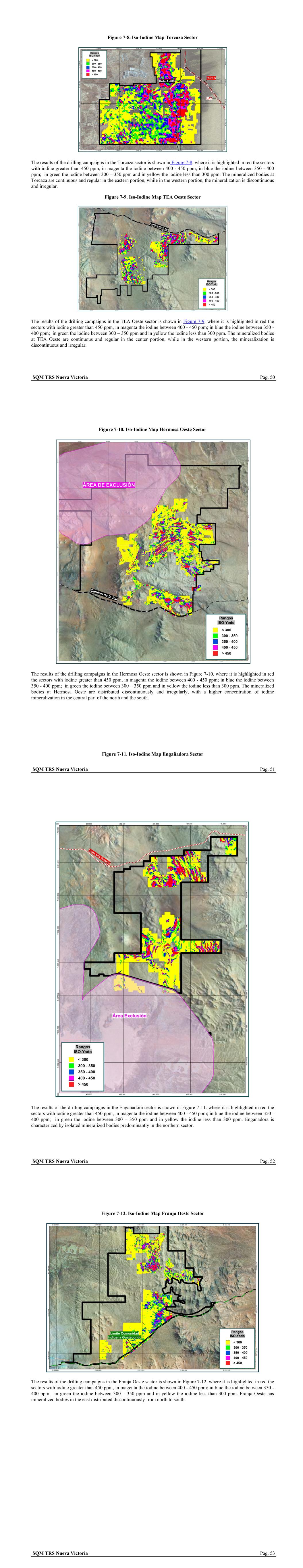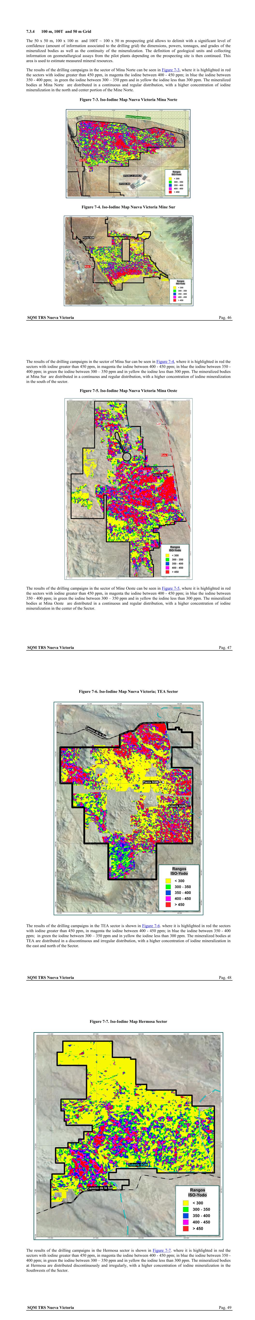 7.3.4 100 m, 100T and 50 m Grid The 50 x 50 m, 100 x 100 m and 100T ~ 100 x 50 m prospecting grid allows to delimit with a significant level of confidence (amount of information associated to the drilling grid) the dimensions, powers, tonnages, and grades of the mineralized bodies as well as the continuity of the mineralization. The definition of geological units and collecting information on geometallurgical assays from the pilot plants depending on the prospecting site is then continued. This area is used to estimate measured mineral resources. The results of the drilling campaigns in the sector of Mina Norte can be seen in Figure 7-3, where it is highlighted in red the sectors with iodine greater than 450 ppm, in magenta the iodine between 400 - 450 ppm; in blue the iodine between 350 - 400 ppm; in green the iodine between 300 – 350 ppm and in yellow the iodine less than 300 ppm. The mineralized bodies at Mina Norte are distributed in a continuous and regular distribution, with a higher concentration of iodine mineralization in the north and center portion of the Mine Norte. Figure 7-3. Iso-Iodine Map Nueva Victoria Mina Norte Figure 7-4. Iso-Iodine Map Nueva Victoria Mine Sur SQM TRS Nueva Victoria Pag. 46 The results of the drilling campaigns in the sector of Mina Sur can be seen in Figure 7-4, where it is highlighted in red the sectors with iodine greater than 450 ppm, in magenta the iodine between 400 - 450 ppm; in blue the iodine between 350 - 400 ppm; in green the iodine between 300 – 350 ppm and in yellow the iodine less than 300 ppm. The mineralized bodies at Mina Sur are distributed in a continuous and regular distribution, with a higher concentration of iodine mineralization in the south of the sector. Figure 7-5. Iso-Iodine Map Nueva Victoria Mina Oeste The results of the drilling campaigns in the sector of Mine Oeste can be seen in Figure 7-5, where it is highlighted in red the sectors with iodine greater than 450 ppm, in magenta the iodine between 400 - 450 ppm; in blue the iodine between 350 - 400 ppm; in green the iodine between 300 – 350 ppm and in yellow the iodine less than 300 ppm. The mineralized bodies at Mina Oeste are distributed in a continuous and regular distribution, with a higher concentration of iodine mineralization in the center of the Sector. SQM TRS Nueva Victoria Pag. 47 Figure 7-6. Iso-Iodine Map Nueva Victoria; TEA Sector The results of the drilling campaigns in the TEA sector is shown in Figure 7-6. where it is highlighted in red the sectors with iodine greater than 450 ppm, in magenta the iodine between 400 - 450 ppm; in blue the iodine between 350 - 400 ppm; in green the iodine between 300 – 350 ppm and in yellow the iodine less than 300 ppm. The mineralized bodies at TEA are distributed in a discontinuous and irregular distribution, with a higher concentration of iodine mineralization in the east and north of the Sector. SQM TRS Nueva Victoria Pag. 48 Figure 7-7. Iso-Iodine Map Hermosa Sector The results of the drilling campaigns in the Hermosa sector is shown in Figure 7-7. where it is highlighted in red the sectors with iodine greater than 450 ppm, in magenta the iodine between 400 - 450 ppm; in blue the iodine between 350 - 400 ppm; in green the iodine between 300 – 350 ppm and in yellow the iodine less than 300 ppm. The mineralized bodies at Hermosa are distributed discontinuously and irregularly, with a higher concentration of iodine mineralization in the Southwests of the Sector. SQM TRS Nueva Victoria Pag. 49