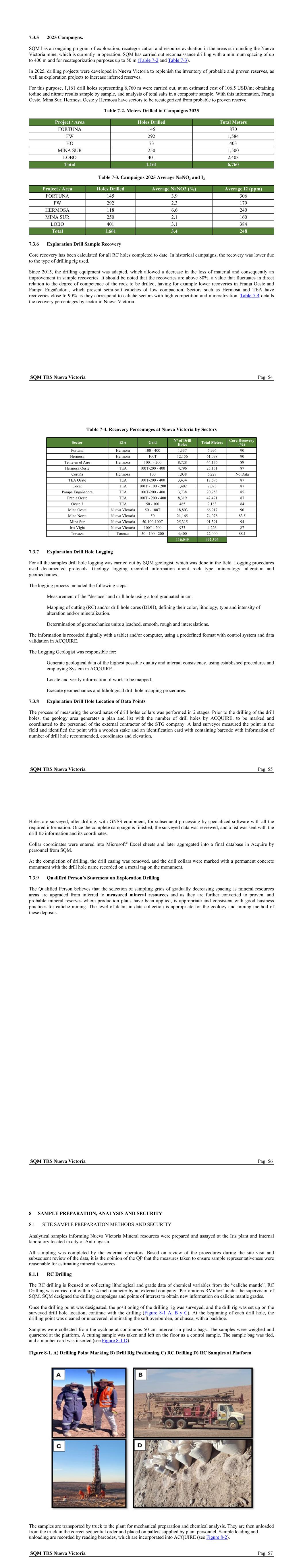 7.3.5 2025 Campaigns. SQM has an ongoing program of exploration, recategorization and resource evaluation in the areas surrounding the Nueva Victoria mine, which is currently in operation. SQM has carried out reconnaissance drilling with a minimum spacing of up to 400 m and for recategorization purposes up to 50 m (Table 7-2 and Table 7-3). In 2025, drilling projects were developed in Nueva Victoria to replenish the inventory of probable and proven reserves, as well as exploration projects to increase inferred reserves. For this purpose, 1,161 drill holes representing 6,760 m were carried out, at an estimated cost of 106.5 USD/m; obtaining iodine and nitrate results sample by sample, and analysis of total salts in a composite sample. With this information, Franja Oeste, Mina Sur, Hermosa Oeste y Hermosa have sectors to be recategorized from probable to proven reserve. Table 7-2. Meters Drilled in Campaigns 2025 Project / Area Holes Drilled Total Meters FORTUNA 145 870 FW 292 1,584 HO 73 403 MINA SUR 250 1,500 LOBO 401 2,403 Total 1,161 6,760 Table 7-3. Campaigns 2025 Average NaNO3 and I2 Project / Area Holes Drilled Average NaNO3 (%) Average I2 (ppm) FORTUNA 145 3.9 306 FW 292 2.3 179 HERMOSA 118 6.6 240 MINA SUR 250 2.1 160 LOBO 401 3.1 384 Total 1,661 3.4 248 7.3.6 Exploration Drill Sample Recovery Core recovery has been calculated for all RC holes completed to date. In historical campaigns, the recovery was lower due to the type of drilling rig used. Since 2015, the drilling equipment was adapted, which allowed a decrease in the loss of material and consequently an improvement in sample recoveries. It should be noted that the recoveries are above 80%, a value that fluctuates in direct relation to the degree of competence of the rock to be drilled, having for example lower recoveries in Franja Oeste and Pampa Engañadora, which present semi-soft caliches of low compaction. Sectors such as Hermosa and TEA have recoveries close to 90% as they correspond to caliche sectors with high competition and mineralization. Table 7-4 details the recovery percentages by sector in Nueva Victoria. SQM TRS Nueva Victoria Pag. 54 Table 7-4. Recovery Percentages at Nueva Victoria by Sectors Sector EIA Grid N° of Drill Holes Total Meters Core Recovery (%) Fortuna Hermosa 100 - 400 1,337 6,996 90 Hermosa Hermosa 100T 12,156 61,098 90 Tente en el Aire Hermosa 100T - 200 8,728 44,136 89 Hermosa Oeste TEA 100T-200 - 400 4,796 25,151 87 Coruña Hermosa 100 1,038 6,228 No Data TEA Oeste TEA 100T-200 - 400 3,434 17,695 87 Cocar TEA 100T - 100 - 200 1,402 7,073 87 Pampa Engañadora TEA 100T-200 - 400 3,738 20,753 85 Franja Oeste TEA 100T - 200 - 400 8,319 42,471 87 Oeste 3 TEA 50 - 100 485 2,183 84 Mina Oeste Nueva Victoria 50 - 100T 18,803 66,917 90 Mina Norte Nueva Victoria 50 21,165 74,078 83.5 Mina Sur Nueva Victoria 50-100-100T 25,315 91,391 94 Iris Vigia Nueva Victoria 100T - 200 933 4,226 87 Torcaza Torcaza 50 - 100 - 200 4,400 22,000 88.1 116,049 492,396 7.3.7 Exploration Drill Hole Logging For all the samples drill hole logging was carried out by SQM geologist, which was done in the field. Logging procedures used documented protocols. Geology logging recorded information about rock type, mineralogy, alteration and geomechanics. The logging process included the following steps: Measurement of the “destace” and drill hole using a tool graduated in cm. Mapping of cutting (RC) and/or drill hole cores (DDH), defining their color, lithology, type and intensity of alteration and/or mineralization. Determination of geomechanics units a leached, smooth, rough and intercalations. The information is recorded digitally with a tablet and/or computer, using a predefined format with control system and data validation in ACQUIRE. The Logging Geologist was responsible for: Generate geological data of the highest possible quality and internal consistency, using established procedures and employing System in ACQUIRE. Locate and verify information of work to be mapped. Execute geomechanics and lithological drill hole mapping procedures. 7.3.8 Exploration Drill Hole Location of Data Points The process of measuring the coordinates of drill holes collars was performed in 2 stages. Prior to the drilling of the drill holes, the geology area generates a plan and list with the number of drill holes by ACQUIRE, to be marked and coordinated to the personnel of the external contractor of the STG company. A land surveyor measured the point in the field and identified the point with a wooden stake and an identification card with containing barcode with information of number of drill hole recommended, coordinates and elevation. SQM TRS Nueva Victoria Pag. 55 Holes are surveyed, after drilling, with GNSS equipment, for subsequent processing by specialized software with all the required information. Once the complete campaign is finished, the surveyed data was reviewed, and a list was sent with the drill ID information and its coordinates. Collar coordinates were entered into Microsoft® Excel sheets and later aggregated into a final database in Acquire by personnel from SQM. At the completion of drilling, the drill casing was removed, and the drill collars were marked with a permanent concrete monument with the drill hole name recorded on a metal tag on the monument. 7.3.9 Qualified Person’s Statement on Exploration Drilling The Qualified Person believes that the selection of sampling grids of gradually decreasing spacing as mineral resources areas are upgraded from inferred to measured mineral resources and as they are further converted to proven, and probable mineral reserves where production plans have been applied, is appropriate and consistent with good business practices for caliche mining. The level of detail in data collection is appropriate for the geology and mining method of these deposits. SQM TRS Nueva Victoria Pag. 56 8 SAMPLE PREPARATION, ANALYSIS AND SECURITY 8.1 SITE SAMPLE PREPARATION METHODS AND SECURITY Analyti