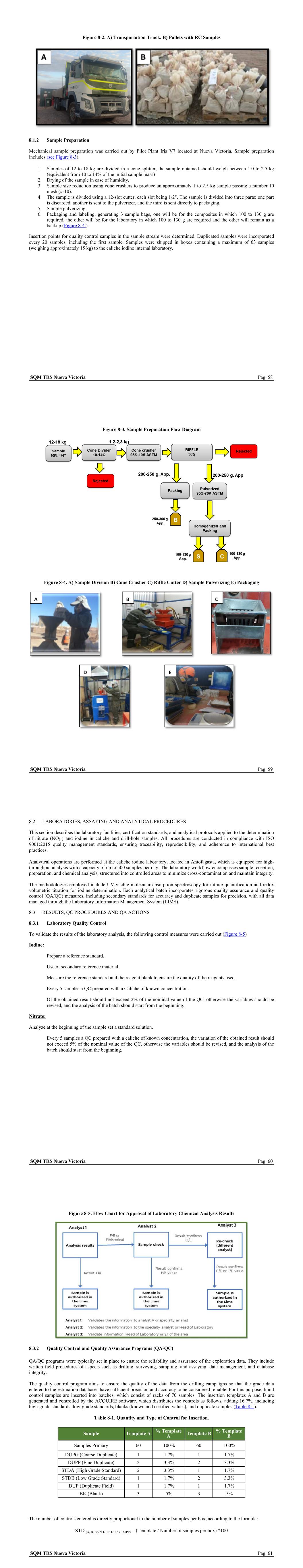Figure 8-2. A) Transportation Truck. B) Pallets with RC Samples 8.1.2 Sample Preparation Mechanical sample preparation was carried out by Pilot Plant Iris V7 located at Nueva Victoria. Sample preparation includes (see Figure 8-3). 1. Samples of 12 to 18 kg are divided in a cone splitter, the sample obtained should weigh between 1.0 to 2.5 kg (equivalent from 10 to 14% of the initial sample mass) 2. Drying of the sample in case of humidity. 3. Sample size reduction using cone crushers to produce an approximately 1 to 2.5 kg sample passing a number 10 mesh (#-10). 4. The sample is divided using a 12-slot cutter, each slot being 1/2". The sample is divided into three parts: one part is discarded, another is sent to the pulverizer, and the third is sent directly to packaging. 5. Sample pulverizing. 6. Packaging and labeling, generating 3 sample bags, one will be for the composites in which 100 to 130 g are required, the other will be for the laboratory in which 100 to 130 g are required and the other will remain as a backup (Figure 8-4.). Insertion points for quality control samples in the sample stream were determined. Duplicated samples were incorporated every 20 samples, including the first sample. Samples were shipped in boxes containing a maximum of 63 samples (weighing approximately 15 kg) to the caliche iodine internal laboratory. SQM TRS Nueva Victoria Pag. 58 Figure 8-3. Sample Preparation Flow Diagram Figure 8-4. A) Sample Division B) Cone Crusher C) Riffle Cutter D) Sample Pulverizing E) Packaging SQM TRS Nueva Victoria Pag. 59 8.2 LABORATORIES, ASSAYING AND ANALYTICAL PROCEDURES This section describes the laboratory facilities, certification standards, and analytical protocols applied to the determination of nitrate (NO₃⁻) and iodine in caliche and drill-hole samples. All procedures are conducted in compliance with ISO 9001:2015 quality management standards, ensuring traceability, reproducibility, and adherence to international best practices. Analytical operations are performed at the caliche iodine laboratory, located in Antofagasta, which is equipped for high- throughput analysis with a capacity of up to 500 samples per day. The laboratory workflow encompasses sample reception, preparation, and chemical analysis, structured into controlled areas to minimize cross-contamination and maintain integrity. The methodologies employed include UV-visible molecular absorption spectroscopy for nitrate quantification and redox volumetric titration for iodine determination. Each analytical batch incorporates rigorous quality assurance and quality control (QA/QC) measures, including secondary standards for accuracy and duplicate samples for precision, with all data managed through the Laboratory Information Management System (LIMS). 8.3 RESULTS, QC PROCEDURES AND QA ACTIONS 8.3.1 Laboratory Quality Control To validate the results of the laboratory analysis, the following control measures were carried out (Figure 8-5) Iodine: Prepare a reference standard. Use of secondary reference material. Measure the reference standard and the reagent blank to ensure the quality of the reagents used. Every 5 samples a QC prepared with a Caliche of known concentration. Of the obtained result should not exceed 2% of the nominal value of the QC, otherwise the variables should be revised, and the analysis of the batch should start from the beginning. Nitrate: Analyze at the beginning of the sample set a standard solution. Every 5 samples a QC prepared with a caliche of known concentration, the variation of the obtained result should not exceed 5% of the nominal value of the QC, otherwise the variables should be revised, and the analysis of the batch should start from the beginning. SQM TRS Nueva Victoria Pag. 60 Figure 8-5. Flow Chart for Approval of Laboratory Chemical Analysis Results 8.3.2 Quality Control and Quality Assurance Programs (QA-QC) QA/QC programs were typically set in place to ensure the reliability and assurance of the exploration data. They include written field procedures of aspects such as drilling, surveying, sampling, and assaying, data management, and database integrity. The quality control program aims to ensure the quality of the data from the drilling campaigns so that the grade data entered to the estimation databases have sufficient precision and accuracy to be considered reliable. For this purpose, blind control samples are inserted into batches, which consist of racks of 70 samples. The insertion templates A and B are generated and controlled by the ACQUIRE software, which distributes the controls as follows, adding 16.7%, including high-grade standards, low-grade standards, blanks (known and certified values), and duplicate samples (Table 8-1). Table 8-1. Quantity and Type of Control for Insertion. Sample Template A % Template A Template B % Template B Samples Primary 60 100% 60 100% DUPG (Coarse Duplicate) 1 1.7% 1 1.7% DUPP (Fine Duplicate) 2 3.3% 2 3.3% STDA (High Grade Standard) 2 3.3% 1 1.7% STDB (Low Grade Standard) 1 1.7% 2 3.3% DUP (Duplicate Field) 1 1.7% 1 1.7% BK (Blank) 3 5% 3 5% The number of controls entered is directly proportional to the number of samples per box, according to the formula: STD (A, B, BK & DUP, DUPG, DUPP) = (Template / Number of samples per box) *100 SQM TRS Nueva Victoria Pag. 61
