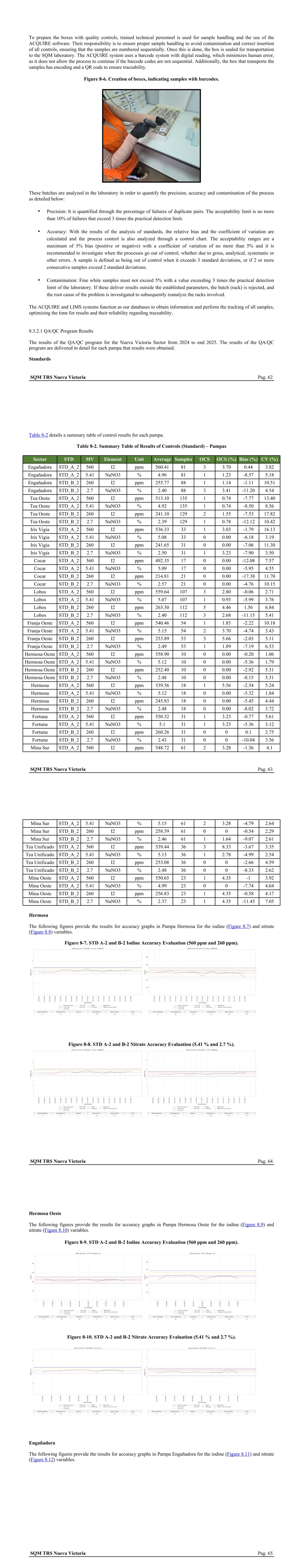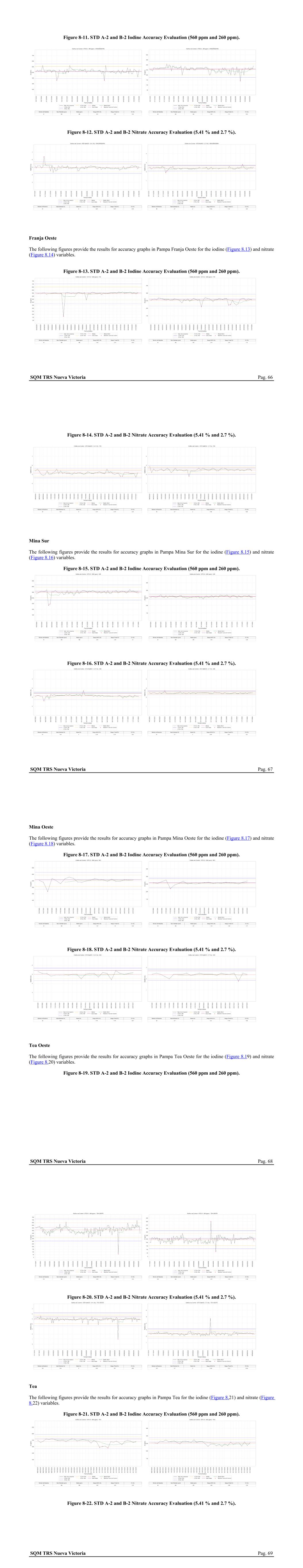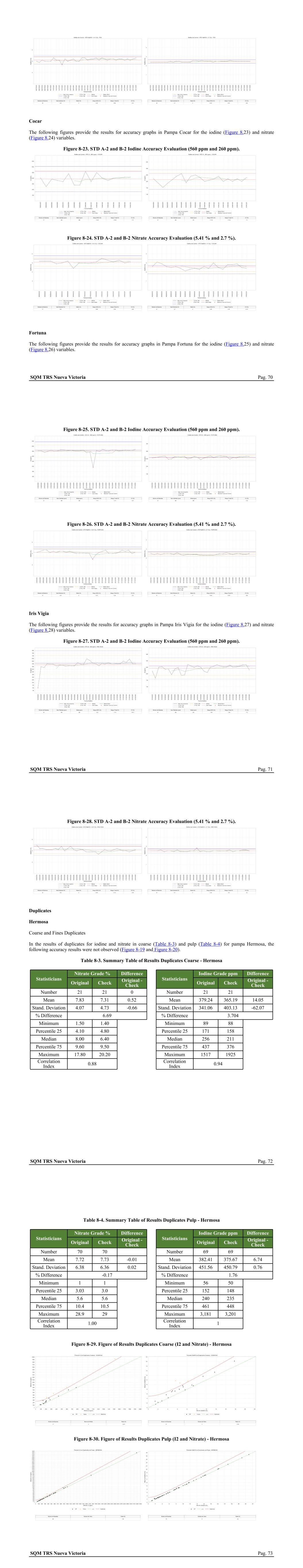 To prepare the boxes with quality controls, trained technical personnel is used for sample handling and the use of the ACQUIRE software. Their responsibility is to ensure proper sample handling to avoid contamination and correct insertion of all controls, ensuring that the samples are numbered sequentially. Once this is done, the box is sealed for transportation to the SQM laboratory. The ACQUIRE system uses a barcode system with digital reading, which minimizes human error, as it does not allow the process to continue if the barcode codes are not sequential. Additionally, the box that transports the samples has encoding and a QR code to ensure traceability. Figure 8-6. Creation of boxes, indicating samples with barcodes. These batches are analyzed in the laboratory in order to quantify the precision, accuracy and contamination of the process as detailed below: • Precision: It is quantified through the percentage of failures of duplicate pairs. The acceptability limit is no more than 10% of failures that exceed 3 times the practical detection limit. • Accuracy: With the results of the analysis of standards, the relative bias and the coefficient of variation are calculated and the process control is also analyzed through a control chart. The acceptability ranges are a maximum of 5% bias (positive or negative) with a coefficient of variation of no more than 5% and it is recommended to investigate when the processes go out of control, whether due to gross, analytical, systematic or other errors. A sample is defined as being out of control when it exceeds 3 standard deviations, or if 2 or more consecutive samples exceed 2 standard deviations. • Contamination: Fine white samples must not exceed 5% with a value exceeding 3 times the practical detection limit of the laboratory. If these deliver results outside the established parameters, the batch (rack) is rejected, and the root cause of the problem is investigated to subsequently reanalyze the racks involved. The ACQUIRE and LIMS systems function as our databases to obtain information and perform the tracking of all samples, optimizing the time for results and their reliability regarding traceability. 8.3.2.1 QA/QC Program Results The results of the QA/QC program for the Nueva Victoria Sector from 2024 to end 2025. The results of the QA/QC program are delivered in detail for each pampa that results were obtained. Standards SQM TRS Nueva Victoria Pag. 62 Table 8-2 details a summary table of control results for each pampa. Table 8-2. Summary Table of Results of Controls (Standard) – Pampas Sector STD MV Element Unit Average Samples OCS OCS (%) Bias (%) CV (%) Engañadora STD_A_2 560 I2 ppm 560.41 81 3 3.70 0.44 3.82 Engañadora STD_A_2 5.41 NaNO3 % 4.96 81 1 1.23 -8.57 5.18 Engañadora STD_B_2 260 I2 ppm 255.77 88 1 1.14 -1.11 10.51 Engañadora STD_B_2 2.7 NaNO3 % 2.40 88 3 3.41 -11.20 4.54 Tea Oeste STD_A_2 560 I2 ppm 513.10 135 1 0.74 -7.77 13.40 Tea Oeste STD_A_2 5.41 NaNO3 % 4.92 135 1 0.74 -8.50 8.56 Tea Oeste STD_B_2 260 I2 ppm 241.10 129 2 1.55 -7.53 17.82 Tea Oeste STD_B_2 2.7 NaNO3 % 2.39 129 1 0.78 -12.12 10.42 Iris Vigia STD_A_2 560 I2 ppm 536.33 33 1 3.03 -1.79 16.13 Iris Vigia STD_A_2 5.41 NaNO3 % 5.08 33 0 0.00 -6.18 3.19 Iris Vigia STD_B_2 260 I2 ppm 241.65 31 0 0.00 -7.06 11.30 Iris Vigia STD_B_2 2.7 NaNO3 % 2.50 31 1 3.23 -7.90 3.50 Cocar STD_A_2 560 I2 ppm 492.35 17 0 0.00 -12.08 7.57 Cocar STD_A_2 5.41 NaNO3 % 5.09 17 0 0.00 -5.95 4.55 Cocar STD_B_2 260 I2 ppm 214.81 21 0 0.00 -17.38 11.70 Cocar STD_B_2 2.7 NaNO3 % 2.57 21 0 0.00 -4.76 10.15 Lobos STD_A_2 560 I2 ppm 559.64 107 3 2.80 -0.06 2.71 Lobos STD_A_2 5.41 NaNO3 % 5.07 107 1 0.93 -5.99 3.76 Lobos STD_B_2 260 I2 ppm 263.30 112 5 4.46 1.56 6.84 Lobos STD_B_2 2.7 NaNO3 % 2.40 112 3 2.68 -11.15 5.41 Franja Oeste STD_A_2 560 I2 ppm 540.46 54 1 1.85 -2.22 10.18 Franja Oeste STD_A_2 5.41 NaNO3 % 5.15 54 2 3.70 -4.74 3.43 Franja Oeste STD_B_2 260 I2 ppm 253.89 53 3 5.66 -2.03 5.11 Franja Oeste STD_B_2 2.7 NaNO3 % 2.49 53 1 1.89 -7.19 6.53 Hermosa Oeste STD_A_2 560 I2 ppm 558.90 10 0 0.00 -0.20 1.06 Hermosa Oeste STD_A_2 5.41 NaNO3 % 5.12 10 0 0.00 -5.36 1.79 Hermosa Oeste STD_B_2 260 I2 ppm 252.40 10 0 0.00 -2.92 5.31 Hermosa Oeste STD_B_2 2.7 NaNO3 % 2.48 10 0 0.00 -8.15 5.31 Hermosa STD_A_2 560 I2 ppm 539.56 18 1 5.56 -2.54 5.24 Hermosa STD_A_2 5.41 NaNO3 % 5.12 18 0 0.00 -5.32 1.84 Hermosa STD_B_2 260 I2 ppm 245.83 18 0 0.00 -5.45 4.44 Hermosa STD_B_2 2.7 NaNO3 % 2.48 18 0 0.00 -8.02 3.72 Fortuna STD_A_2 560 I2 ppm 550.32 31 1 3.23 -0.77 5.61 Fortuna STD_A_2 5.41 NaNO3 % 5.1 31 1 3.23 -5.36 3.12 Fortuna STD_B_2 260 I2 ppm 260.26 31 0 0 0.1 2.75 Fortuna STD_B_2 2.7 NaNO3 % 2.43 31 0 0 -10.04 3.56 Mina Sur STD_A_2 560 I2 ppm 548.72 61 2 3.28 -1.36 4.1 SQM TRS Nueva Victoria Pag. 63 Mina Sur STD_A_2 5.41 NaNO3 % 5.15 61 2 3.28 -4.79 2.64 Mina Sur STD_B_2 260 I2 ppm 258.59 61 0 0 -0.54 2.29 Mina Sur STD_B_2 2.7 NaNO3 % 2.46 61 1 1.64 -9.07 2.61 Tea Unificado STD_A_2 560 I2 ppm 539.44 36 3 8.33 -3.67 3.35 Tea Unificado STD_A_2 5.41 NaNO3 % 5.13 36 1 2.78 -4.99 2.54 Tea Unificado STD_B_2 260 I2 ppm 253.08 36 0 0 -2.66 4.59 Tea Unificado STD_B_2 2.7 NaNO3 % 2.48 36 0 0 -8.33 2.62 Mina Oeste STD_A_2 560 I2 ppm 550.65 23 1 4.35 -1 3.92 Mina Oeste STD_A_2 5.41 NaNO3 % 4.99 23 0 0 -7.74 4.64 Mina Oeste STD_B_2 260 I2 ppm 256.83 23 1 4.35 -0.58 4.17 Mina Oeste STD_B_2 2.7 NaNO3 % 2.37 23 1 4.35 -11.45 7.05 Hermosa The following figures provide the results for accuracy graphs in Pampa Hermosa for the iodine (Figure 8.7) and nitrate (Figure 8.8) variables. Figure 8-7. STD A-2 and B-2 Iodine Accuracy Evaluation (560 ppm and 260 ppm). Figure 8-8. STD A-2 and B-2 Nitrate Accuracy Evaluation (5.41 % and 2.7 %). SQM TRS Nueva Victoria Pag. 64 Hermosa Oeste The following figures provide the results for accuracy graphs in Pampa Hermosa Oeste for the iodine (Figure 8.9) and nitrate (Figure 8.10) variables. Figure 8-9. STD A-2 and B-2 Iodine Accuracy Evaluation (560 ppm and 260 ppm). Figu