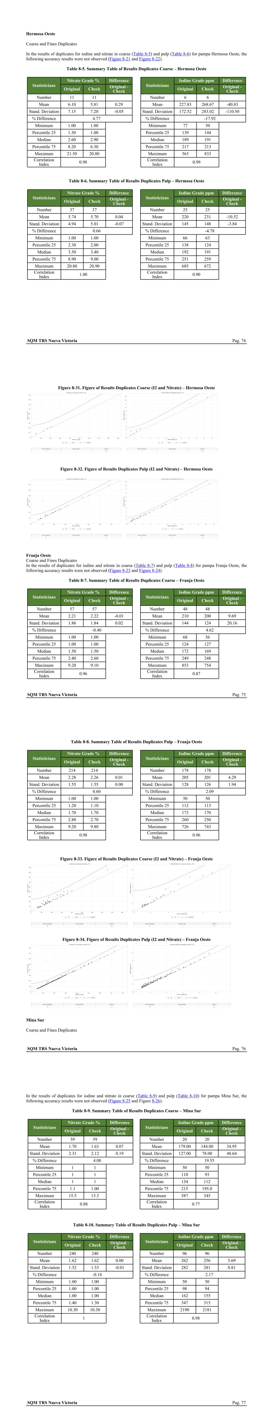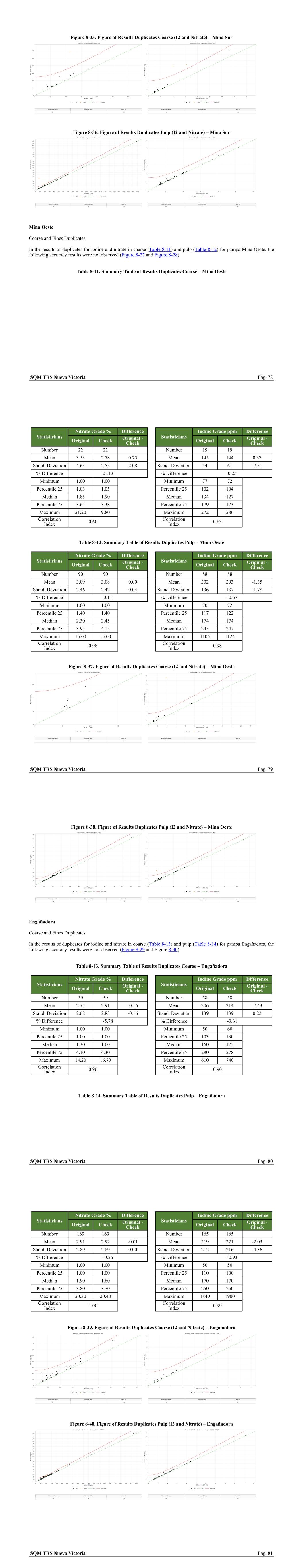 Figure 8-35. Figure of Results Duplicates Coarse (I2 and Nitrate) – Mina Sur Figure 8-36. Figure of Results Duplicates Pulp (I2 and Nitrate) – Mina Sur Mina Oeste Coarse and Fines Duplicates In the results of duplicates for iodine and nitrate in coarse (Table 8-11) and pulp (Table 8-12) for pampa Mina Oeste, the following accuracy results were not observed (Figure 8-27 and Figure 8-28). Table 8-11. Summary Table of Results Duplicates Coarse – Mina Oeste SQM TRS Nueva Victoria Pag. 78 Statisticians Nitrate Grade % Difference Statisticians Iodine Grade ppm Difference Original Check Original - Check Original Check Original - Check Number 22 22 Number 19 19 Mean 3.53 2.78 0.75 Mean 145 144 0.37 Stand. Deviation 4.63 2.55 2.08 Stand. Deviation 54 61 -7.51 % Difference 21.13 % Difference 0.25 Minimum 1.00 1.00 Minimum 77 72 Percentile 25 1.03 1.05 Percentile 25 102 104 Median 1.85 1.90 Median 134 127 Percentile 75 3.65 3.38 Percentile 75 179 173 Maximum 21.20 9.80 Maximum 272 286 Correlation Index 0.60 Correlation Index 0.83 Table 8-12. Summary Table of Results Duplicates Pulp – Mina Oeste Statisticians Nitrate Grade % Difference Statisticians Iodine Grade ppm Difference Original Check Original - Check Original Check Original - Check Number 90 90 Number 88 88 Mean 3.09 3.08 0.00 Mean 202 203 -1.35 Stand. Deviation 2.46 2.42 0.04 Stand. Deviation 136 137 -1.78 % Difference 0.11 % Difference -0.67 Minimum 1.00 1.00 Minimum 70 72 Percentile 25 1.40 1.40 Percentile 25 117 122 Median 2.30 2.45 Median 174 174 Percentile 75 3.95 4.15 Percentile 75 245 247 Maximum 15.00 15.00 Maximum 1105 1124 Correlation Index 0.98 Correlation Index 0.98 Figure 8-37. Figure of Results Duplicates Coarse (I2 and Nitrate) – Mina Oeste SQM TRS Nueva Victoria Pag. 79 Figure 8-38. Figure of Results Duplicates Pulp (I2 and Nitrate) – Mina Oeste Engañadora Coarse and Fines Duplicates In the results of duplicates for iodine and nitrate in coarse (Table 8-13) and pulp (Table 8-14) for pampa Engañadora, the following accuracy results were not observed (Figure 8-29 and Figure 8-30). Table 8-13. Summary Table of Results Duplicates Coarse – Engañadora Statisticians Nitrate Grade % Difference Statisticians Iodine Grade ppm Difference Original Check Original - Check Original Check Original - Check Number 59 59 Number 58 58 Mean 2.75 2.91 -0.16 Mean 206 214 -7.43 Stand. Deviation 2.68 2.83 -0.16 Stand. Deviation 139 139 0.22 % Difference -5.78 % Difference -3.61 Minimum 1.00 1.00 Minimum 50 60 Percentile 25 1.00 1.00 Percentile 25 103 130 Median 1.30 1.60 Median 160 175 Percentile 75 4.10 4.30 Percentile 75 280 278 Maximum 14.20 16.70 Maximum 610 740 Correlation Index 0.96 Correlation Index 0.90 Table 8-14. Summary Table of Results Duplicates Pulp – Engañadora SQM TRS Nueva Victoria Pag. 80 Statisticians Nitrate Grade % Difference Statisticians Iodine Grade ppm Difference Original Check Original - Check Original Check Original - Check Number 169 169 Number 165 165 Mean 2.91 2.92 -0.01 Mean 219 221 -2.03 Stand. Deviation 2.89 2.89 0.00 Stand. Deviation 212 216 -4.36 % Difference -0.26 % Difference -0.93 Minimum 1.00 1.00 Minimum 50 50 Percentile 25 1.00 1.00 Percentile 25 110 100 Median 1.90 1.80 Median 170 170 Percentile 75 3.80 3.70 Percentile 75 250 250 Maximum 20.30 20.40 Maximum 1840 1900 Correlation Index 1.00 Correlation Index 0.99 Figure 8-39. Figure of Results Duplicates Coarse (I2 and Nitrate) – Engañadora Figure 8-40. Figure of Results Duplicates Pulp (I2 and Nitrate) – Engañadora SQM TRS Nueva Victoria Pag. 81