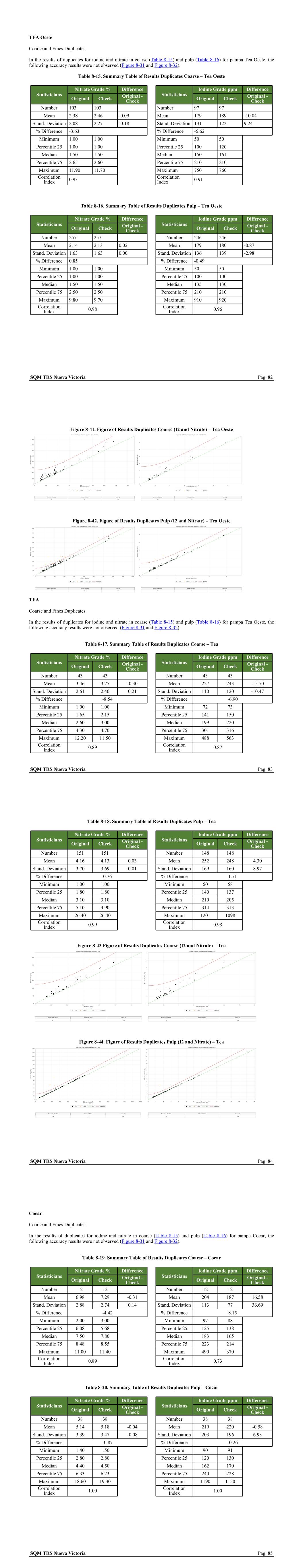 TEA Oeste Coarse and Fines Duplicates In the results of duplicates for iodine and nitrate in coarse (Table 8-15) and pulp (Table 8-16) for pampa Tea Oeste, the following accuracy results were not observed (Figure 8-31 and Figure 8-32). Table 8-15. Summary Table of Results Duplicates Coarse – Tea Oeste Statisticians Nitrate Grade % Difference Statisticians Iodine Grade ppm Difference Original Check Original - Check Original Check Original - Check Number 103 103 Number 97 97 Mean 2.38 2.46 -0.09 Mean 179 189 -10.04 Stand. Deviation 2.08 2.27 -0.18 Stand. Deviation 131 122 9.24 % Difference -3.63 % Difference -5.62 Minimum 1.00 1.00 Minimum 50 50 Percentile 25 1.00 1.00 Percentile 25 100 120 Median 1.50 1.50 Median 150 161 Percentile 75 2.65 2.60 Percentile 75 210 210 Maximum 11.90 11.70 Maximum 750 760 Correlation Index 0.93 Correlation Index 0.91 Table 8-16. Summary Table of Results Duplicates Pulp – Tea Oeste Statisticians Nitrate Grade % Difference Statisticians Iodine Grade ppm Difference Original Check Original - Check Original Check Original - Check Number 257 257 Number 246 246 Mean 2.14 2.13 0.02 Mean 179 180 -0.87 Stand. Deviation 1.63 1.63 0.00 Stand. Deviation 136 139 -2.98 % Difference 0.85 % Difference -0.49 Minimum 1.00 1.00 Minimum 50 50 Percentile 25 1.00 1.00 Percentile 25 100 100 Median 1.50 1.50 Median 135 130 Percentile 75 2.50 2.50 Percentile 75 210 210 Maximum 9.80 9.70 Maximum 910 920 Correlation Index 0.98 Correlation Index 0.96 SQM TRS Nueva Victoria Pag. 82 Figure 8-41. Figure of Results Duplicates Coarse (I2 and Nitrate) – Tea Oeste Figure 8-42. Figure of Results Duplicates Pulp (I2 and Nitrate) – Tea Oeste TEA Coarse and Fines Duplicates In the results of duplicates for iodine and nitrate in coarse (Table 8-15) and pulp (Table 8-16) for pampa Tea Oeste, the following accuracy results were not observed (Figure 8-31 and Figure 8-32). Table 8-17. Summary Table of Results Duplicates Coarse – Tea Statisticians Nitrate Grade % Difference Statisticians Iodine Grade ppm Difference Original Check Original - Check Original Check Original - Check Number 43 43 Number 43 43 Mean 3.46 3.75 -0.30 Mean 227 243 -15.70 Stand. Deviation 2.61 2.40 0.21 Stand. Deviation 110 120 -10.47 % Difference -8.54 % Difference -6.90 Minimum 1.00 1.00 Minimum 72 73 Percentile 25 1.65 2.15 Percentile 25 141 150 Median 2.60 3.00 Median 199 220 Percentile 75 4.30 4.70 Percentile 75 301 316 Maximum 12.20 11.50 Maximum 488 563 Correlation Index 0.89 Correlation Index 0.87 SQM TRS Nueva Victoria Pag. 83 Table 8-18. Summary Table of Results Duplicates Pulp – Tea Statisticians Nitrate Grade % Difference Statisticians Iodine Grade ppm Difference Original Check Original - Check Original Check Original - Check Number 151 151 Number 148 148 Mean 4.16 4.13 0.03 Mean 252 248 4.30 Stand. Deviation 3.70 3.69 0.01 Stand. Deviation 169 160 8.97 % Difference 0.76 % Difference 1.71 Minimum 1.00 1.00 Minimum 50 58 Percentile 25 1.80 1.80 Percentile 25 140 137 Median 3.10 3.10 Median 210 205 Percentile 75 5.10 4.90 Percentile 75 314 313 Maximum 26.40 26.40 Maximum 1201 1098 Correlation Index 0.99 Correlation Index 0.98 Figure 8-43 Figure of Results Duplicates Coarse (I2 and Nitrate) – Tea Figure 8-44. Figure of Results Duplicates Pulp (I2 and Nitrate) – Tea SQM TRS Nueva Victoria Pag. 84 Cocar Coarse and Fines Duplicates In the results of duplicates for iodine and nitrate in coarse (Table 8-15) and pulp (Table 8-16) for pampa Cocar, the following accuracy results were not observed (Figure 8-31 and Figure 8-32). Table 8-19. Summary Table of Results Duplicates Coarse – Cocar Statisticians Nitrate Grade % Difference Statisticians Iodine Grade ppm Difference Original Check Original - Check Original Check Original - Check Number 12 12 Number 12 12 Mean 6.98 7.29 -0.31 Mean 204 187 16.58 Stand. Deviation 2.88 2.74 0.14 Stand. Deviation 113 77 36.69 % Difference -4.42 % Difference 8.15 Minimum 2.00 3.00 Minimum 97 88 Percentile 25 6.08 5.68 Percentile 25 125 138 Median 7.50 7.80 Median 183 165 Percentile 75 8.48 8.55 Percentile 75 223 214 Maximum 11.00 11.40 Maximum 490 370 Correlation Index 0.89 Correlation Index 0.73 Table 8-20. Summary Table of Results Duplicates Pulp – Cocar Statisticians Nitrate Grade % Difference Statisticians Iodine Grade ppm Difference Original Check Original - Check Original Check Original - Check Number 38 38 Number 38 38 Mean 5.14 5.18 -0.04 Mean 219 220 -0.58 Stand. Deviation 3.39 3.47 -0.08 Stand. Deviation 203 196 6.93 % Difference -0.87 % Difference -0.26 Minimum 1.40 1.50 Minimum 90 91 Percentile 25 2.80 2.80 Percentile 25 120 130 Median 4.40 4.50 Median 162 170 Percentile 75 6.33 6.23 Percentile 75 240 228 Maximum 18.60 19.30 Maximum 1190 1150 Correlation Index 1.00 Correlation Index 1.00 SQM TRS Nueva Victoria Pag. 85