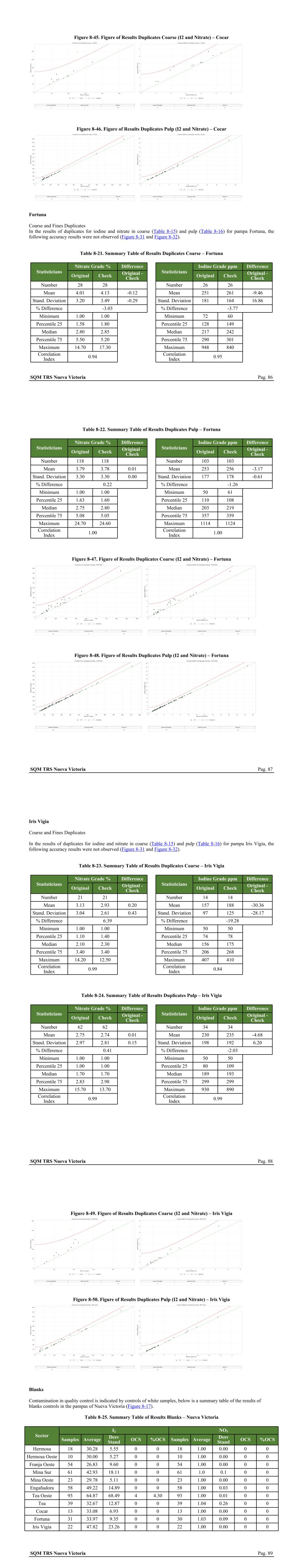 Figure 8-45. Figure of Results Duplicates Coarse (I2 and Nitrate) – Cocar Figure 8-46. Figure of Results Duplicates Pulp (I2 and Nitrate) – Cocar Fortuna Coarse and Fines Duplicates In the results of duplicates for iodine and nitrate in coarse (Table 8-15) and pulp (Table 8-16) for pampa Fortuna, the following accuracy results were not observed (Figure 8-31 and Figure 8-32). Table 8-21. Summary Table of Results Duplicates Coarse – Fortuna Statisticians Nitrate Grade % Difference Statisticians Iodine Grade ppm Difference Original Check Original - Check Original Check Original - Check Number 28 28 Number 26 26 Mean 4.01 4.13 -0.12 Mean 251 261 -9.46 Stand. Deviation 3.20 3.49 -0.29 Stand. Deviation 181 164 16.86 % Difference -3.03 % Difference -3.77 Minimum 1.00 1.00 Minimum 72 60 Percentile 25 1.58 1.80 Percentile 25 128 149 Median 2.80 2.85 Median 217 242 Percentile 75 5.50 5.20 Percentile 75 290 301 Maximum 14.70 17.30 Maximum 948 840 Correlation Index 0.94 Correlation Index 0.95 SQM TRS Nueva Victoria Pag. 86 Table 8-22. Summary Table of Results Duplicates Pulp – Fortuna Statisticians Nitrate Grade % Difference Statisticians Iodine Grade ppm Difference Original Check Original - Check Original Check Original - Check Number 118 118 Number 103 103 Mean 3.79 3.78 0.01 Mean 253 256 -3.17 Stand. Deviation 3.30 3.30 0.00 Stand. Deviation 177 178 -0.61 % Difference 0.22 % Difference -1.26 Minimum 1.00 1.00 Minimum 50 61 Percentile 25 1.63 1.60 Percentile 25 110 108 Median 2.75 2.80 Median 203 219 Percentile 75 5.08 5.05 Percentile 75 357 359 Maximum 24.70 24.60 Maximum 1114 1124 Correlation Index 1.00 Correlation Index 1.00 Figure 8-47. Figure of Results Duplicates Coarse (I2 and Nitrate) – Fortuna Figure 8-48. Figure of Results Duplicates Pulp (I2 and Nitrate) – Fortuna SQM TRS Nueva Victoria Pag. 87 Iris Vigia Coarse and Fines Duplicates In the results of duplicates for iodine and nitrate in coarse (Table 8-15) and pulp (Table 8-16) for pampa Iris Vigia, the following accuracy results were not observed (Figure 8-31 and Figure 8-32). Table 8-23. Summary Table of Results Duplicates Coarse – Iris Vigia Statisticians Nitrate Grade % Difference Statisticians Iodine Grade ppm Difference Original Check Original - Check Original Check Original - Check Number 21 21 Number 14 14 Mean 3.13 2.93 0.20 Mean 157 188 -30.36 Stand. Deviation 3.04 2.61 0.43 Stand. Deviation 97 125 -28.17 % Difference 6.39 % Difference -19.28 Minimum 1.00 1.00 Minimum 50 50 Percentile 25 1.10 1.40 Percentile 25 74 78 Median 2.10 2.30 Median 156 175 Percentile 75 3.40 3.40 Percentile 75 206 268 Maximum 14.20 12.50 Maximum 407 410 Correlation Index 0.99 Correlation Index 0.84 Table 8-24. Summary Table of Results Duplicates Pulp – Iris Vigia Statisticians Nitrate Grade % Difference Statisticians Iodine Grade ppm Difference Original Check Original - Check Original Check Original - Check Number 62 62 Number 34 34 Mean 2.75 2.74 0.01 Mean 230 235 -4.68 Stand. Deviation 2.97 2.81 0.15 Stand. Deviation 198 192 6.20 % Difference 0.41 % Difference -2.03 Minimum 1.00 1.00 Minimum 50 50 Percentile 25 1.00 1.00 Percentile 25 80 109 Median 1.70 1.70 Median 189 193 Percentile 75 2.83 2.98 Percentile 75 299 299 Maximum 15.70 13.70 Maximum 930 890 Correlation Index 0.99 Correlation Index 0.99 SQM TRS Nueva Victoria Pag. 88 Figure 8-49. Figure of Results Duplicates Coarse (I2 and Nitrate) – Iris Vigia Figure 8-50. Figure of Results Duplicates Pulp (I2 and Nitrate) – Iris Vigia Blanks Contamination in quality control is indicated by controls of white samples, below is a summary table of the results of blanks controls in the pampas of Nueva Victoria (Figure 8-17). Table 8-25. Summary Table of Results Blanks – Nueva Victoria Sector I2 NO3 Samples Average Desv Stand OCS %OCS Samples Average Desv Stand OCS %OCS Hermosa 18 30.28 5.55 0 0 18 1.00 0.00 0 0 Hermosa Oeste 10 30.00 5.27 0 0 10 1.00 0.00 0 0 Franja Oeste 54 26.83 9.60 0 0 54 1.00 0.00 0 0 Mina Sur 61 42.93 18.11 0 0 61 1.0 0.1 0 0 Mina Oeste 23 29.78 5.11 0 0 23 1.00 0.00 0 0 Engañadora 58 49.22 14.89 0 0 58 1.00 0.03 0 0 Tea Oeste 93 64.87 68.49 4 4.30 93 1.00 0.01 0 0 Tea 39 32.67 12.87 0 0 39 1.04 0.26 0 0 Cocar 13 33.08 6.93 0 0 13 1.00 0.00 0 0 Fortuna 31 33.97 9.35 0 0 30 1.03 0.09 0 0 Iris Vigia 22 47.82 23.26 0 0 22 1.00 0.00 0 0 SQM TRS Nueva Victoria Pag. 89