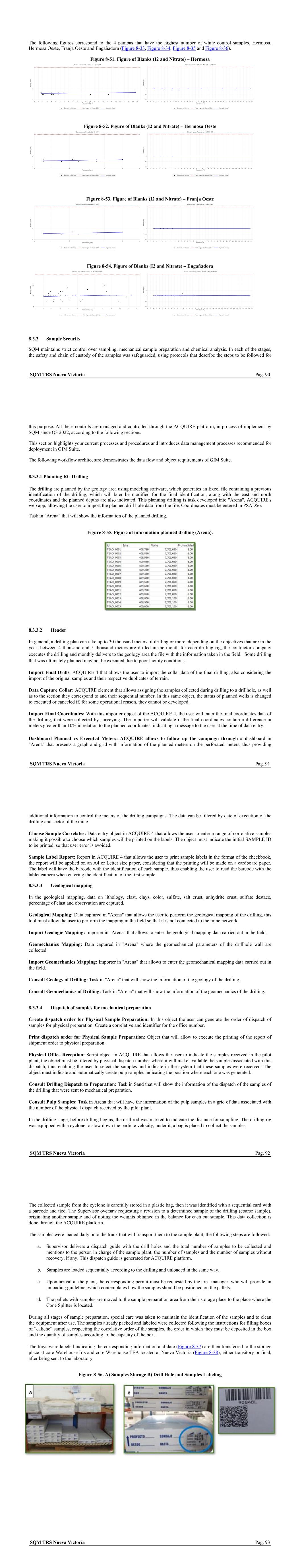 The following figures correspond to the 4 pampas that have the highest number of white control samples, Hermosa, Hermosa Oeste, Franja Oeste and Engañadora (Figure 8-33, Figure 8-34, Figure 8-35 and Figure 8-36). Figure 8-51. Figure of Blanks (I2 and Nitrate) – Hermosa Figure 8-52. Figure of Blanks (I2 and Nitrate) – Hermosa Oeste Figure 8-53. Figure of Blanks (I2 and Nitrate) – Franja Oeste Figure 8-54. Figure of Blanks (I2 and Nitrate) – Engañadora 8.3.3 Sample Security SQM maintains strict control over sampling, mechanical sample preparation and chemical analysis. In each of the stages, the safety and chain of custody of the samples was safeguarded, using protocols that describe the steps to be followed for SQM TRS Nueva Victoria Pag. 90 this purpose. All these controls are managed and controlled through the ACQUIRE platform, in process of implement by SQM since Q3 2022, according to the following sections. This section highlights your current processes and procedures and introduces data management processes recommended for deployment in GIM Suite. The following workflow architecture demonstrates the data flow and object requirements of GIM Suite. 8.3.3.1 Planning RC Drilling The drilling are planned by the geology area using modeling software, which generates an Excel file containing a previous identification of the drilling, which will later be modified for the final identification, along with the east and north coordinates and the planned depths are also indicated. This planning drilling is task developed into "Arena", ACQUIRE's web app, allowing the user to import the planned drill hole data from the file. Coordinates must be entered in PSAD56. Task in "Arena" that will show the information of the planned drilling. Figure 8-55. Figure of information planned drilling (Arena). 8.3.3.2 Header In general, a drilling plan can take up to 30 thousand meters of drilling or more, depending on the objectives that are in the year, between 4 thousand and 5 thousand meters are drilled in the month for each drilling rig, the contractor company executes the drilling and monthly delivers to the geology area the file with the information taken in the field. Some drilling that was ultimately planned may not be executed due to poor facility conditions. Import Final Drills: ACQUIRE 4 that allows the user to import the collar data of the final drilling, also considering the import of the original samples and their respective duplicates of terrain. Data Capture Collar: ACQUIRE element that allows assigning the samples collected during drilling to a drillhole, as well as to the section they correspond to and their sequential number. In this same object, the status of planned wells is changed to executed or canceled if, for some operational reason, they cannot be developed. Import Final Coordinates: With this importer object of the ACQUIRE 4, the user will enter the final coordinates data of the drilling, that were collected by surveying. The importer will validate if the final coordinates contain a difference in meters greater than 10% in relation to the planned coordinates, indicating a message to the user at the time of data entry. Dashboard Planned vs Executed Meters: ACQUIRE allows to follow up the campaign through a dashboard in "Arena" that presents a graph and grid with information of the planned meters on the perforated meters, thus providing SQM TRS Nueva Victoria Pag. 91 additional information to control the meters of the drilling campaigns. The data can be filtered by date of execution of the drilling and sector of the mine. Choose Sample Correlates: Data entry object in ACQUIRE 4 that allows the user to enter a range of correlative samples making it possible to choose which samples will be printed on the labels. The object must indicate the initial SAMPLE ID to be printed, so that user error is avoided. Sample Label Report: Report in ACQUIRE 4 that allows the user to print sample labels in the format of the checkbook, the report will be applied on an A4 or Letter size paper, considering that the printing will be made on a cardboard paper. The label will have the barcode with the identification of each sample, thus enabling the user to read the barcode with the tablet camera when entering the identification of the first sample 8.3.3.3 Geological mapping In the geological mapping, data on lithology, clast, clays, color, sulfate, salt crust, anhydrite crust, sulfate destace, percentage of clast and observation are captured. Geological Mapping: Data captured in "Arena" that allows the user to perform the geological mapping of the drilling, this tool must allow the user to perform the mapping in the field so that it is not connected to the mine network. Import Geologic Mapping: Importer in "Arena" that allows to enter the geological mapping data carried out in the field. Geomechanics Mapping: Data captured in "Arena" where the geomechanical parameters of the drillhole wall are collected. Import Geomechanics Mapping: Importer in "Arena" that allows to enter the geomechanical mapping data carried out in the field. Consult Geology of Drilling: Task in "Arena" that will show the information of the geology of the drilling. Consult Geomechanics of Drilling: Task in "Arena" that will show the information of the geomechanics of the drilling. 8.3.3.4 Dispatch of samples for mechanical preparation Create dispatch order for Physical Sample Preparation: In this object the user can generate the order of dispatch of samples for physical preparation. Create a correlative and identifier for the office number. Print dispatch order for Physical Sample Preparation: Object that will allow to execute the printing of the report of shipment order to physical preparation. Physical Office Reception: Script object in ACQUIRE that allows the user to indicate the samples received in the pilot plant, the object must be filtered by physical dispatch number where it will make available the samples associated with thi