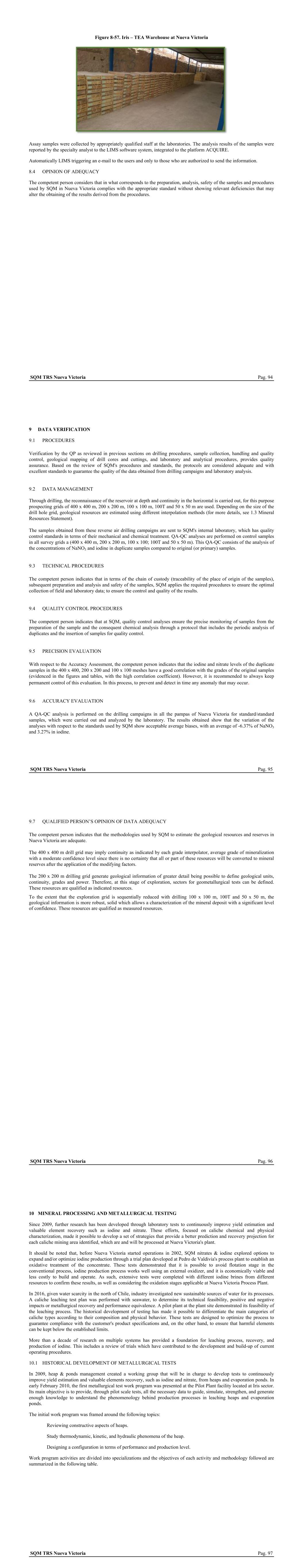 Figure 8-57. Iris – TEA Warehouse at Nueva Victoria Assay samples were collected by appropriately qualified staff at the laboratories. The analysis results of the samples were reported by the specialty analyst to the LIMS software system, integrated to the platform ACQUIRE. Automatically LIMS triggering an e-mail to the users and only to those who are authorized to send the information. 8.4 OPINION OF ADEQUACY The competent person considers that in what corresponds to the preparation, analysis, safety of the samples and procedures used by SQM in Nueva Victoria complies with the appropriate standard without showing relevant deficiencies that may alter the obtaining of the results derived from the procedures. SQM TRS Nueva Victoria Pag. 94 9 DATA VERIFICATION 9.1 PROCEDURES Verification by the QP as reviewed in previous sections on drilling procedures, sample collection, handling and quality control, geological mapping of drill cores and cuttings, and laboratory and analytical procedures, provides quality assurance. Based on the review of SQM's procedures and standards, the protocols are considered adequate and with excellent standards to guarantee the quality of the data obtained from drilling campaigns and laboratory analysis. 9.2 DATA MANAGEMENT Through drilling, the reconnaissance of the reservoir at depth and continuity in the horizontal is carried out, for this purpose prospecting grids of 400 x 400 m, 200 x 200 m, 100 x 100 m, 100T and 50 x 50 m are used. Depending on the size of the drill hole grid, geological resources are estimated using different interpolation methods (for more details, see 1.3 Mineral Resources Statement). The samples obtained from these reverse air drilling campaigns are sent to SQM's internal laboratory, which has quality control standards in terms of their mechanical and chemical treatment. QA-QC analyses are performed on control samples in all survey grids a (400 x 400 m, 200 x 200 m, 100 x 100; 100T and 50 x 50 m). This QA-QC consists of the analysis of the concentrations of NaNO3 and iodine in duplicate samples compared to original (or primary) samples. 9.3 TECHNICAL PROCEDURES The competent person indicates that in terms of the chain of custody (traceability of the place of origin of the samples), subsequent preparation and analysis and safety of the samples, SQM applies the required procedures to ensure the optimal collection of field and laboratory data; to ensure the control and quality of the results. 9.4 QUALITY CONTROL PROCEDURES The competent person indicates that at SQM, quality control analyses ensure the precise monitoring of samples from the preparation of the sample and the consequent chemical analysis through a protocol that includes the periodic analysis of duplicates and the insertion of samples for quality control. 9.5 PRECISION EVALUATION With respect to the Accuracy Assessment, the competent person indicates that the iodine and nitrate levels of the duplicate samples in the 400 x 400, 200 x 200 and 100 x 100 meshes have a good correlation with the grades of the original samples (evidenced in the figures and tables, with the high correlation coefficient). However, it is recommended to always keep permanent control of this evaluation. In this process, to prevent and detect in time any anomaly that may occur. 9.6 ACCURACY EVALUATION A QA-QC analysis is performed on the drilling campaigns in all the pampas of Nueva Victoria for standard/standard samples, which were carried out and analyzed by the laboratory. The results obtained show that the variation of the analyses with respect to the standards used by SQM show acceptable average biases, with an average of -6.37% of NaNO3 and 3.27% in iodine. SQM TRS Nueva Victoria Pag. 95 9.7 QUALIFIED PERSON’S OPINION OF DATA ADEQUACY The competent person indicates that the methodologies used by SQM to estimate the geological resources and reserves in Nueva Victoria are adequate. The 400 x 400 m drill grid may imply continuity as indicated by each grade interpolator, average grade of mineralization with a moderate confidence level since there is no certainty that all or part of these resources will be converted to mineral reserves after the application of the modifying factors. The 200 x 200 m drilling grid generate geological information of greater detail being possible to define geological units, continuity, grades and power. Therefore, at this stage of exploration, sectors for geometallurgical tests can be defined. These resources are qualified as indicated resources. To the extent that the exploration grid is sequentially reduced with drilling 100 x 100 m, 100T and 50 x 50 m, the geological information is more robust, solid which allows a characterization of the mineral deposit with a significant level of confidence. These resources are qualified as measured resources. SQM TRS Nueva Victoria Pag. 96 10 MINERAL PROCESSING AND METALLURGICAL TESTING Since 2009, further research has been developed through laboratory tests to continuously improve yield estimation and valuable element recovery such as iodine and nitrate. These efforts, focused on caliche chemical and physical characterization, made it possible to develop a set of strategies that provide a better prediction and recovery projection for each caliche mining area identified, which are and will be processed at Nueva Victoria's plant. It should be noted that, before Nueva Victoria started operations in 2002, SQM nitrates & iodine explored options to expand and/or optimize iodine production through a trial plan developed at Pedro de Valdivia's process plant to establish an oxidative treatment of the concentrate. These tests demonstrated that it is possible to avoid flotation stage in the conventional process, iodine production process works well using an external oxidizer, and it is economically viable and less costly to build and operate. As such, extensive tests were completed with different iodine brines from different resources to confir