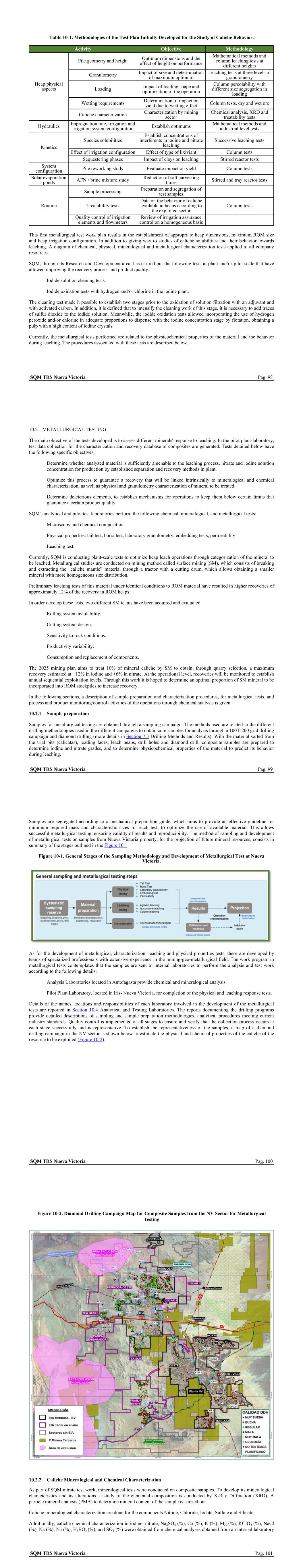 Table 10-1. Methodologies of the Test Plan Initially Developed for the Study of Caliche Behavior. Activity Objective Methodology Heap physical aspects Pile geometry and height Optimum dimensions and the effect of height on performance Mathematical methods and column leaching tests at different heights Granulometry Impact of size and determination of maximum optimum Leaching tests at three levels of granulometry Loading Impact of loading shape and optimization of the operation Column percolability with different size segregation in loading Wetting requirements Determination of impact on yield due to wetting effect Column tests, dry and wet ore Caliche characterization Characterization by mining sector Chemical analysis, XRD and treatability tests Hydraulics Impregnation rate, irrigation and irrigation system configuration Establish optimums Mathematical methods and industrial level tests Kinetics Species solubilities Establish concentrations of interferents in iodine and nitrate leaching Successive leaching tests Effect of irrigation configuration Effect of type of lixiviant Column tests Sequestering phases Impact of clays on leaching Stirred reactor tests System configuration Pile reworking study Evaluate impact on yield Column tests Solar evaporation ponds AFN / brine mixture study Reduction of salt harvesting times Stirred and tray reactor tests Routine Sample processing Preparation and segregation of test samples Treatability tests Data on the behavior of caliche available in heaps according to the exploited sector Column tests Quality control of irrigation elements and flowmeters Review of irrigation assurance control on a homogeneous basis This first metallurgical test work plan results in the establishment of appropriate heap dimensions, maximum ROM size and heap irrigation configuration. In addition to giving way to studies of caliche solubilities and their behavior towards leaching. A diagram of chemical, physical, mineralogical and metallurgical characterization tests applied to all company resources. SQM, through its Research and Development area, has carried out the following tests at plant and/or pilot scale that have allowed improving the recovery process and product quality: Iodide solution cleaning tests. Iodide oxidation tests with hydrogen and/or chlorine in the iodine plant. The cleaning test made it possible to establish two stages prior to the oxidation of solution filtration with an adjuvant and with activated carbon. In addition, it is defined that to intensify the cleaning work of this stage, it is necessary to add traces of sulfur dioxide to the iodide solution. Meanwhile, the iodide oxidation tests allowed incorporating the use of hydrogen peroxide and/or chlorine in adequate proportions to dispense with the iodine concentration stage by flotation, obtaining a pulp with a high content of iodine crystals. Currently, the metallurgical tests performed are related to the physicochemical properties of the material and the behavior during leaching. The procedures associated with these tests are described below. SQM TRS Nueva Victoria Pag. 98 10.2 METALLURGICAL TESTING The main objective of the tests developed is to assess different minerals' response to leaching. In the pilot plant-laboratory, test data collection for the characterization and recovery database of composites are generated. Tests detailed below have the following specific objectives: Determine whether analyzed material is sufficiently amenable to the leaching process, nitrate and iodine solution concentration for production by established separation and recovery methods in plant. Optimize this process to guarantee a recovery that will be linked intrinsically to mineralogical and chemical characterization, as well as physical and granulometry characterization of mineral to be treated. Determine deleterious elements, to establish mechanisms for operations to keep them below certain limits that guarantee a certain product quality. SQM's analytical and pilot test laboratories perform the following chemical, mineralogical, and metallurgical tests: Microscopy and chemical composition. Physical properties: tail test, borra test, laboratory granulometry, embedding tests, permeability Leaching test. Currently, SQM is conducting plant-scale tests to optimize heap leach operations through categorization of the mineral to be leached. Metallurgical studies are conducted on mining method called surface mining (SM), which consists of breaking and extracting the “caliche mantle” material through a tractor with a cutting drum, which allows obtaining a smaller mineral with more homogeneous size distribution. Preliminary leaching tests of this material under identical conditions to ROM material have resulted in higher recoveries of approximately 12% of the recovery in ROM heaps. In order develop these tests, two different SM teams have been acquired and evaluated: Rolling system availability. Cutting system design. Sensitivity to rock conditions. Productivity variability. Consumption and replacement of components. The 2025 mining plan aims to treat 10% of mineral caliche by SM to obtain, through quarry selection, a maximum recovery estimated at +12% in iodine and +6% in nitrate. At the operational level, recoveries will be monitored to establish annual sequential exploitation levels. Through this work it is hoped to determine an optimal proportion of SM mineral to be incorporated into ROM stockpiles to increase recovery. In the following sections, a description of sample preparation and characterization procedures, for metallurgical tests, and process and product monitoring/control activities of the operations through chemical analysis is given. 10.2.1 Sample preparation Samples for metallurgical testing are obtained through a sampling campaign. The methods used are related to the different drilling methodologies used in the different campaigns to obtain core samples for analysis through a 100T-200 grid drilling campai