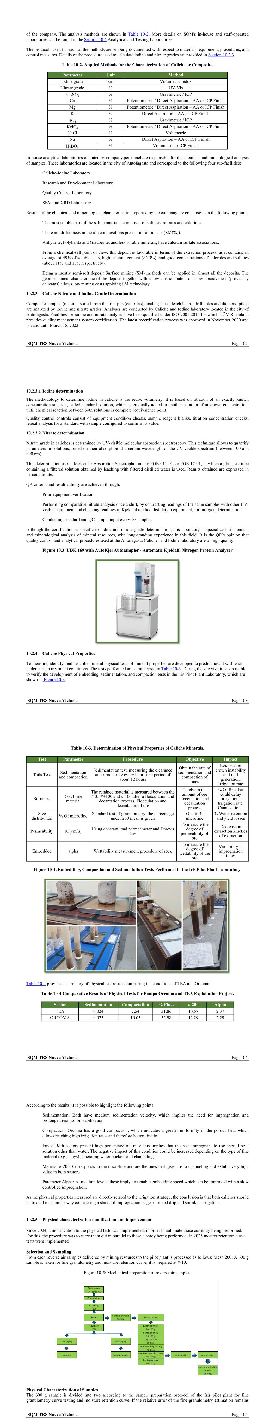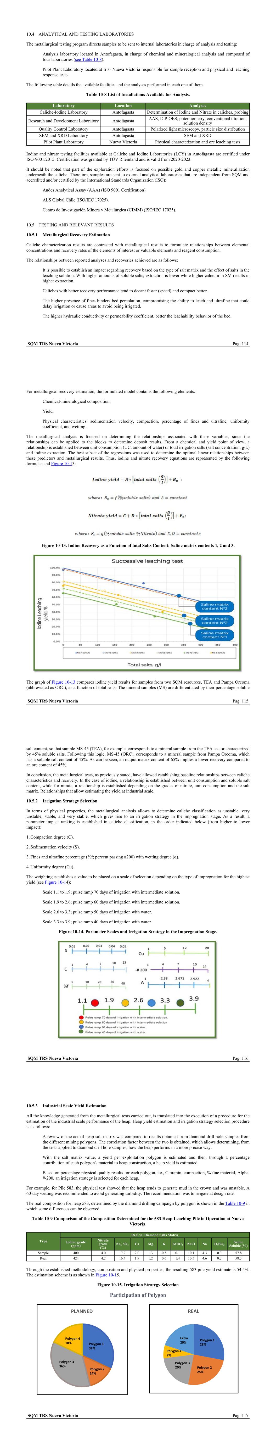 10.4 ANALYTICAL AND TESTING LABORATORIES The metallurgical testing program directs samples to be sent to internal laboratories in charge of analysis and testing: Analysis laboratory located in Antofagasta, in charge of chemical and mineralogical analysis and composed of four laboratories (see Table 10-8). Pilot Plant Laboratory located at Iris- Nueva Victoria responsible for sample reception and physical and leaching response tests. The following table details the available facilities and the analyses performed in each one of them. Table 10-8 List of Installations Available for Analysis. Laboratory Location Analyses Caliche-Iodine Laboratory Antofagasta Determination of Iodine and Nitrate in caliches, probing Research and Development Laboratory Antofagasta AAS, ICP-OES, potentiometry, conventional titration, solution density Quality Control Laboratory Antofagasta Polarized light microscopy, particle size distribution SEM and XRD Laboratory Antofagasta SEM and XRD Pilot Plant Laboratory Nueva Victoria Physical characterization and ore leaching tests Iodine and nitrate testing facilities available at Caliche and Iodine Laboratories (LCY) in Antofagasta are certified under ISO-9001:2015. Certification was granted by TÜV Rheinland and is valid from 2020-2023. It should be noted that part of the exploration efforts is focused on possible gold and copper metallic mineralization underneath the caliche. Therefore, samples are sent to external analytical laboratories that are independent from SQM and accredited and/or certified by the International Standards Organization (ISO): Andes Analytical Assay (AAA) (ISO 9001 Certification). ALS Global Chile (ISO/IEC 17025). Centro de Investigación Minera y Metalúrgica (CIMM) (ISO/IEC 17025). 10.5 TESTING AND RELEVANT RESULTS 10.5.1 Metallurgical Recovery Estimation Caliche characterization results are contrasted with metallurgical results to formulate relationships between elemental concentrations and recovery rates of the elements of interest or valuable elements and reagent consumption. The relationships between reported analyses and recoveries achieved are as follows: It is possible to establish an impact regarding recovery based on the type of salt matrix and the effect of salts in the leaching solution. With higher amounts of soluble salts, extraction is lower while higher calcium in SM results in higher extraction. Caliches with better recovery performance tend to decant faster (speed) and compact better. The higher presence of fines hinders bed percolation, compromising the ability to leach and ultrafine that could delay irrigation or cause areas to avoid being irrigated. The higher hydraulic conductivity or permeability coefficient, better the leachability behavior of the bed. SQM TRS Nueva Victoria Pag. 114 For metallurgical recovery estimation, the formulated model contains the following elements: Chemical-mineralogical composition. Yield. Physical characteristics: sedimentation velocity, compaction, percentage of fines and ultrafine, uniformity coefficient, and wetting. The metallurgical analysis is focused on determining the relationships associated with these variables, since the relationships can be applied to the blocks to determine deposit results. From a chemical and yield point of view, a relationship is established between unit consumption (UC, amount of water) or total irrigation salts (salt concentration, g/L) and iodine extraction. The best subset of the regressions was used to determine the optimal linear relationships between these predictors and metallurgical results. Thus, iodine and nitrate recovery equations are represented by the following formulas and Figure 10-13: Figure 10-13. Iodine Recovery as a Function of total Salts Content: Saline matrix contents 1, 2 and 3. The graph of Figure 10-13 compares iodine yield results for samples from two SQM resources, TEA and Pampa Orcoma (abbreviated as ORC), as a function of total salts. The mineral samples (MS) are differentiated by their percentage soluble SQM TRS Nueva Victoria Pag. 115 salt content, so that sample MS-45 (TEA), for example, corresponds to a mineral sample from the TEA sector characterized by 45% soluble salts. Following this logic, MS-45 (ORC), corresponds to a mineral sample from Pampa Orcoma, which has a soluble salt content of 45%. As can be seen, an output matrix content of 65% implies a lower recovery compared to an ore content of 45%. In conclusion, the metallurgical tests, as previously stated, have allowed establishing baseline relationships between caliche characteristics and recovery. In the case of iodine, a relationship is established between unit consumption and soluble salt content, while for nitrate, a relationship is established depending on the grades of nitrate, unit consumption and the salt matrix. Relationships that allow estimating the yield at industrial scale. 10.5.2 Irrigation Strategy Selection In terms of physical properties, the metallurgical analysis allows to determine caliche classification as unstable, very unstable, stable, and very stable, which gives rise to an irrigation strategy in the impregnation stage. As a result, a parameter impact ranking is established in caliche classification, in the order indicated below (from higher to lower impact): 1. Compaction degree (C). 2. Sedimentation velocity (S). 3. Fines and ultrafine percentage (%f; percent passing #200) with wetting degree (α). 4. Uniformity degree (Cu). The weighting establishes a value to be placed on a scale of selection depending on the type of impregnation for the highest yield (see Figure 10-14): Scale 1.1 to 1.9; pulse ramp 70 days of irrigation with intermediate solution. Scale 1.9 to 2.6; pulse ramp 60 days of irrigation with intermediate solution. Scale 2.6 to 3.3; pulse ramp 50 days of irrigation with water. Scale 3.3 to 3.9; pulse ramp 40 days of irrigation with water. Figure 10-14. Parameter Scales and Irrigation Strategy in the Impregnation Stage. SQM TRS 