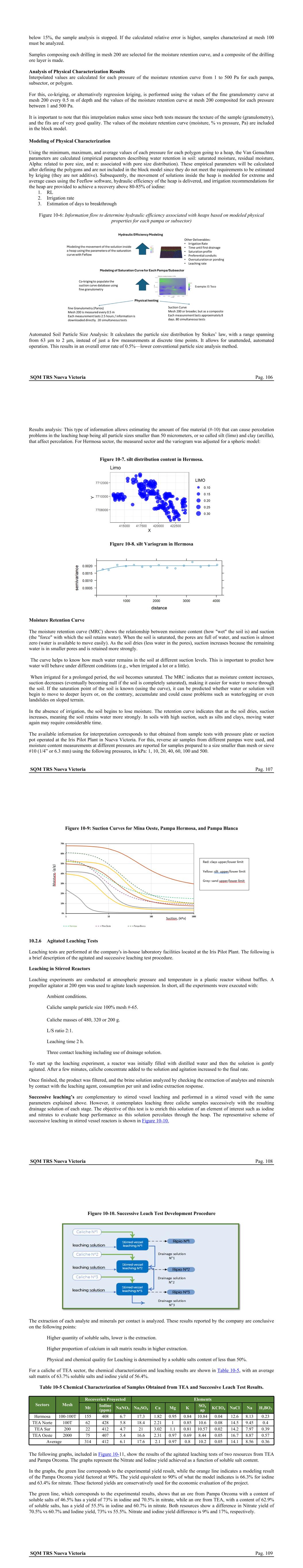 below 15%, the sample analysis is stopped. If the calculated relative error is higher, samples characterized at mesh 100 must be analyzed. Samples composing each drilling in mesh 200 are selected for the moisture retention curve, and a composite of the drilling ore layer is made. Analysis of Physical Characterization Results Interpolated values are calculated for each pressure of the moisture retention curve from 1 to 500 Pa for each pampa, subsector, or polygon. For this, co-kriging, or alternatively regression kriging, is performed using the values of the fine granulometry curve at mesh 200 every 0.5 m of depth and the values of the moisture retention curve at mesh 200 composited for each pressure between 1 and 500 Pa. It is important to note that this interpolation makes sense since both tests measure the texture of the sample (granulometry), and the fits are of very good quality. The values of the moisture retention curve (moisture, % vs pressure, Pa) are included in the block model. Modeling of Physical Characterization Using the minimum, maximum, and average values of each pressure for each polygon going to a heap, the Van Genuchten parameters are calculated (empirical parameters describing water retention in soil: saturated moisture, residual moisture, Alpha: related to pore size, and n: associated with pore size distribution). These empirical parameters will be calculated after defining the polygons and are not included in the block model since they do not meet the requirements to be estimated by kriging (they are not additive). Subsequently, the movement of solutions inside the heap is modeled for extreme and average cases using the Feeflow software, hydraulic efficiency of the heap is delivered, and irrigation recommendations for the heap are provided to achieve a recovery above 80-85% of iodine: 1. RL 2. Irrigation rate 3. Estimation of days to breakthrough Figure 10-6: Information flow to determine hydraulic efficiency associated with heaps based on modeled physical properties for each pampa or subsector) Automated Soil Particle Size Analysis: It calculates the particle size distribution by Stokes’ law, with a range spanning from 63 μm to 2 μm, instead of just a few measurements at discrete time points. It allows for unattended, automated operation. This results in an overall error rate of 0.5%—lower conventional particle size analysis method. SQM TRS Nueva Victoria Pag. 106 Results analysis: This type of information allows estimating the amount of fine material (#-10) that can cause percolation problems in the leaching heap being all particle sizes smaller than 50 micrometers, or so called silt (limo) and clay (arcilla), that affect percolation. For Hermosa sector, the measured sector and the variogram was adjusted for a spheric model: Figure 10-7. silt distribution content in Hermosa. Figure 10-8. silt Variogram in Hermosa Moisture Retention Curve The moisture retention curve (MRC) shows the relationship between moisture content (how "wet" the soil is) and suction (the "force" with which the soil retains water). When the soil is saturated, the pores are full of water, and suction is almost zero (water is available to move easily). As the soil dries (less water in the pores), suction increases because the remaining water is in smaller pores and is retained more strongly. The curve helps to know how much water remains in the soil at different suction levels. This is important to predict how water will behave under different conditions (e.g., when irrigated a lot or a little). When irrigated for a prolonged period, the soil becomes saturated. The MRC indicates that as moisture content increases, suction decreases (eventually becoming null if the soil is completely saturated), making it easier for water to move through the soil. If the saturation point of the soil is known (using the curve), it can be predicted whether water or solution will begin to move to deeper layers or, on the contrary, accumulate and could cause problems such as waterlogging or even landslides on sloped terrain. In the absence of irrigation, the soil begins to lose moisture. The retention curve indicates that as the soil dries, suction increases, meaning the soil retains water more strongly. In soils with high suction, such as silts and clays, moving water again may require considerable time. The available information for interpretation corresponds to that obtained from sample tests with pressure plate or suction pot operated at the Iris Pilot Plant in Nueva Victoria. For this, reverse air samples from different pampas were used, and moisture content measurements at different pressures are reported for samples prepared to a size smaller than mesh or sieve #10 (1/4” or 6.3 mm) using the following pressures, in kPa: 1, 10, 20, 40, 60, 100 and 500. SQM TRS Nueva Victoria Pag. 107 Figure 10-9: Suction Curves for Mina Oeste, Pampa Hermosa, and Pampa Blanca 10.2.6 Agitated Leaching Tests Leaching tests are performed at the company's in-house laboratory facilities located at the Iris Pilot Plant. The following is a brief description of the agitated and successive leaching test procedure. Leaching in Stirred Reactors Leaching experiments are conducted at atmospheric pressure and temperature in a plastic reactor without baffles. A propeller agitator at 200 rpm was used to agitate leach suspension. In short, all the experiments were executed with: Ambient conditions. Caliche sample particle size 100% mesh #-65. Caliche masses of 480, 320 or 200 g. L/S ratio 2:1. Leaching time 2 h. Three contact leaching including use of drainage solution. To start up the leaching experiment, a reactor was initially filled with distilled water and then the solution is gently agitated. After a few minutes, caliche concentrate added to the solution and agitation increased to the final rate. Once finished, the product was filtered, and the brine solution analyzed by checking the extraction of analytes and minerals by contact w